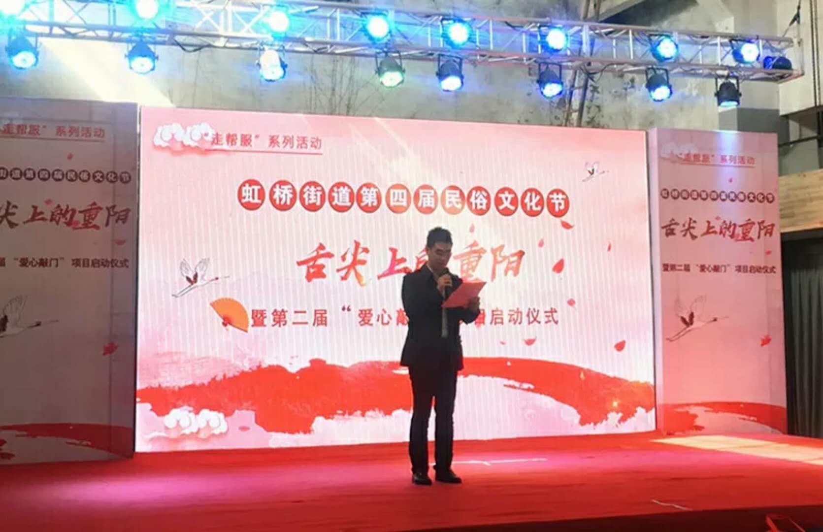 2017年10月24日上午,虹桥街道在回复文化生活空间举办第四届民俗文化节之“舌尖上的重阳”主题活动暨第二届“爱心敲门”公益项目启动仪式。区文新局党组书记、局长张飞、区民政局党组成员姚国泉、区人社局副局长陈丽、区民政局副主任科员尹伟、虹桥街道党工委书记李俊、党工委副书记、办事处主任朱元星出席本次活动,为虹桥辖区老人送上温馨祝福。