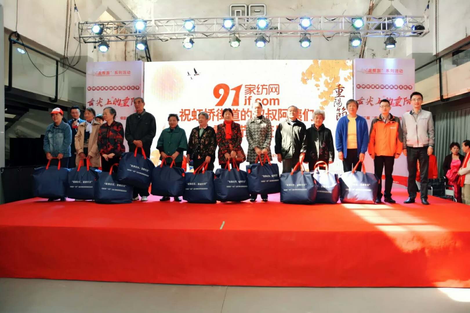 活动在七彩虹志愿艺术团带来的情景表演《红旗颂》中拉开序幕,随后虹桥街道各领导等为虹桥居民代表发放了重阳节礼物,91家纺网“一被子”公益计划为虹桥辖区困难老人代表发放了羽绒被。