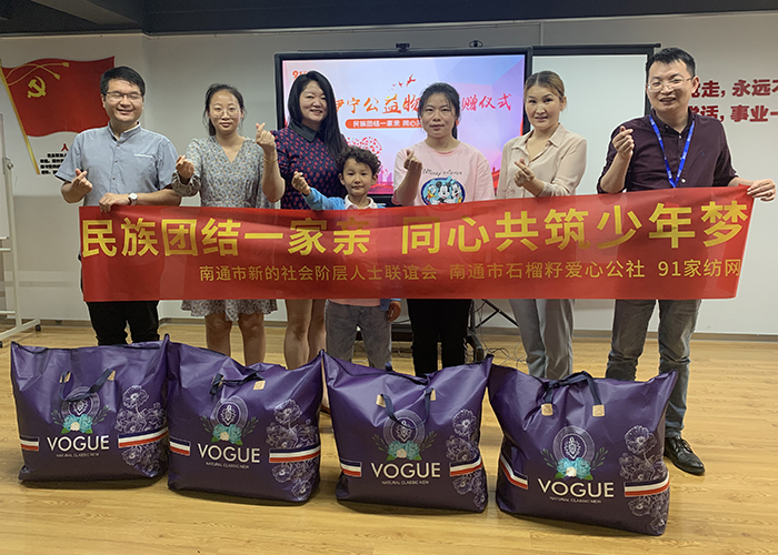 2020年9月19日,“民族团结一家亲,同心共筑少年梦”捐赠仪式在91家纺网举行。此次公益活动得到南通市无党派知识分子联谊会、南通市新的社会阶层联谊会、中国民主促进会南通市委员会以及91家纺网的大力支持,共捐赠200条棉被,用于捐助新疆伊宁的贫困家庭和困境儿童。中共南通市委统战部党派处处长李莽,民进南通经济二支部宣传委员、南通市石榴籽爱心公社创始人黄妹华,91家纺网副总经理沙政共同出席了捐赠仪式。