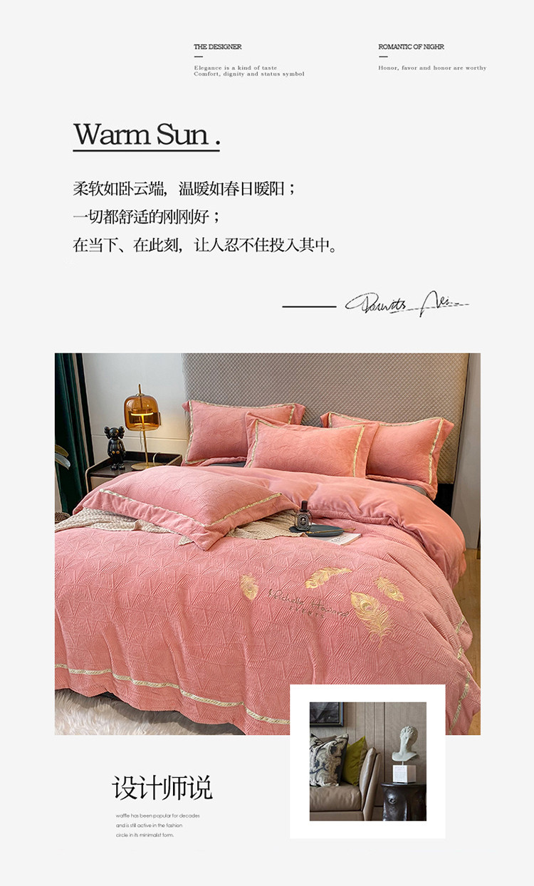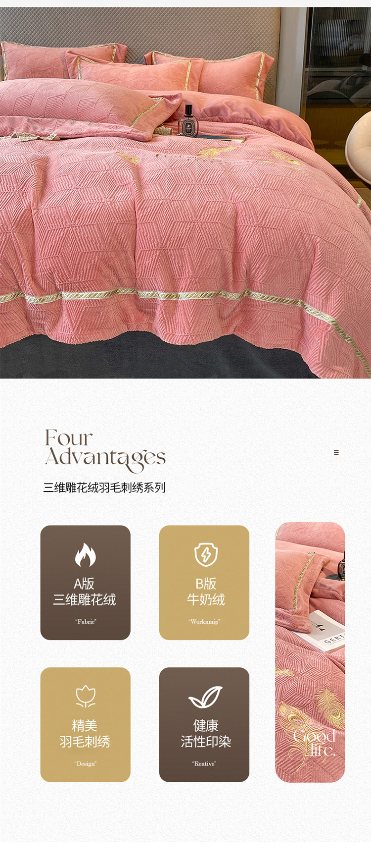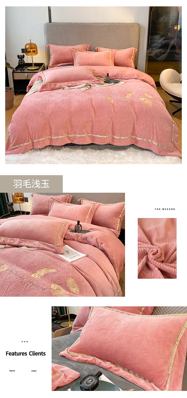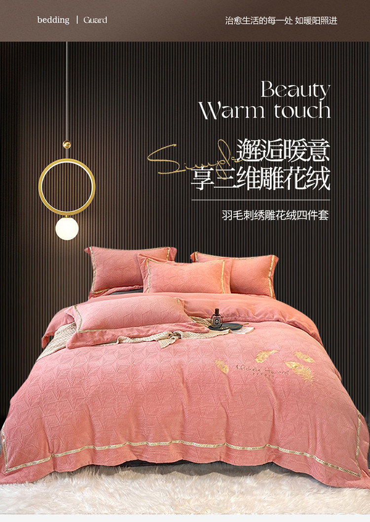 吾秀家居 2022新款羽毛刺绣雕花绒四件套 羽毛浅玉