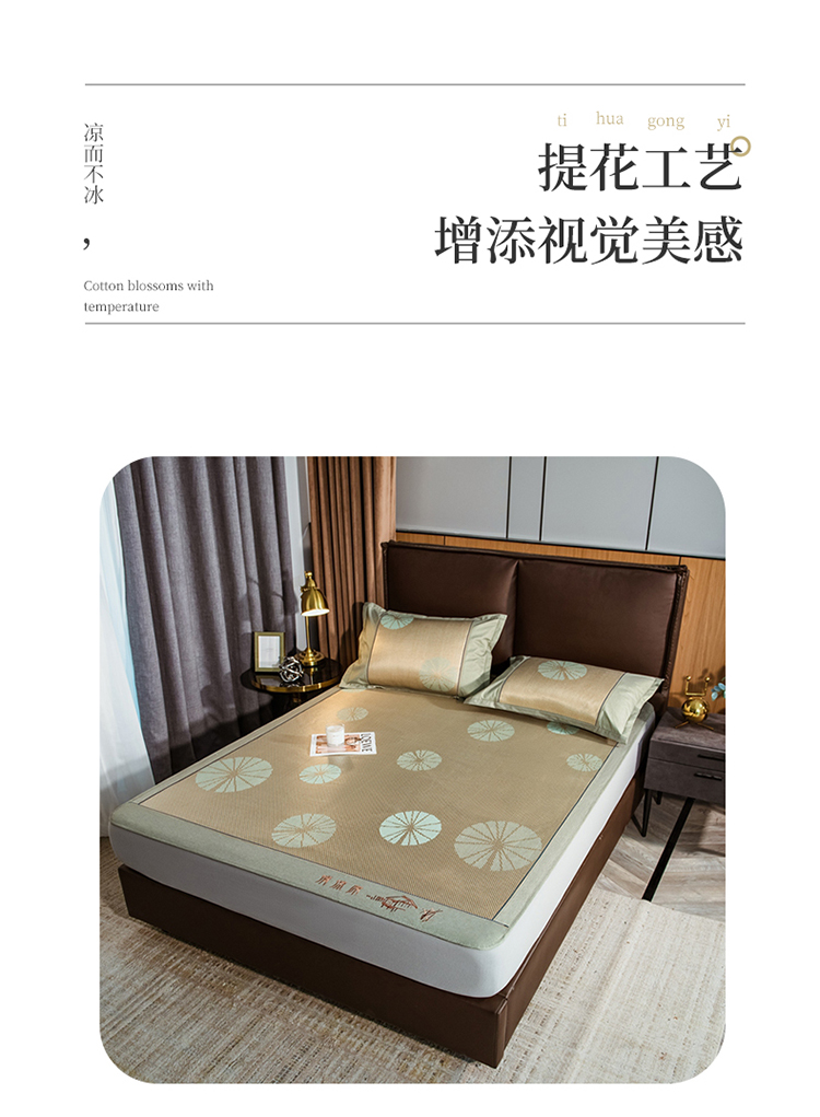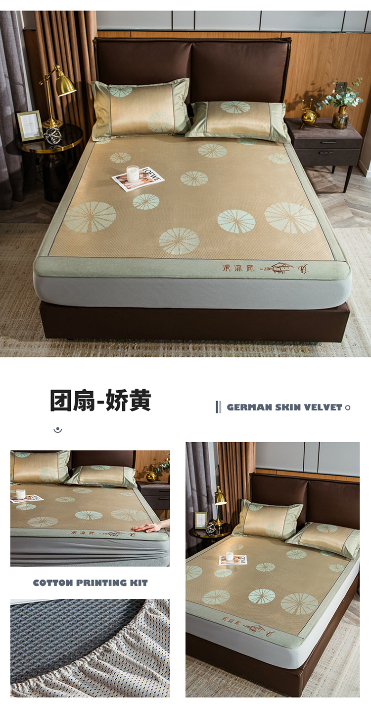商品名称:全季家居 2023新款加厚加密宽边刺绣提花冰藤凉席-床笠款 团扇-娇黄