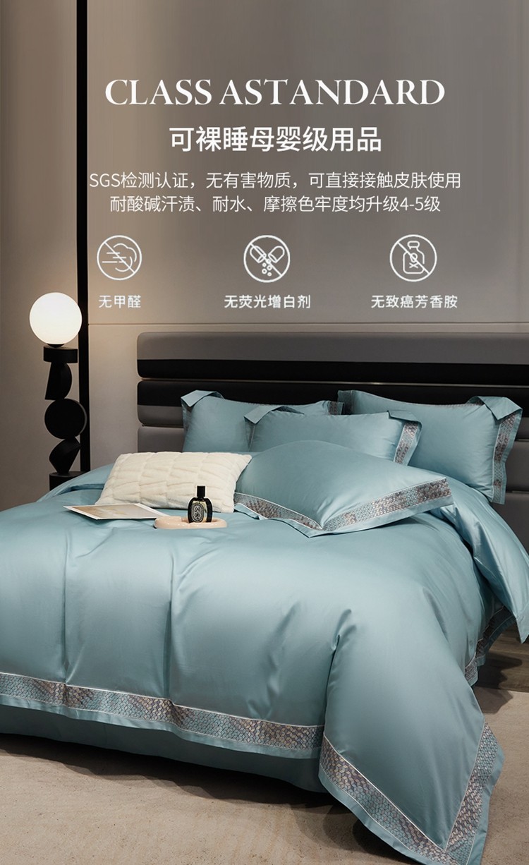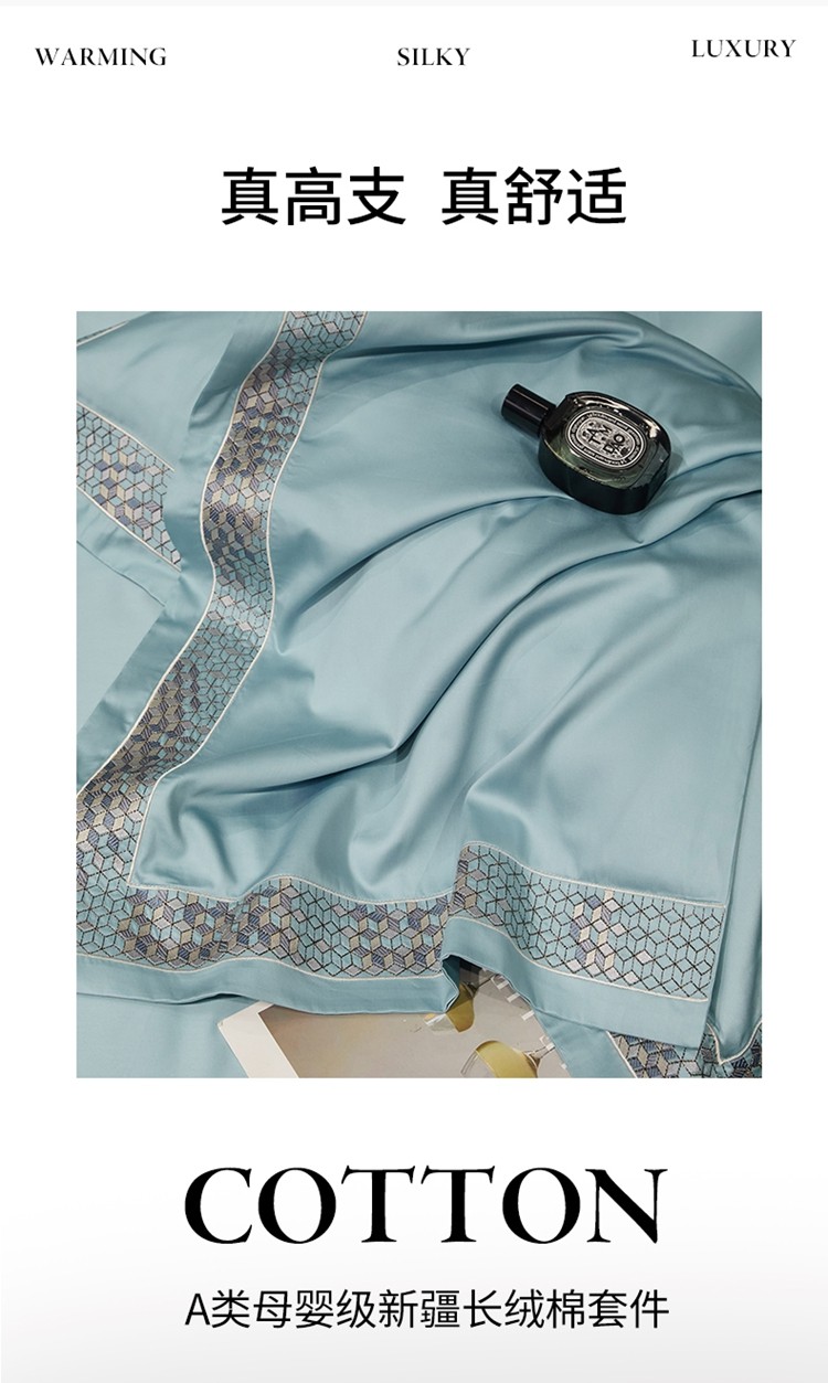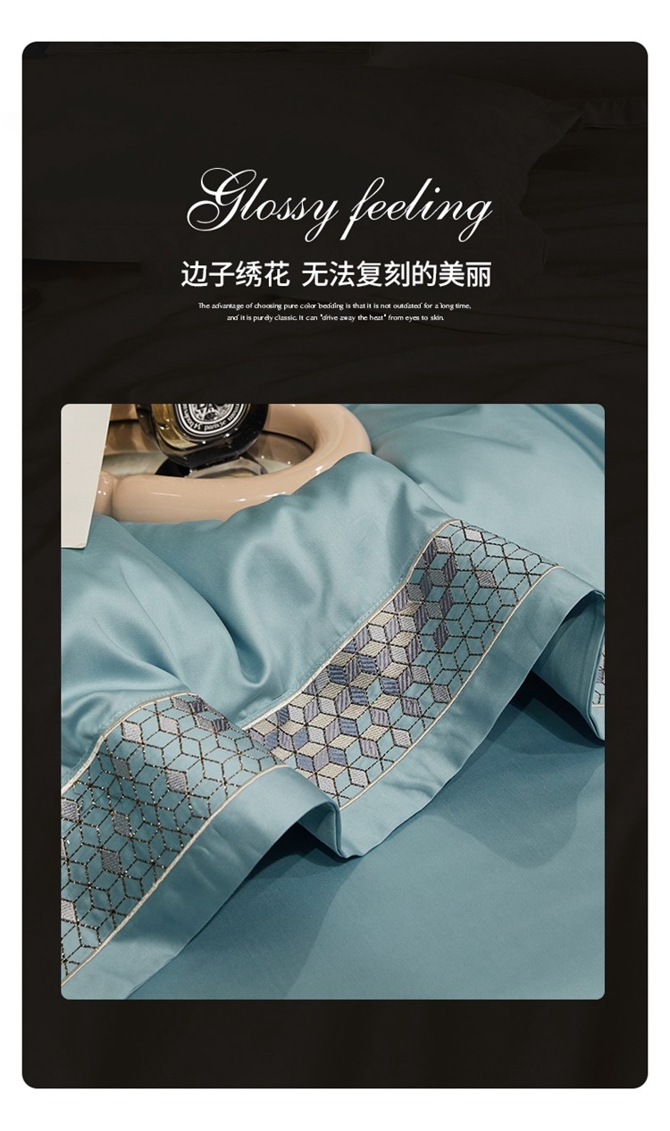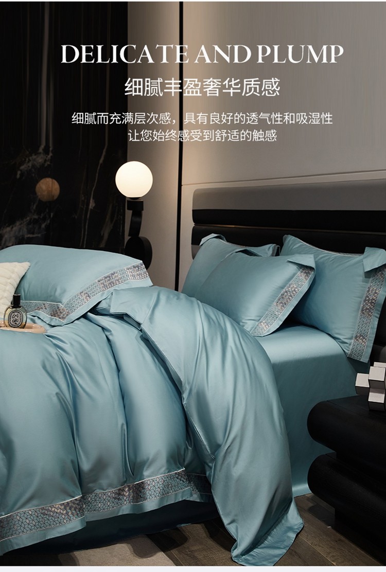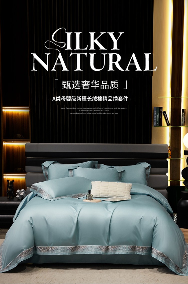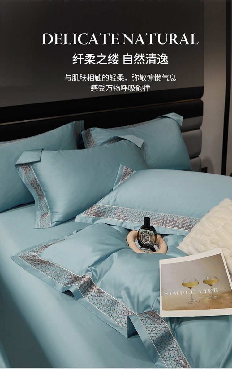 柔觉家纺 天丝刺绣贡缎提花全棉四件套,柔梦-海蓝
