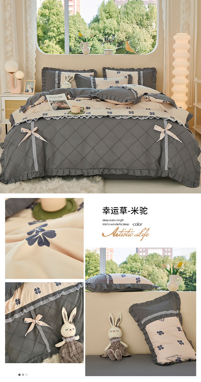 靓生活 2023新款贡棉浪漫花边印花四件套 幸运草-米驼