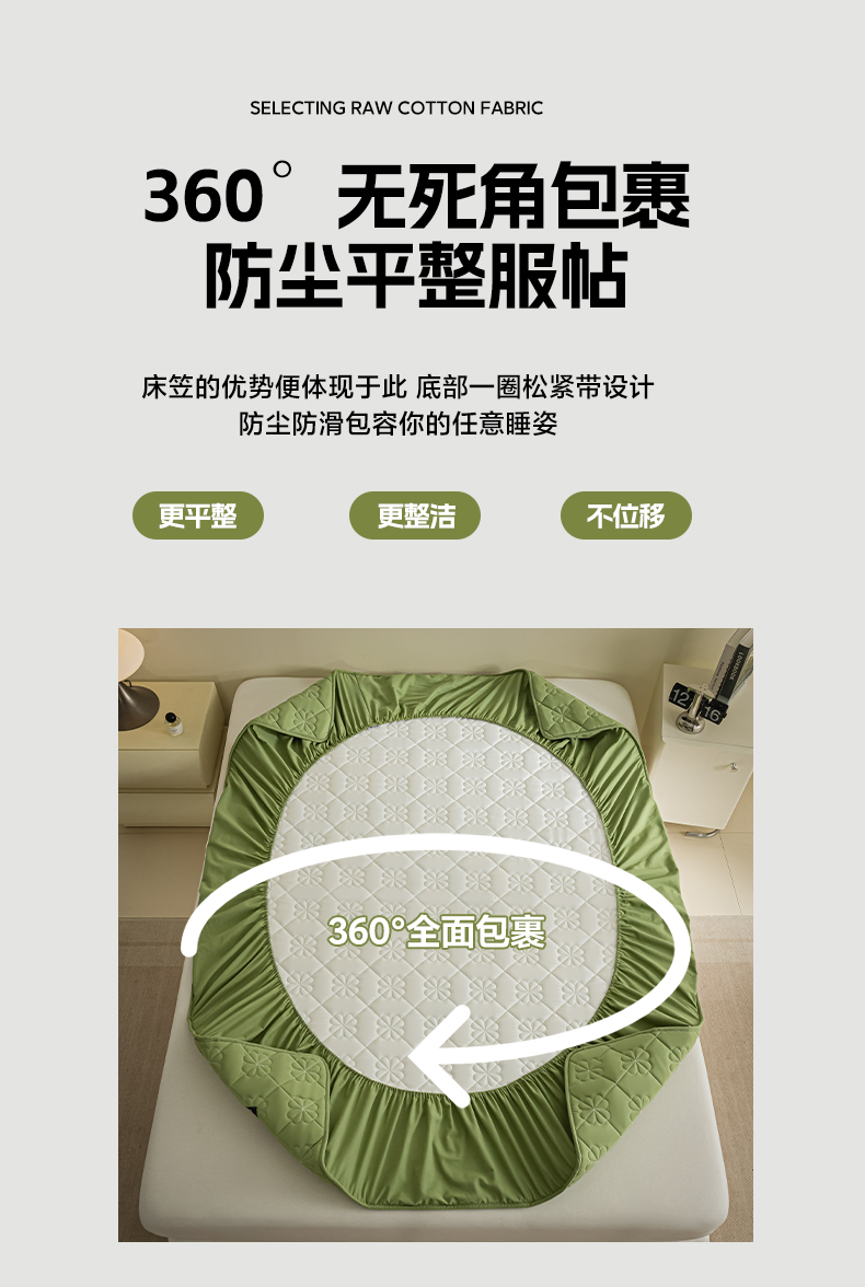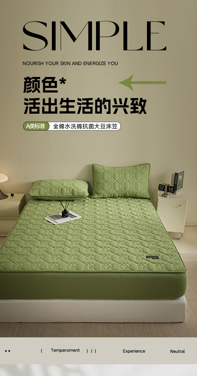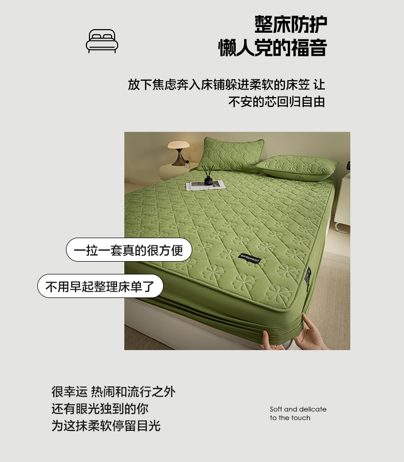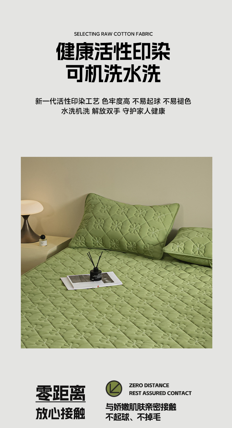 芬晴家纺 2024新款A类全棉水洗棉抗菌床笠夹棉床笠奥兰 奥兰-豆绿