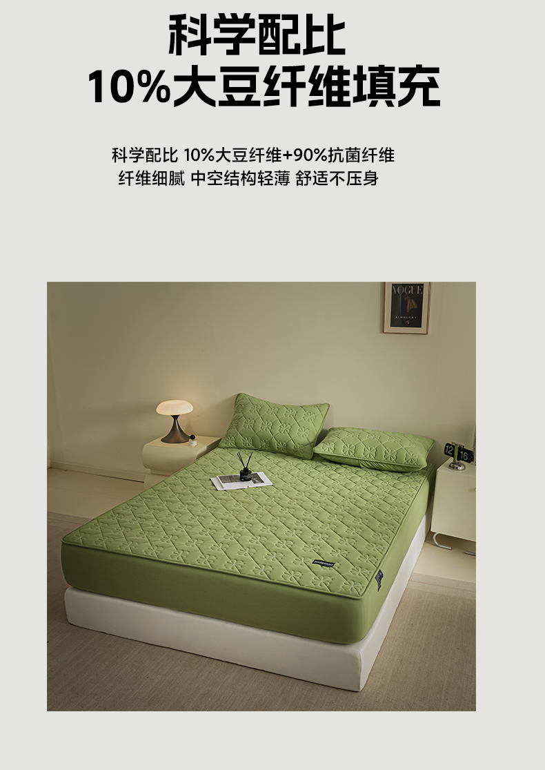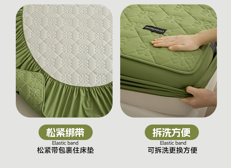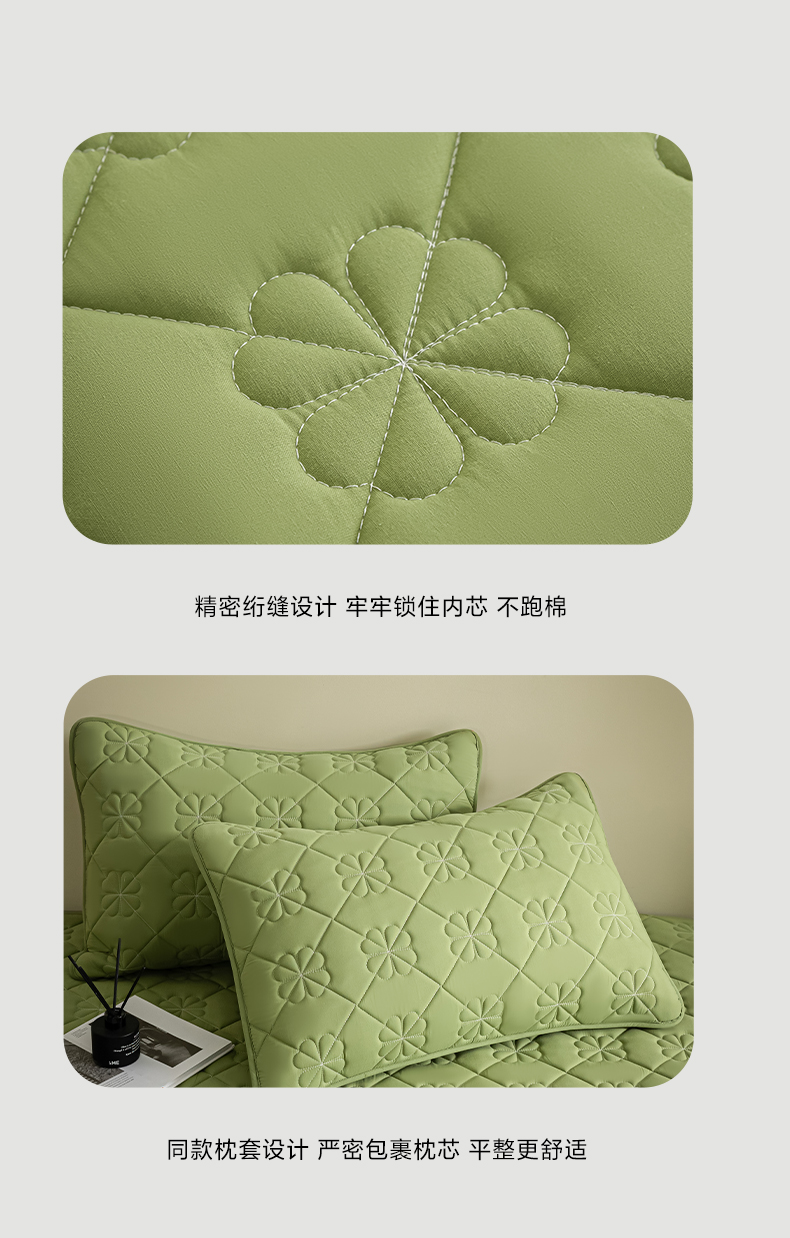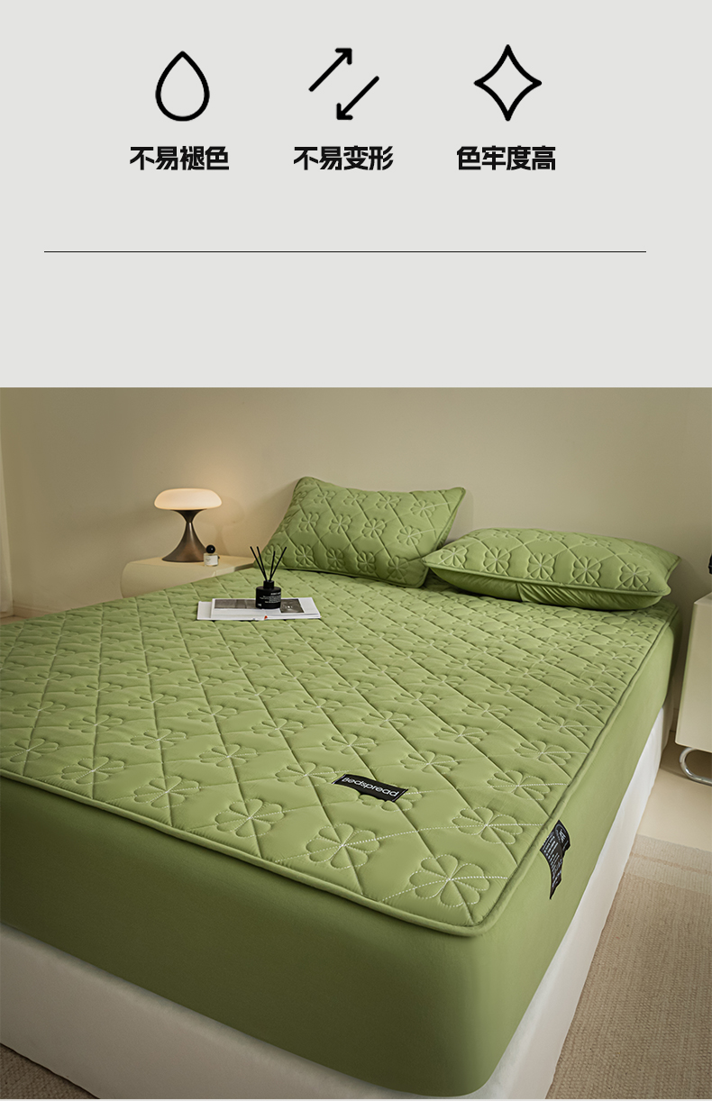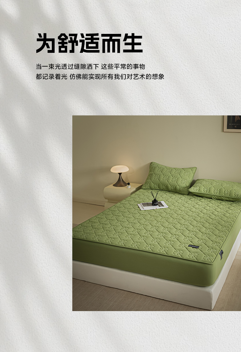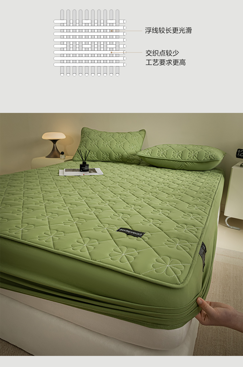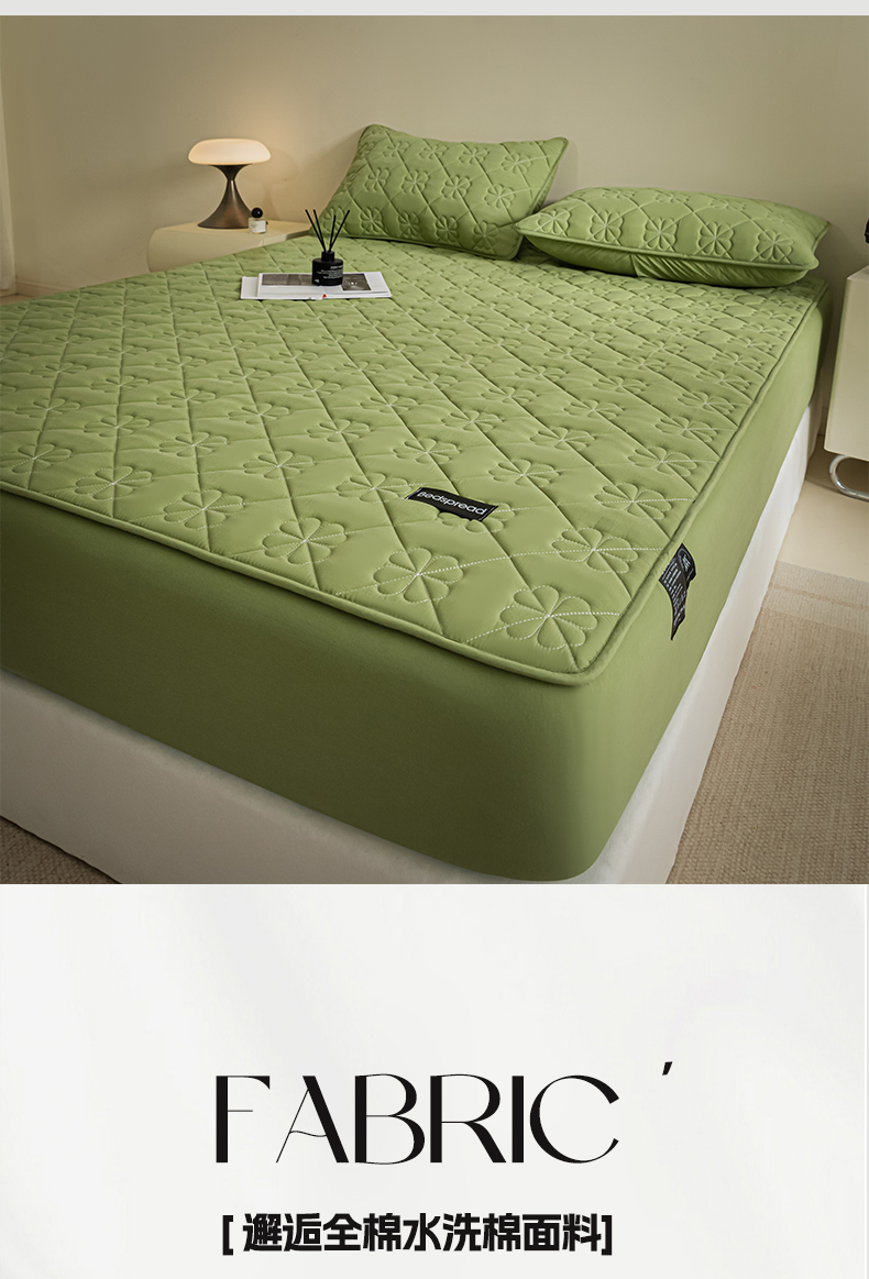 • 91家纺网 家纺一手货源 找家纺 芬晴家纺 2024新款A类全棉水洗棉抗菌床笠夹棉床笠奥兰 奥兰-豆绿