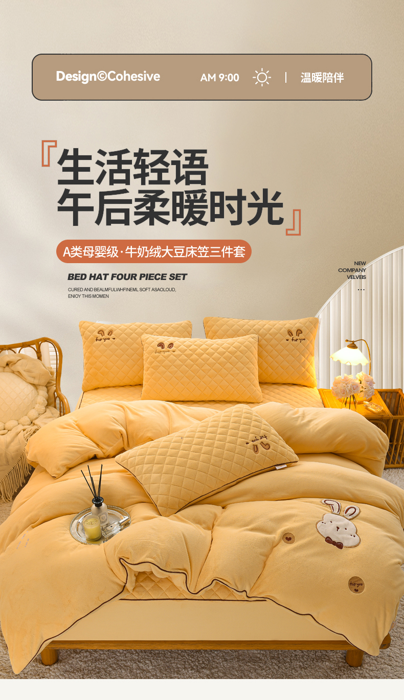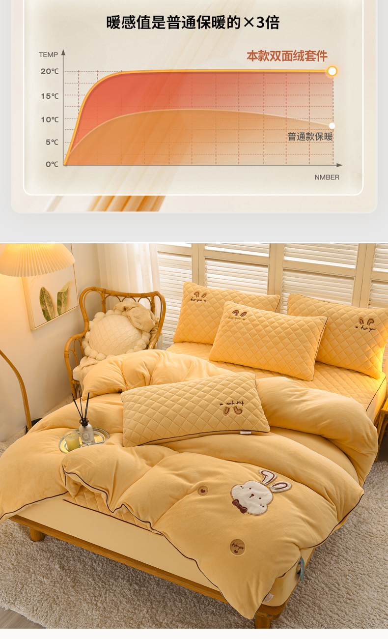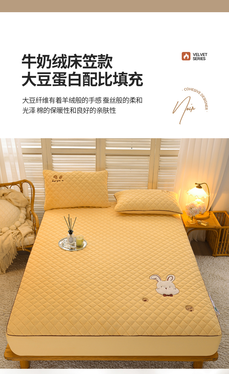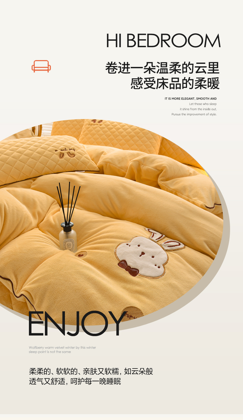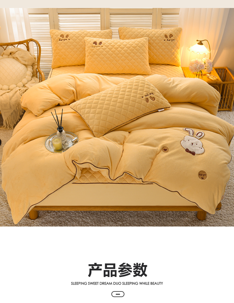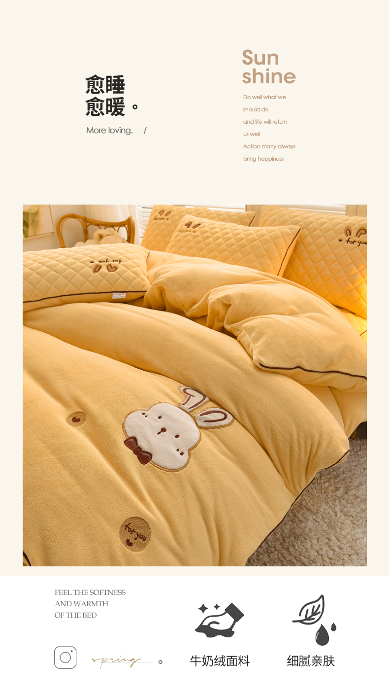 当前位置: 91家纺网 > 商品网购 > 床品套件 > 四件套 > 牛奶绒四件套 > 好眠好梦家纺 2024新款叮当兔牛奶绒绣花床笠款四件套 鹅黄