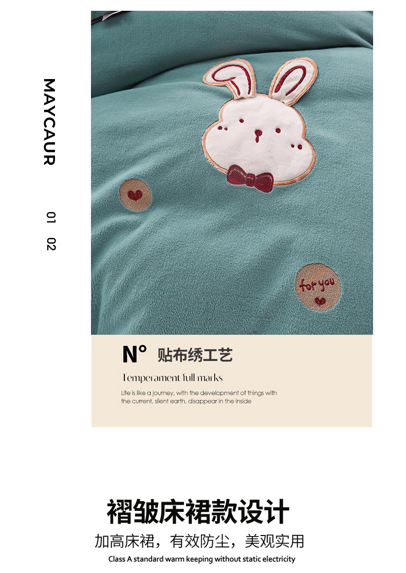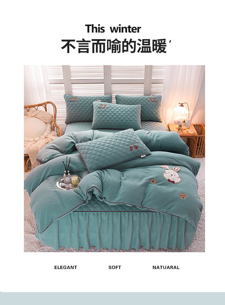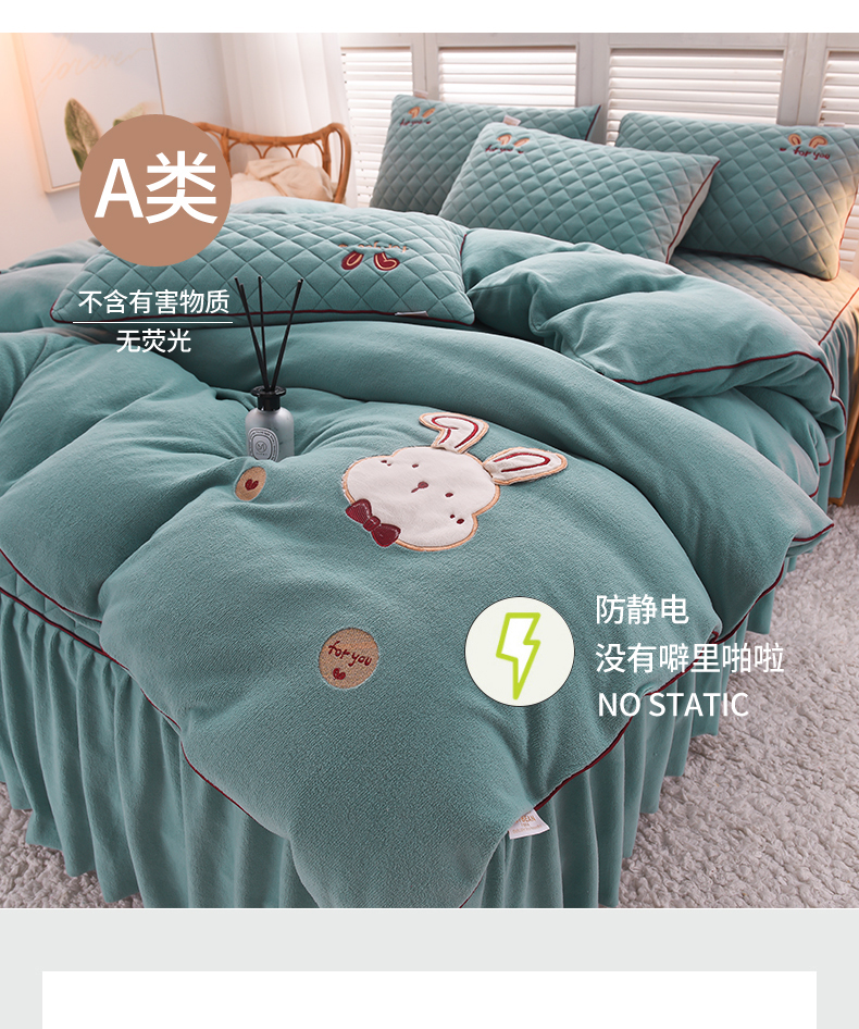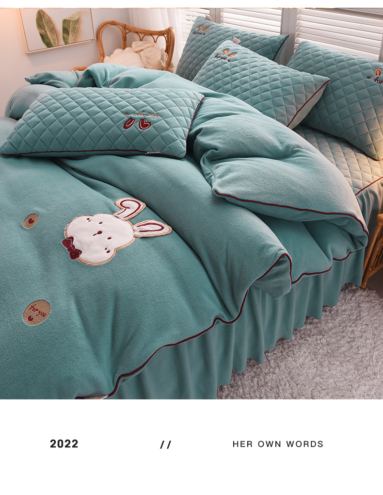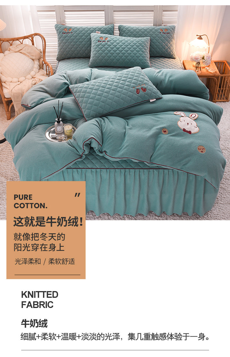 当前位置: 91家纺网 > 商品网购 > 床品套件 > 四件套 > 牛奶绒四件套 > 好眠好梦家纺 2024新款叮当兔牛奶绒绣花床裙款四件套 雾兰