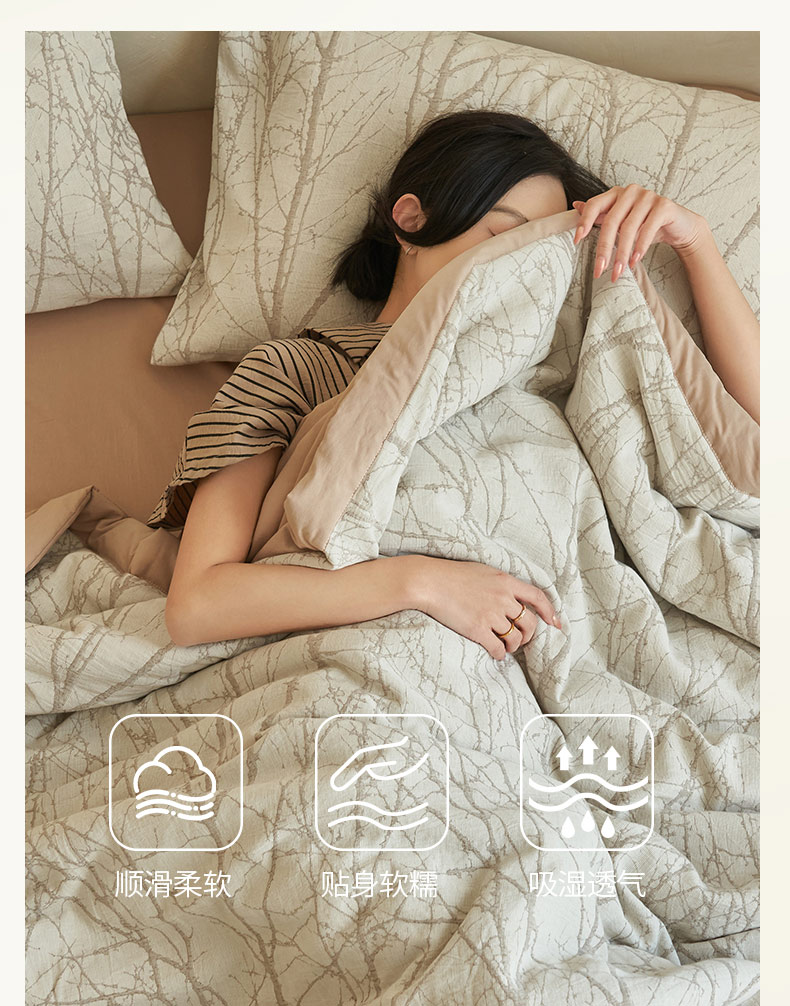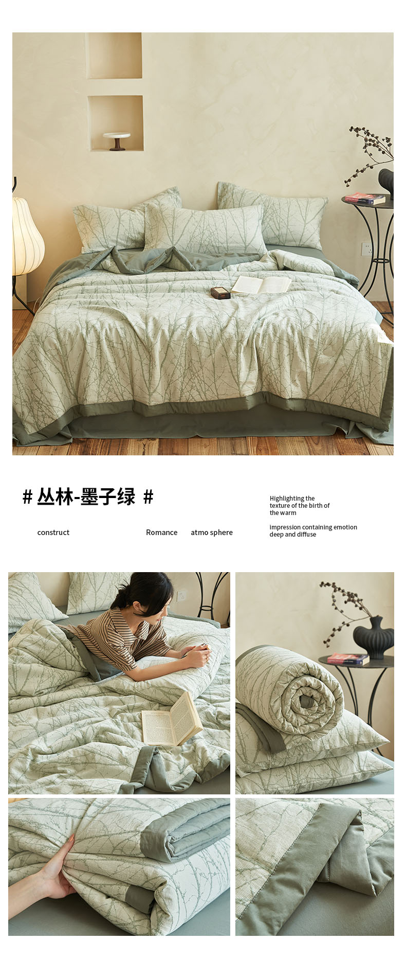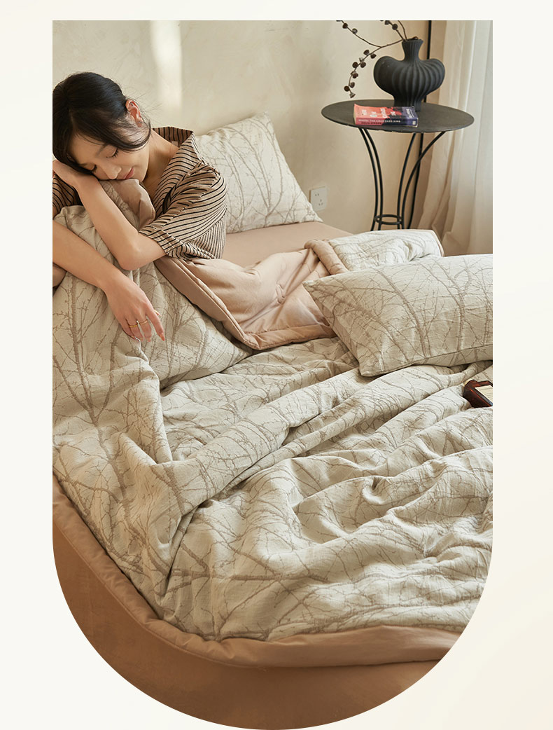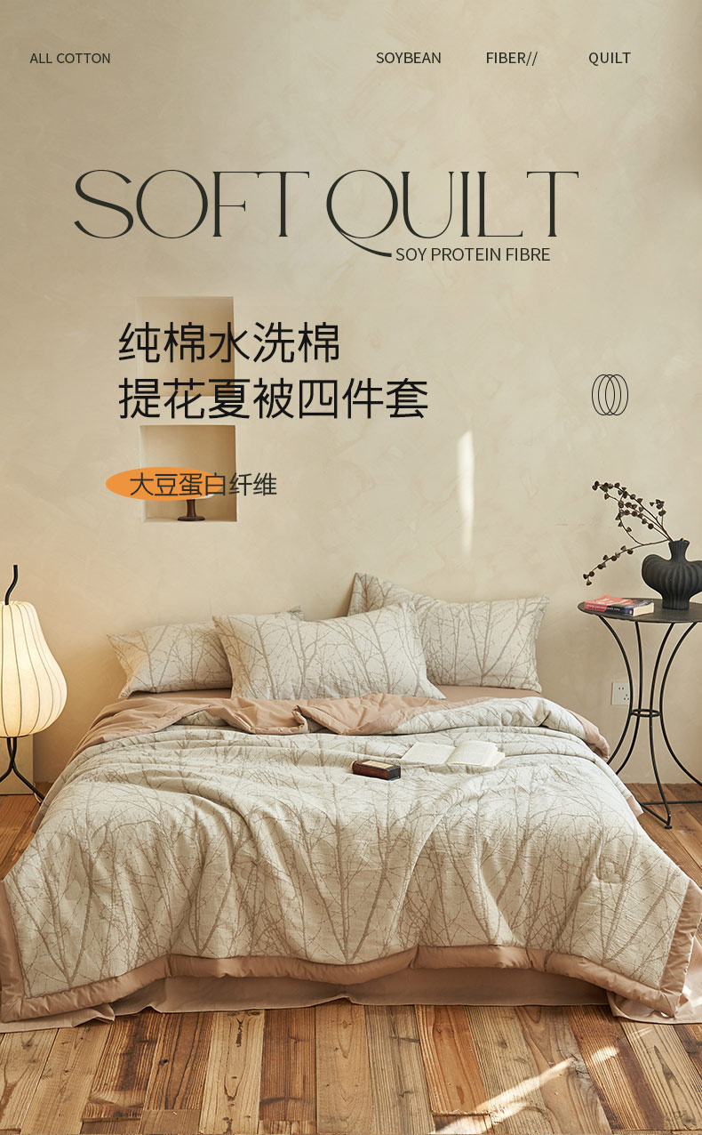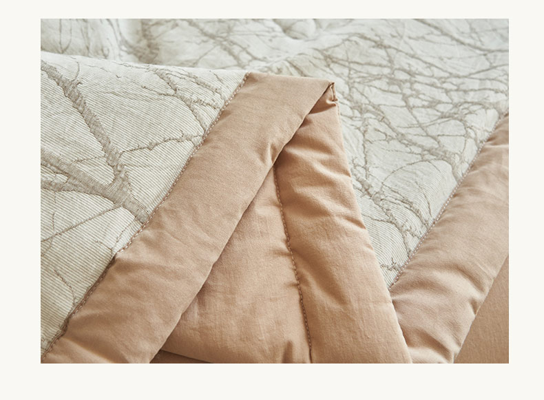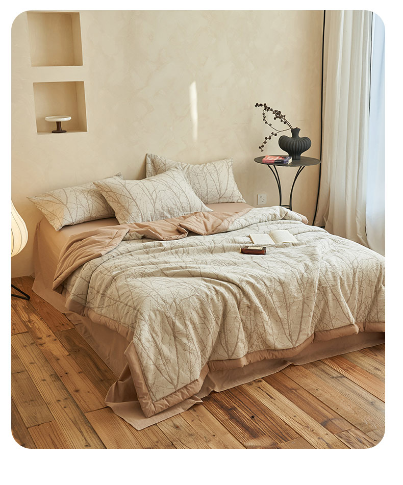 • 91家纺网 家纺一手货源 找家纺 寐绸家纺 2025新款纯棉水洗棉三层丛林提花大豆纤维夏被四件套 丛林-驼色