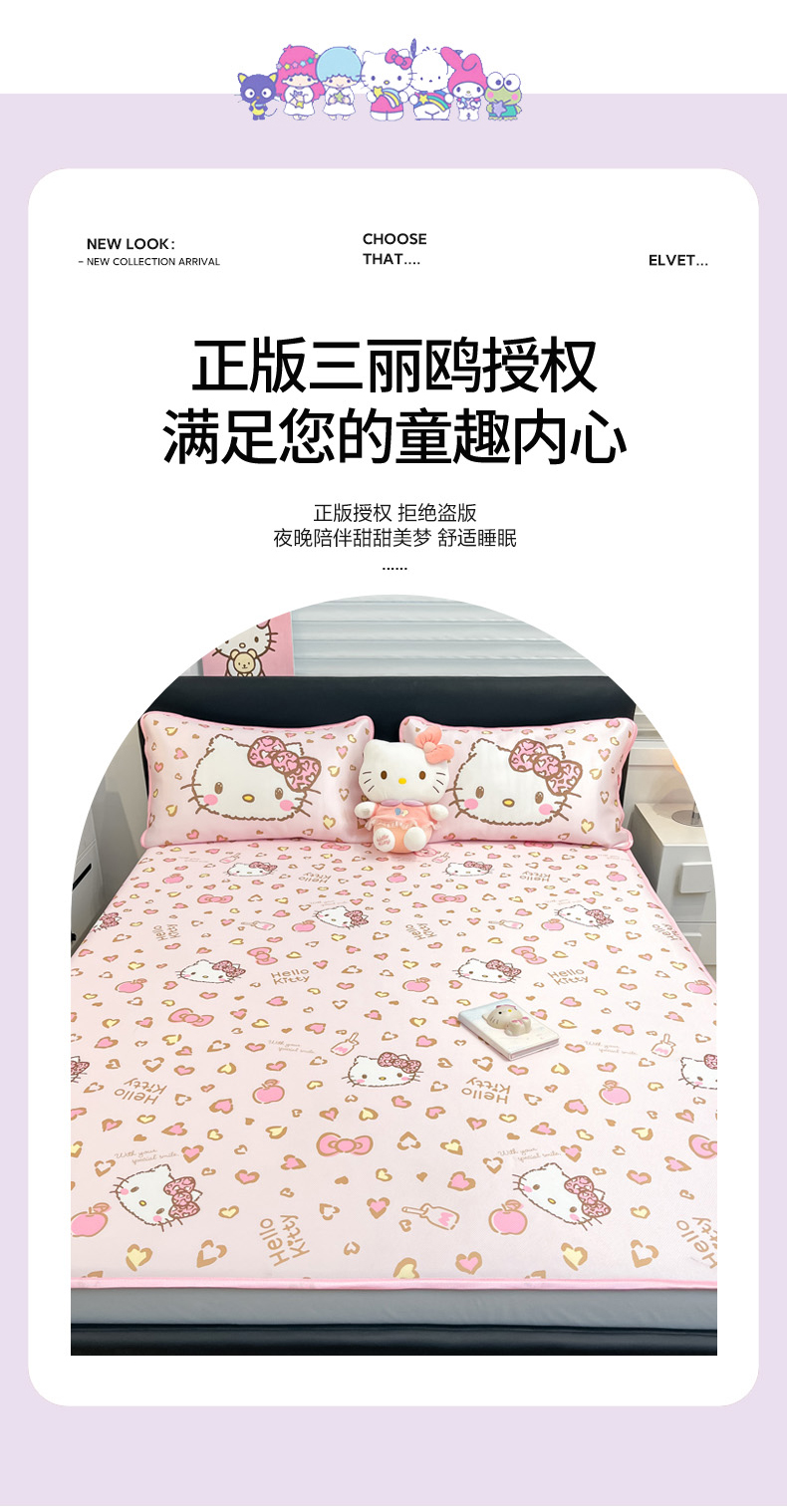 商品名称:暮思家居 2025新款三丽鸥正版授权数码印花A类可机洗1200D冰丝凉席三件套床笠款系列 床笠款-凯蒂乐园