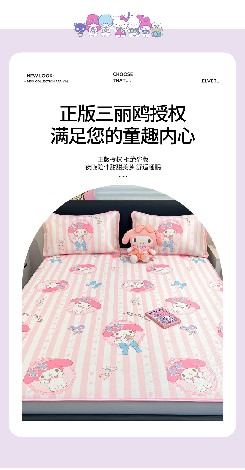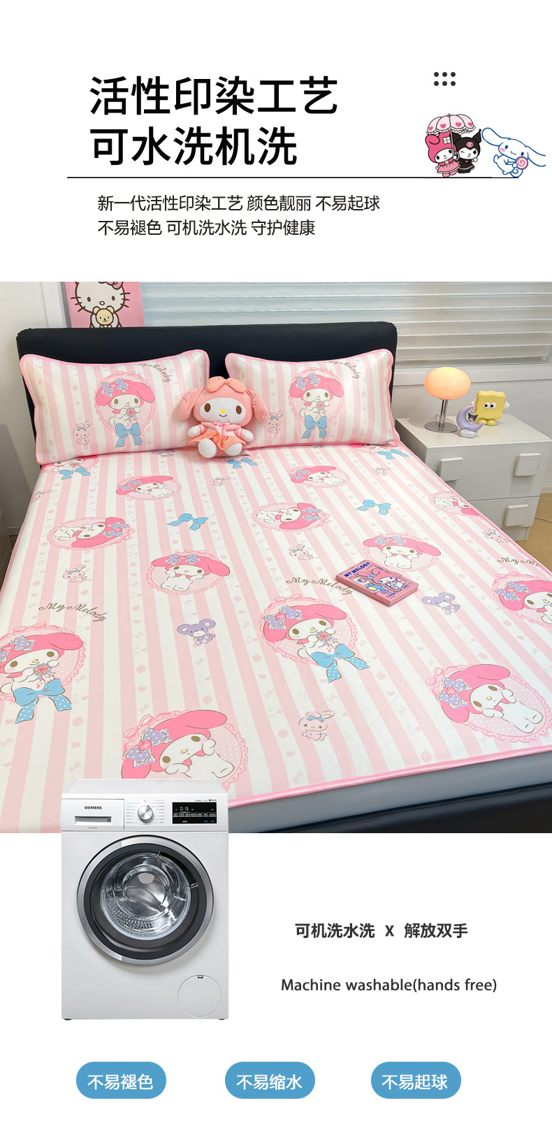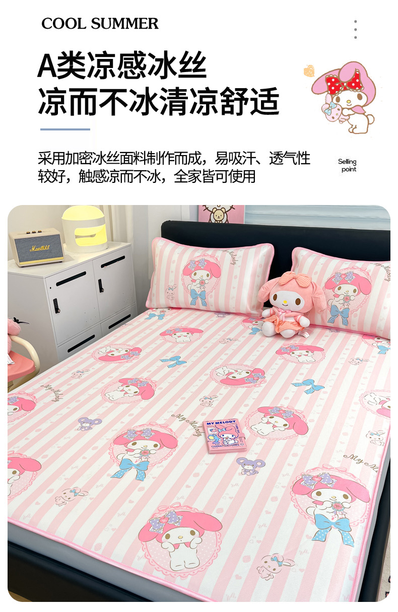 商品名称:暮思家居 2025新款三丽鸥正版授权数码印花A类可机洗1200D冰丝凉席三件套床笠款系列 床笠款-甜心美乐蒂