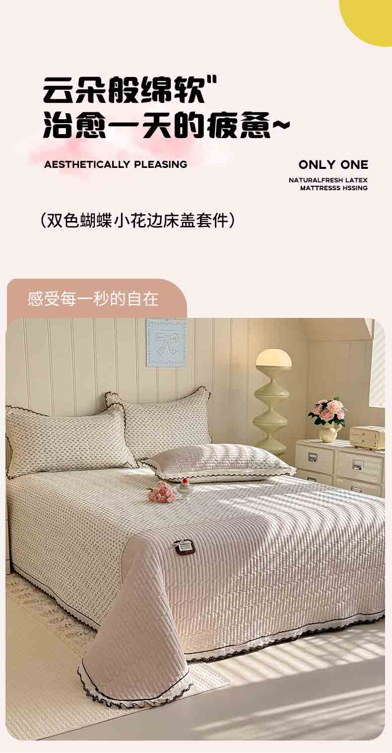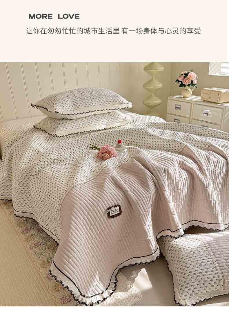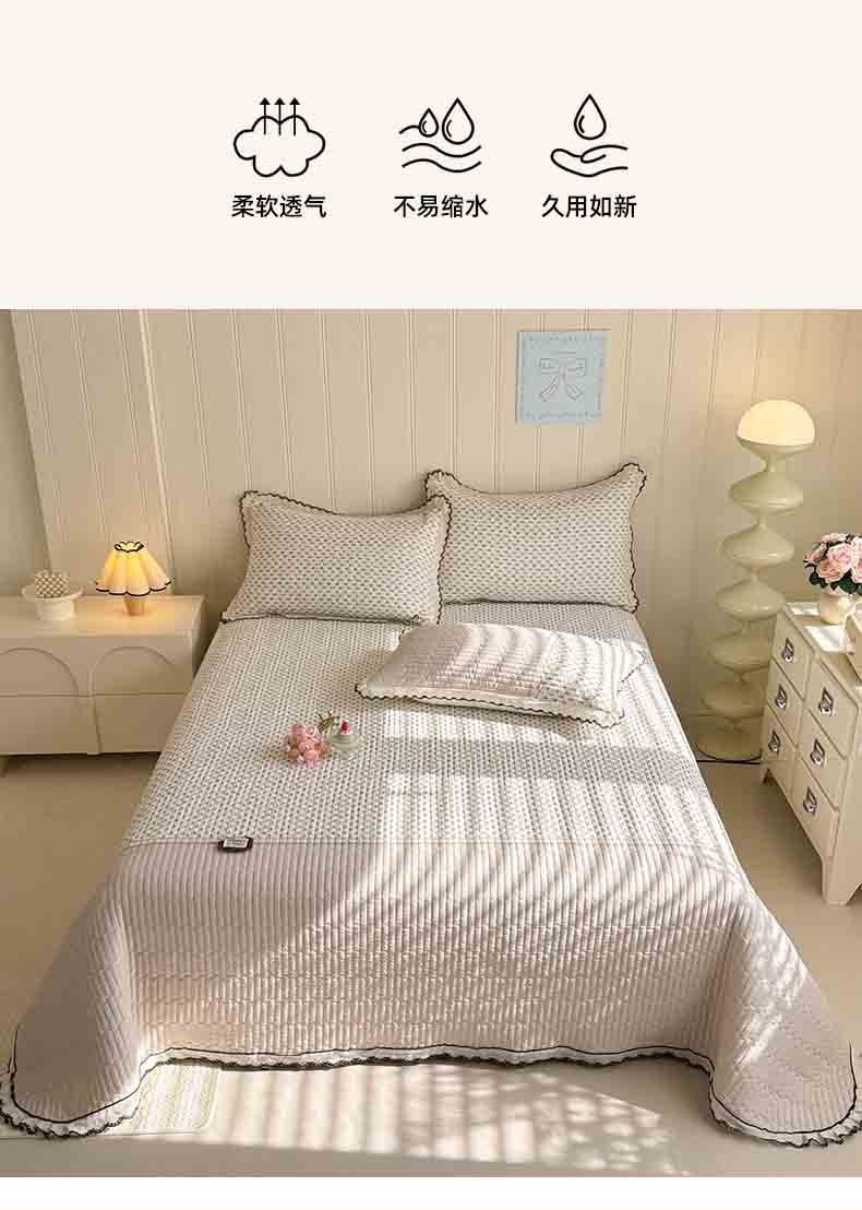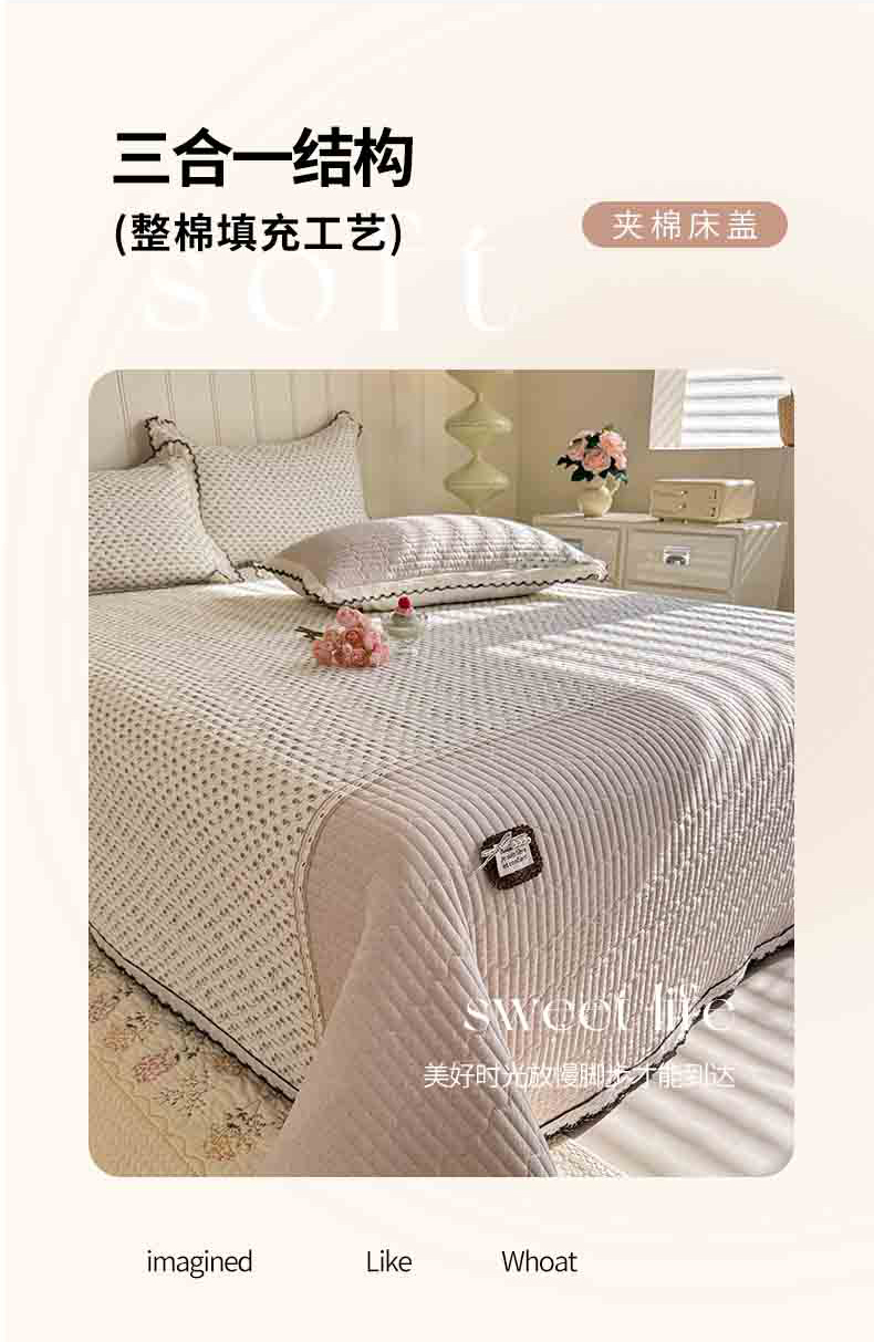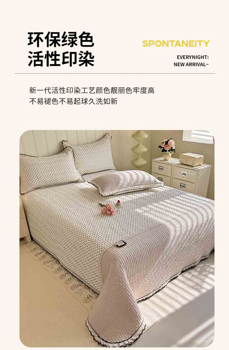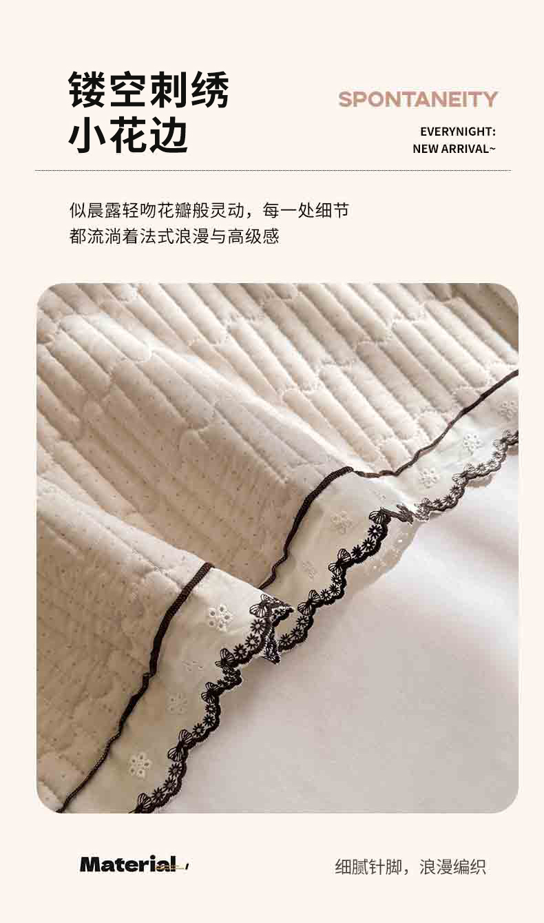 • 91家纺网 家纺一手货源 找家纺 贝凯瑞 2026新款水洗皱皱纱双层纱云朵棉三层夹棉绗绣刺绣小花边单件三件床盖 奶咖碎梦