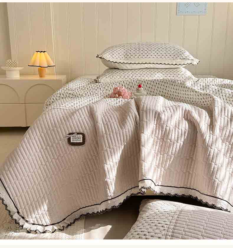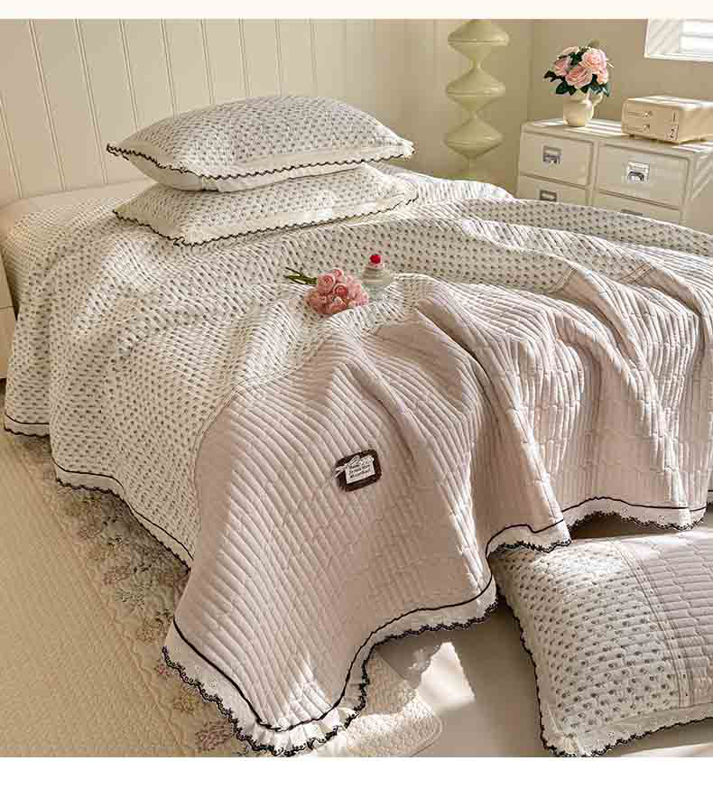 贝凯瑞 2026新款水洗皱皱纱双层纱云朵棉三层夹棉绗绣刺绣小花边单件三件床盖 奶咖碎梦