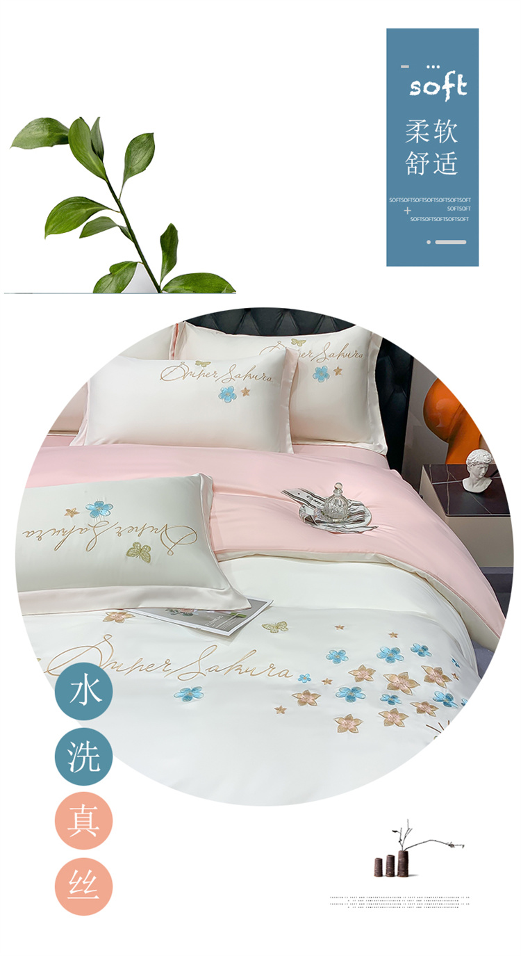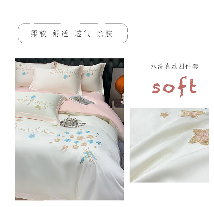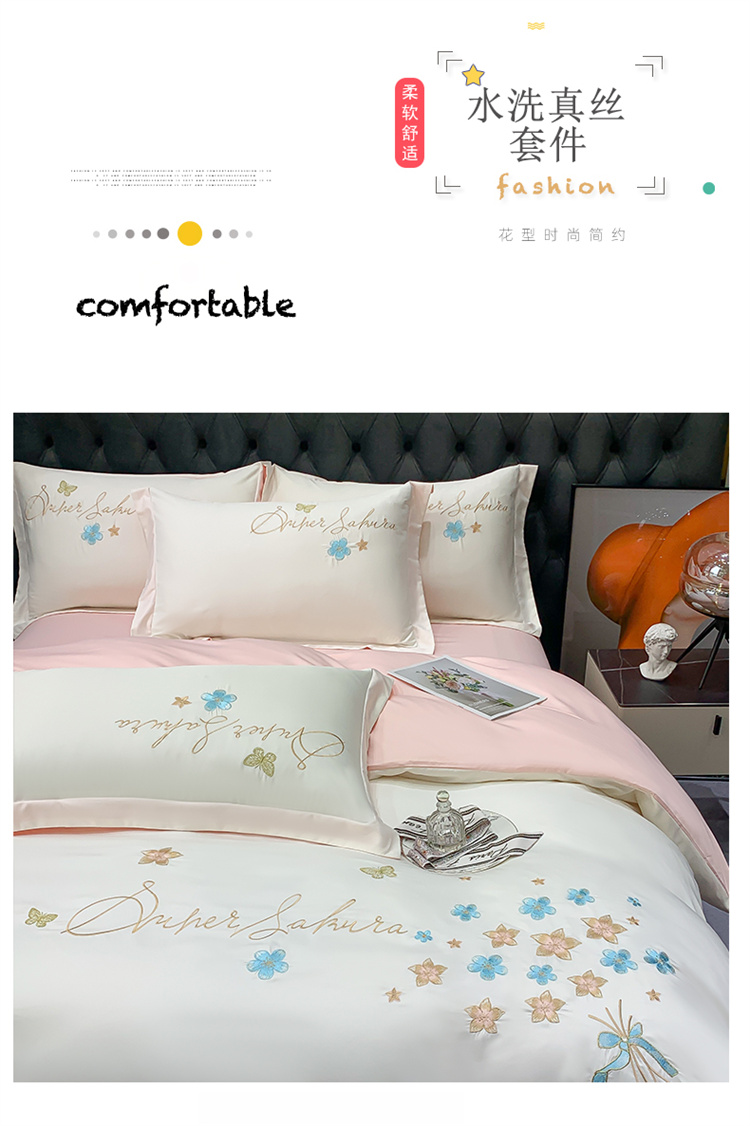 安妮家居 2022新款水洗真丝刺绣四件套-花漾 白色