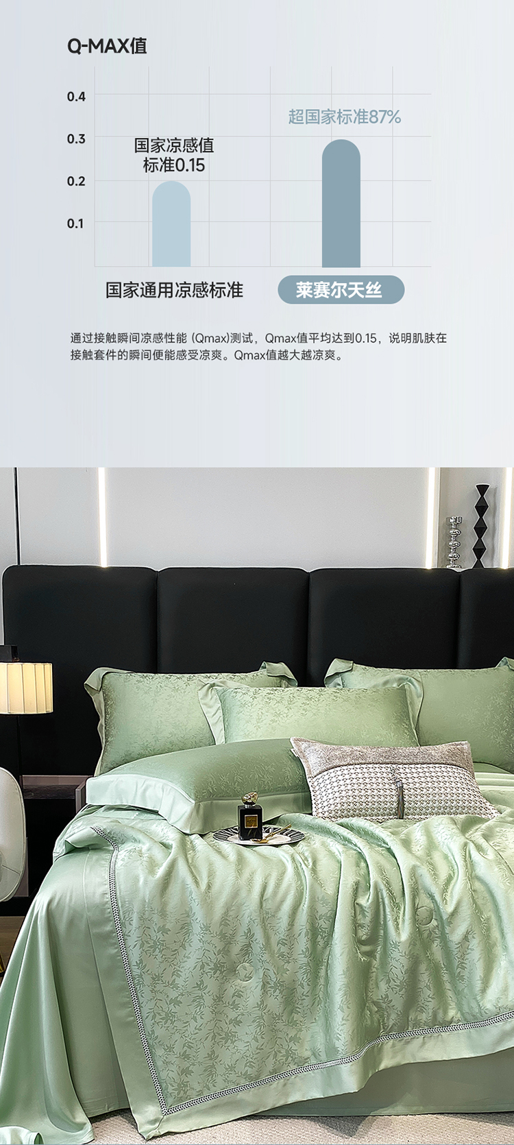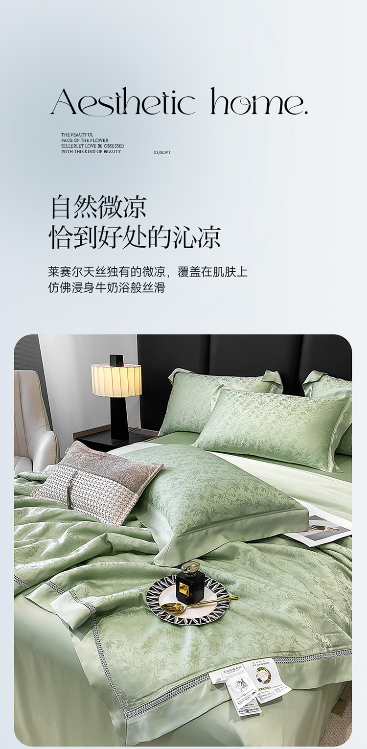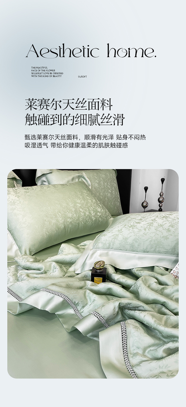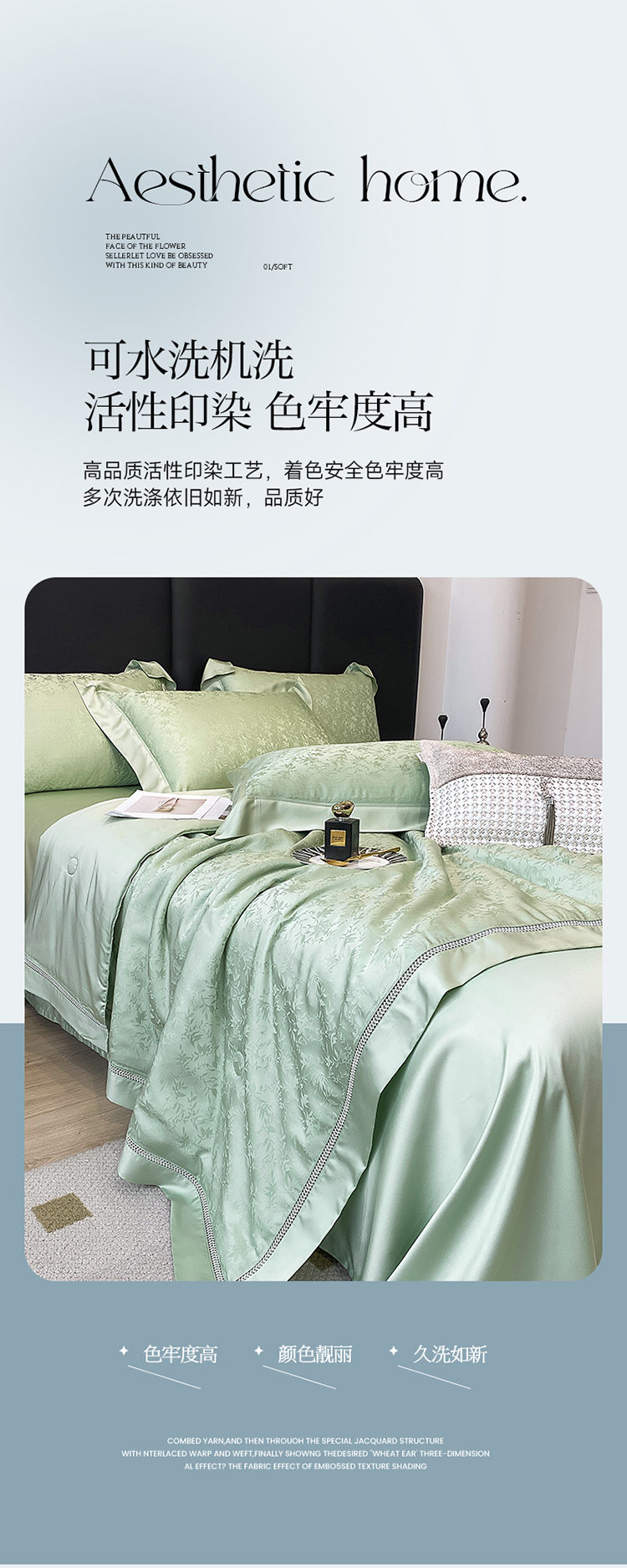 商品名称:娇逸家居 2025新款镂空花边60支天丝提花夏被(专版花型) 凌烟-欧碧绿
