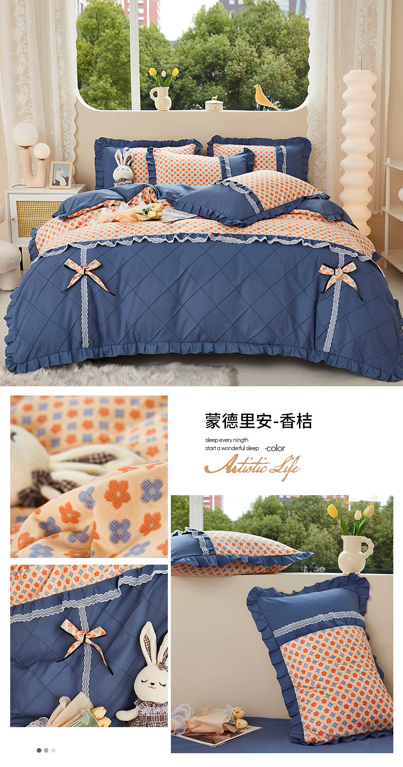商品名称:靓生活 2023新款贡棉浪漫花边印花四件套 蒙德里安-香桔