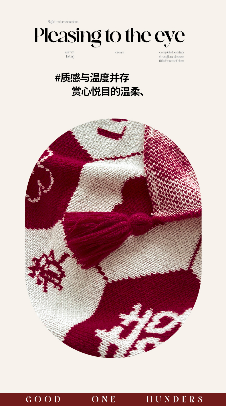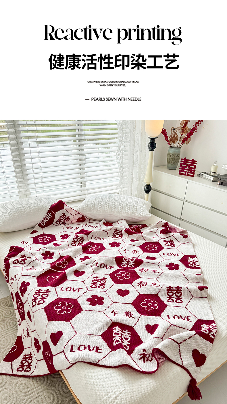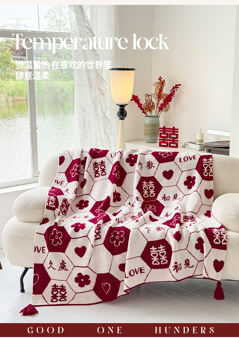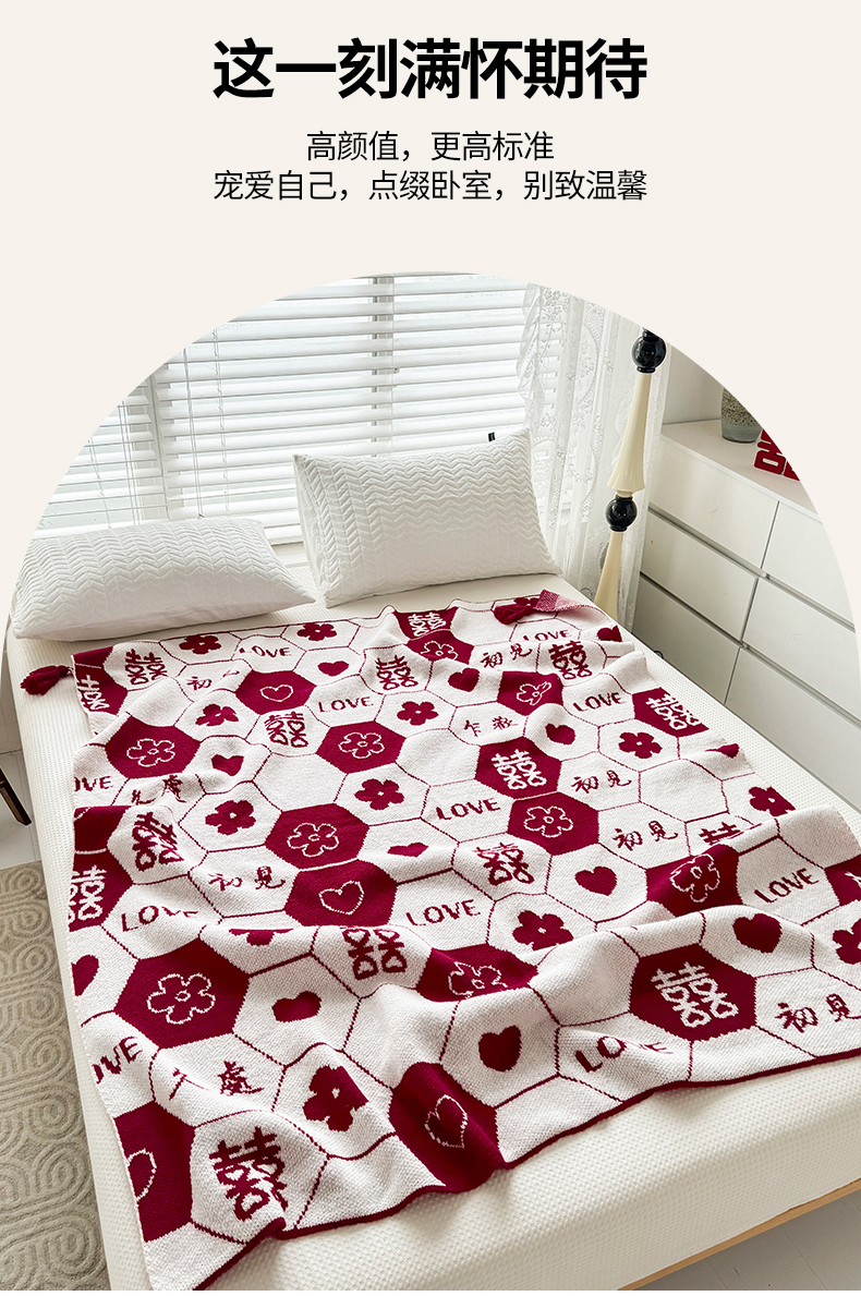 当前位置: 91家纺网 > 商品网购 > 毛毯休闲毯绒毯 > 毛毯 > 栩裕纺织 2024新款中式风高端婚礼喜字毛毯(可定制) 针织喜字-初见红色盖毯