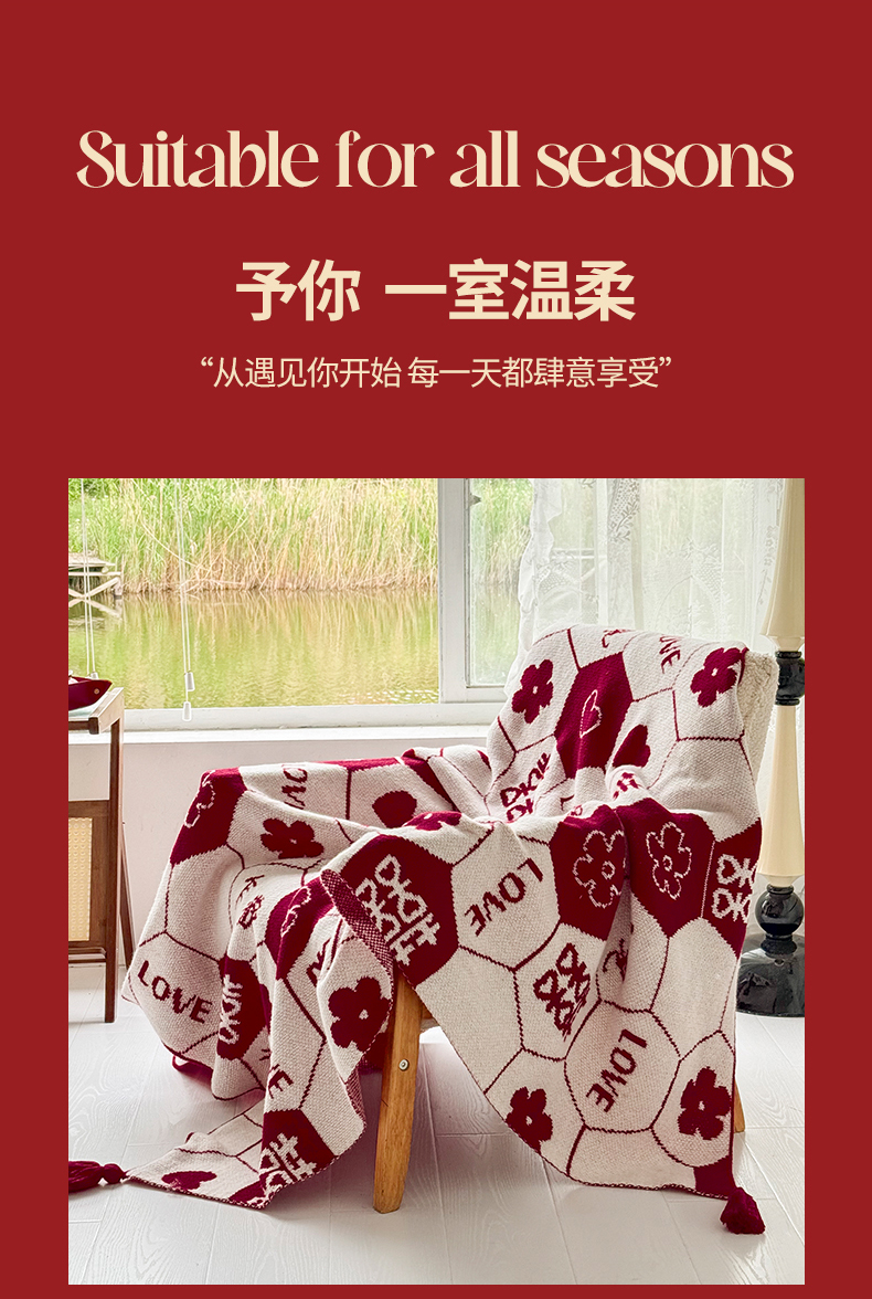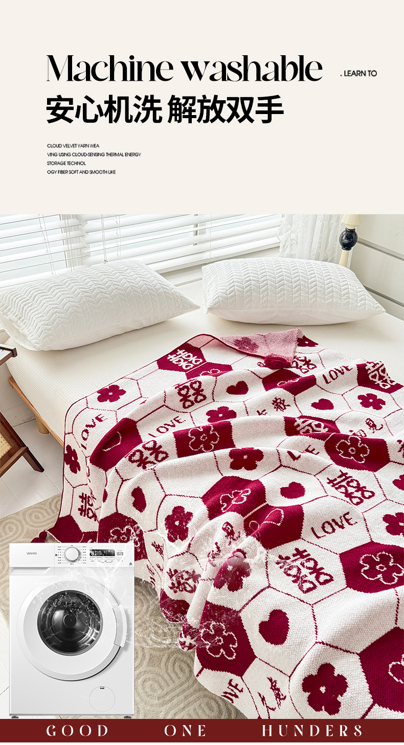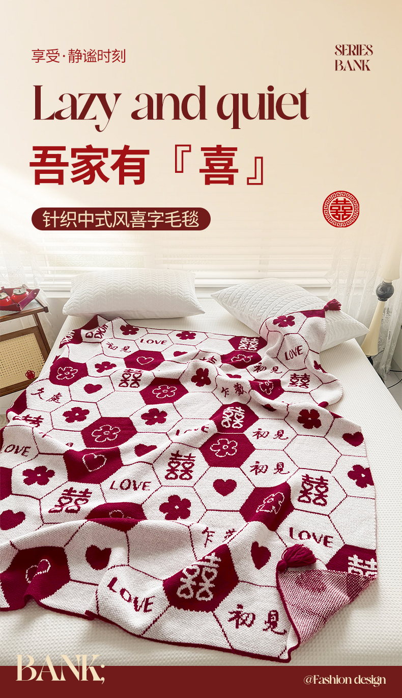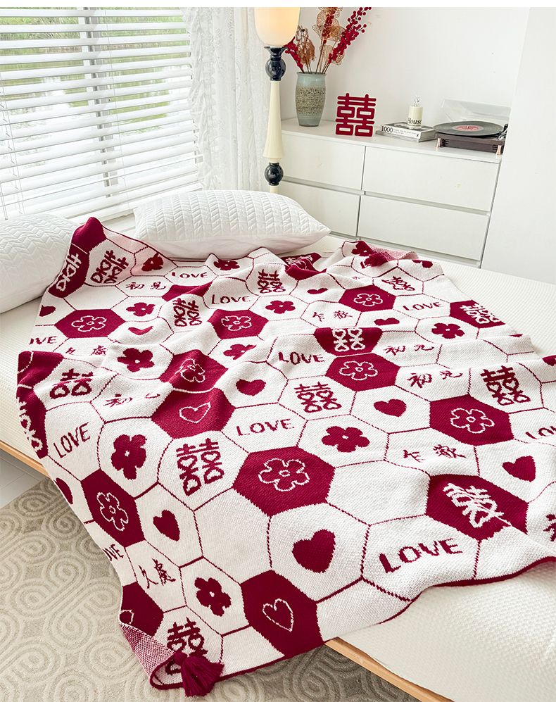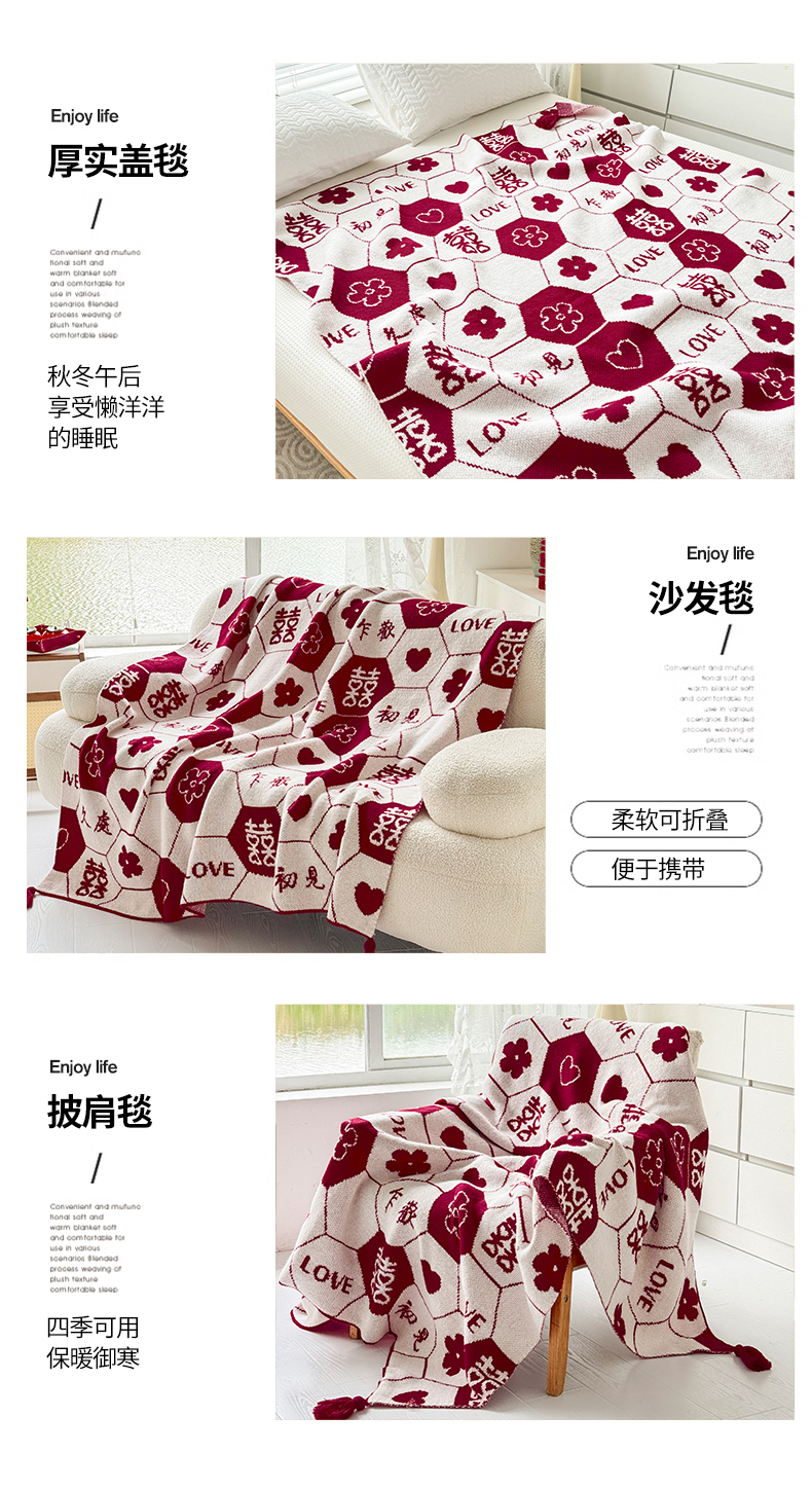 当前位置: 91家纺网 > 商品网购 > 毛毯休闲毯绒毯 > 毛毯 > 栩裕纺织 2024新款中式风高端婚礼喜字毛毯(可定制) 针织喜字-初见红色盖毯