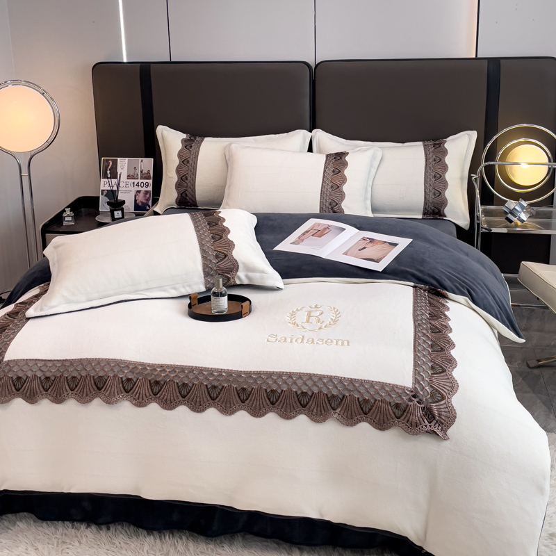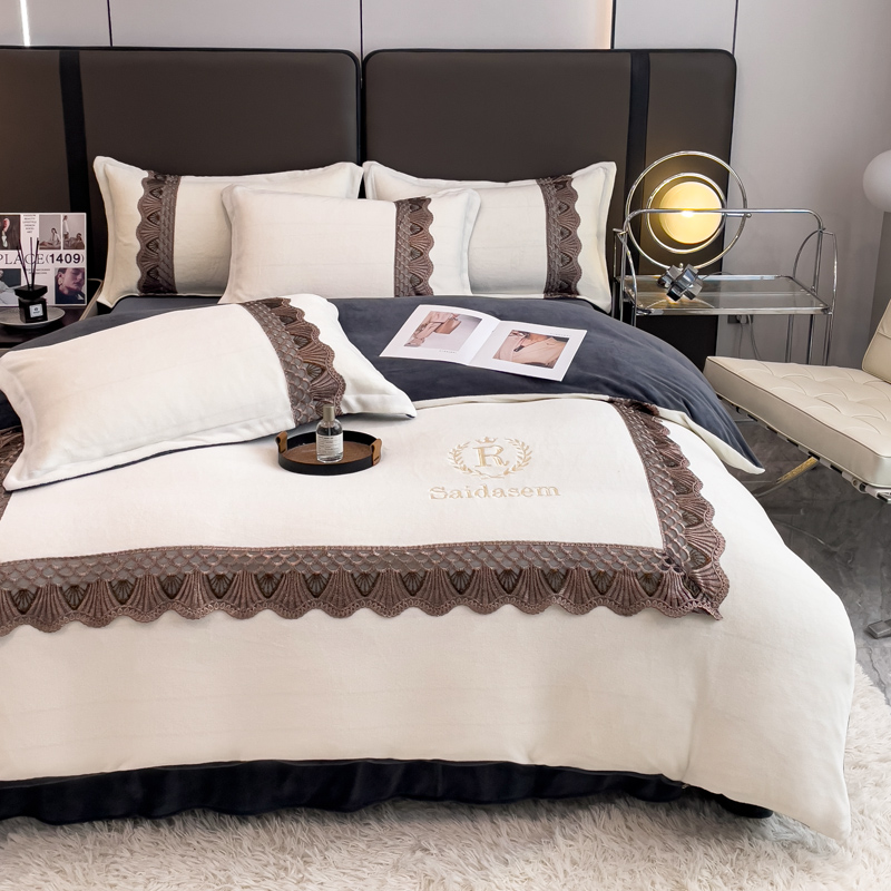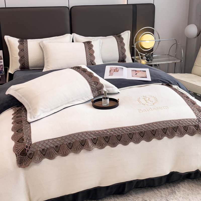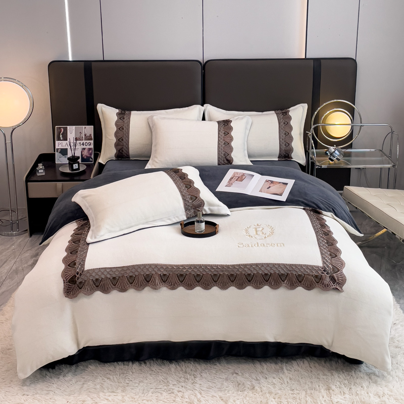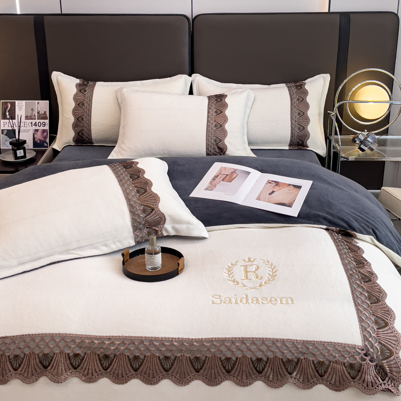 仟网汇 2024爆款轻奢贵族风蕾丝立体刺绣高克重牛奶绒四件套金貂绒法莱绒 白加灰