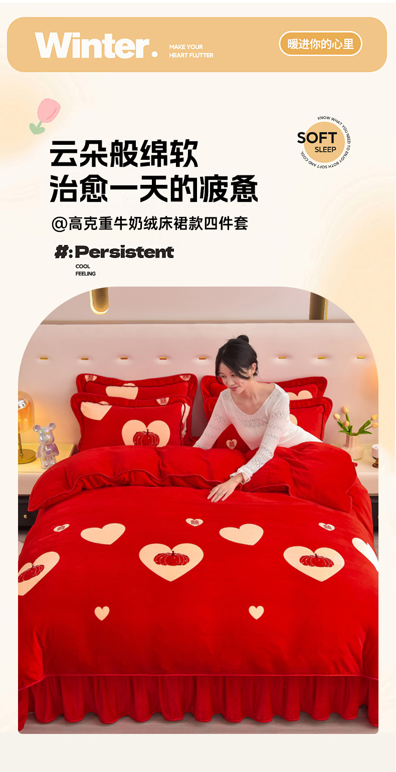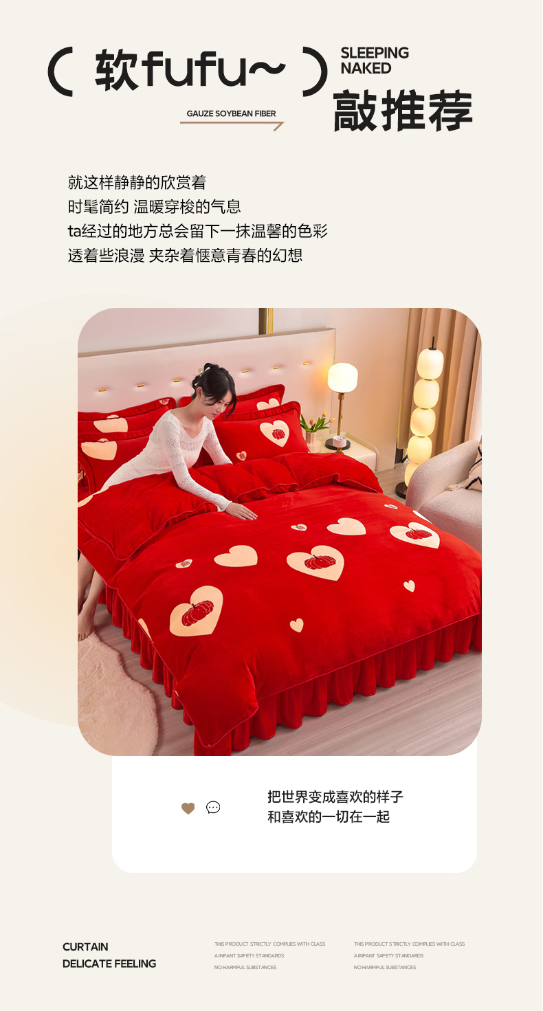 晚静家纺 2024新款8.5斤牛奶绒金貂法莱绒床裙款保暖绒四件套 多彩有杏,多彩有杏
