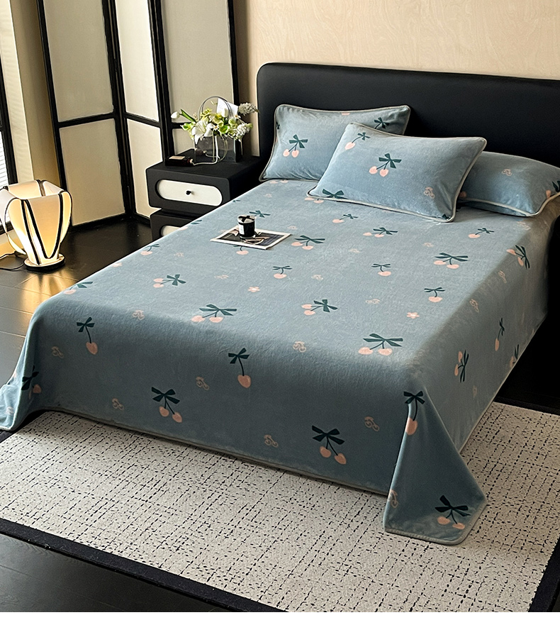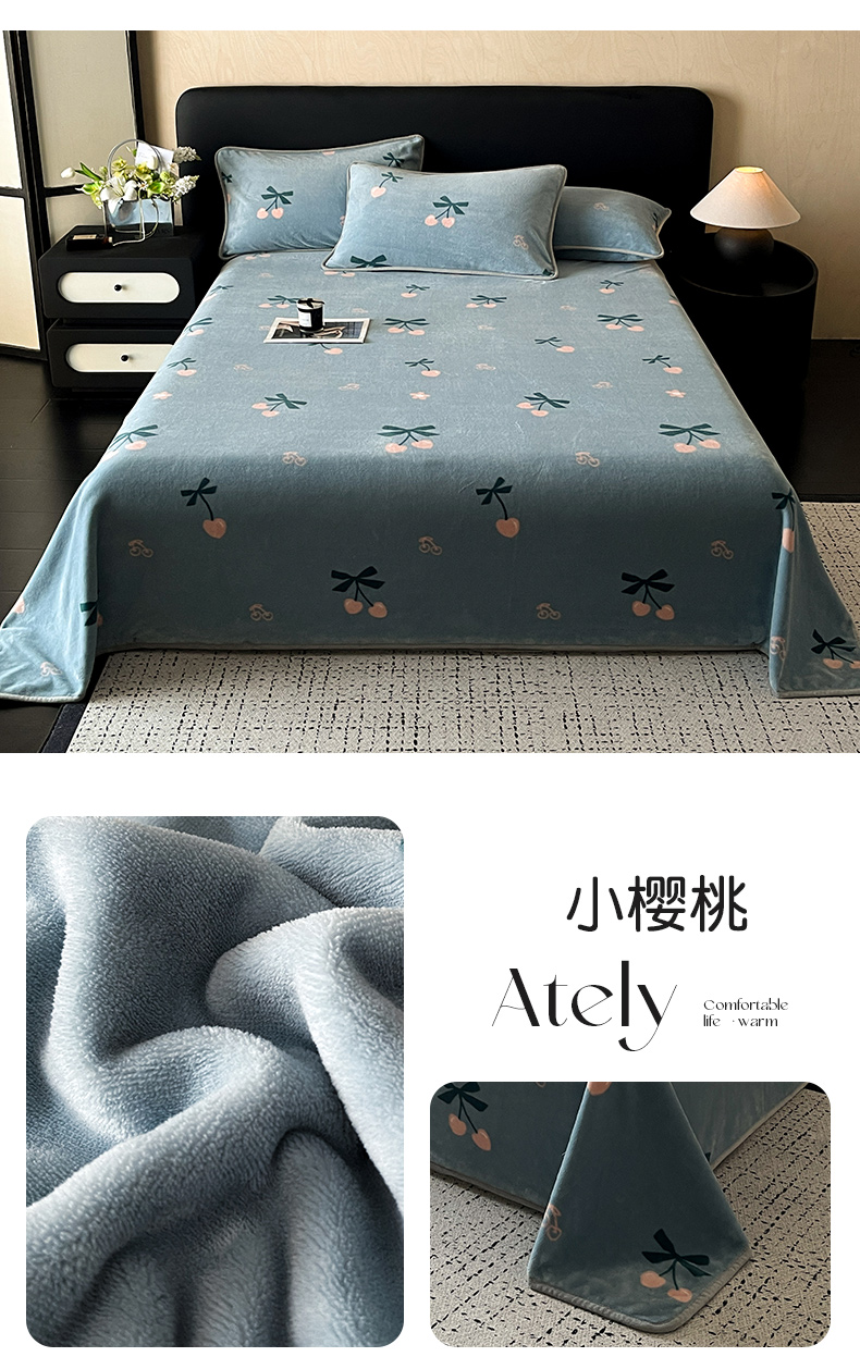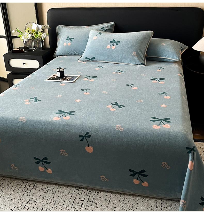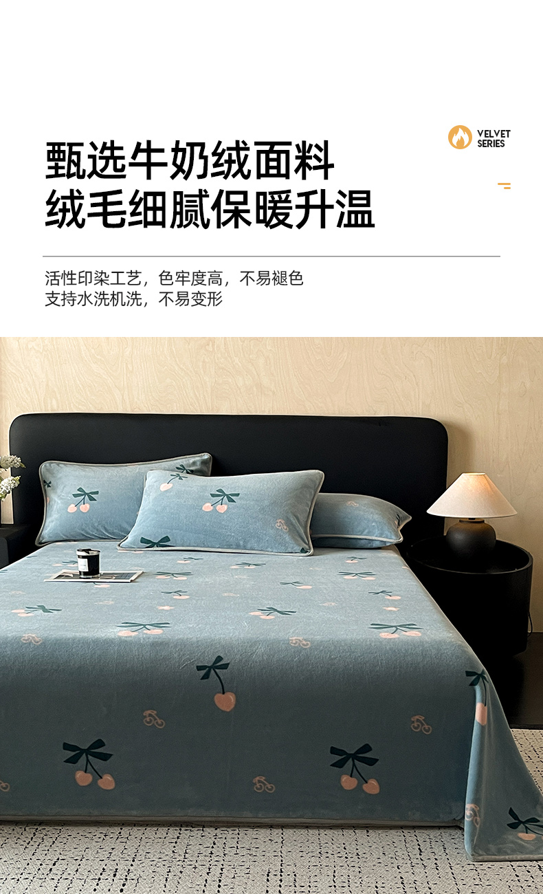 商品名称:全季家居 2024新款A类纯色印花高克重加厚保暖包边牛奶绒床单单件 小樱桃