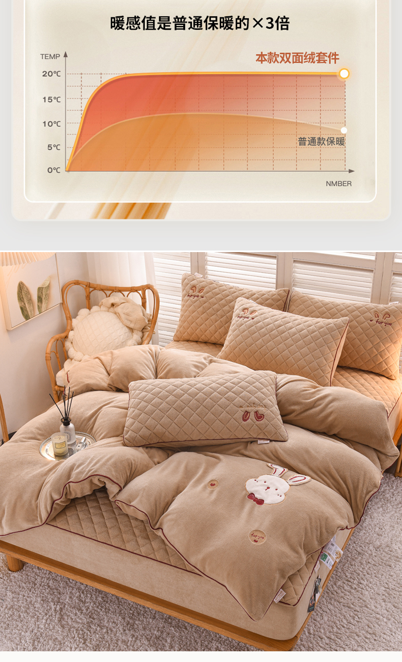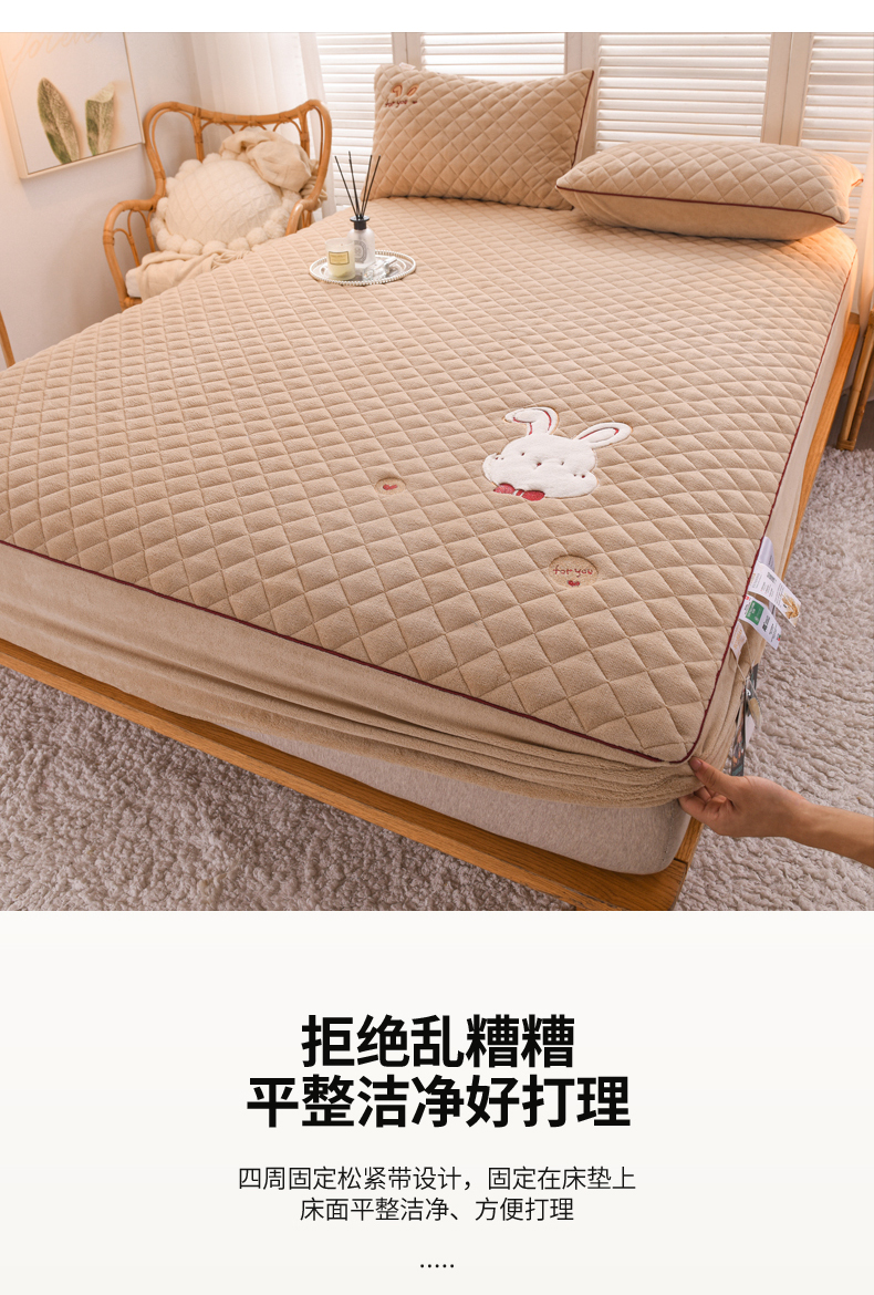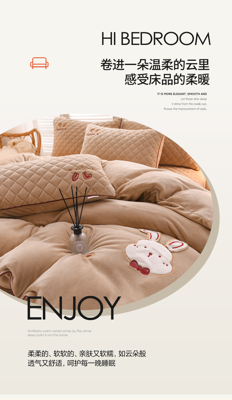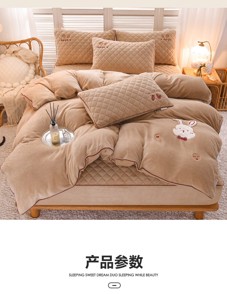 当前位置: 91家纺网 > 商品网购 > 床品套件 > 四件套 > 牛奶绒四件套 > 好眠好梦家纺 2024新款叮当兔牛奶绒绣花床笠款四件套 奶咖