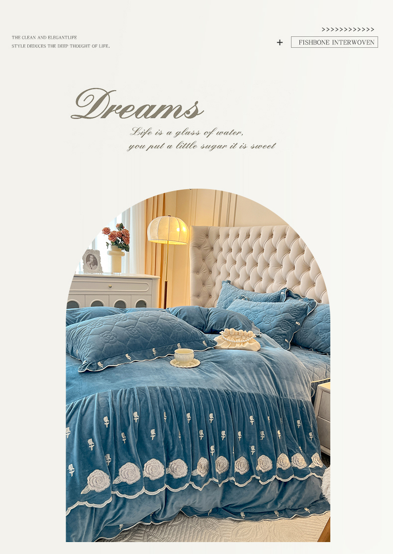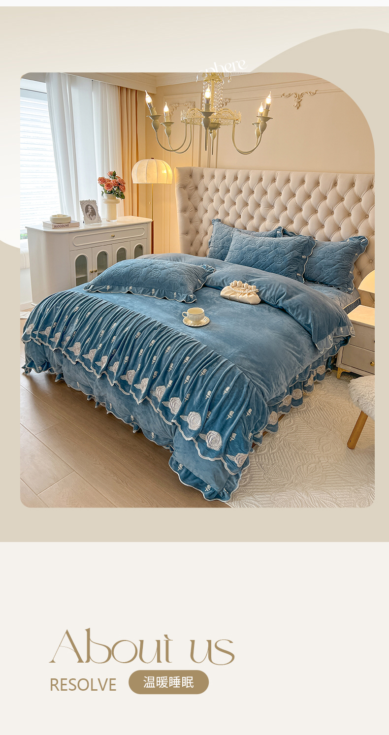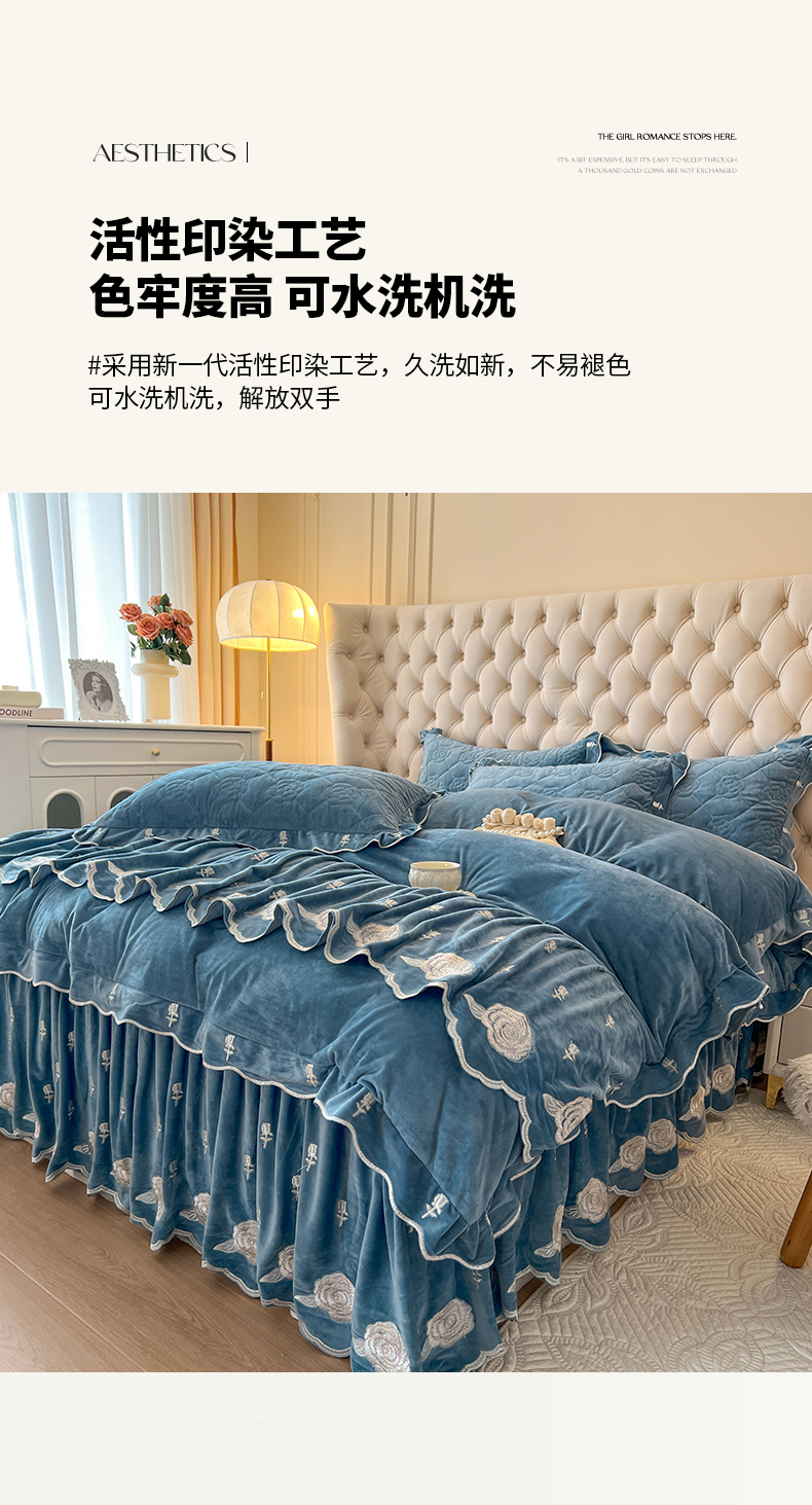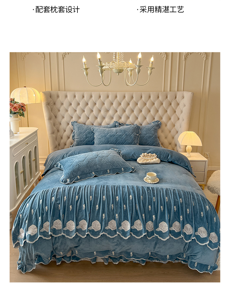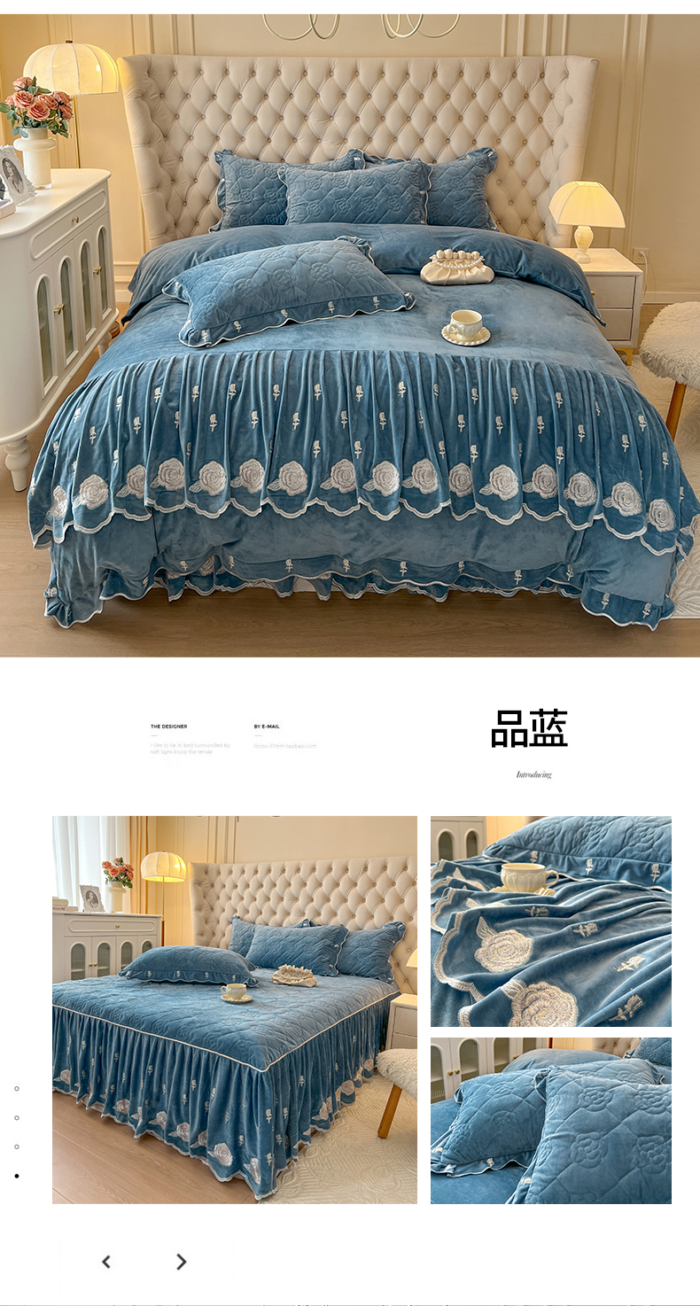 当前位置: 91家纺网 > 商品网购 > 床品套件 > 四件套 > 宝宝绒四件套 > 麒豆豆 2024新款宝宝绒床裙四件套-晨曦玫瑰 晨曦玫瑰-品蓝