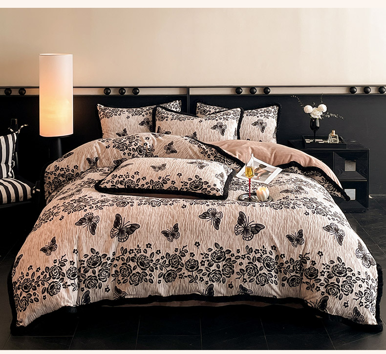 商品名称:吾秀家居 绒城 230克美拉德雕花绒四件套兔毛边牛奶绒四件套 - 黑金系列 蝶恋花