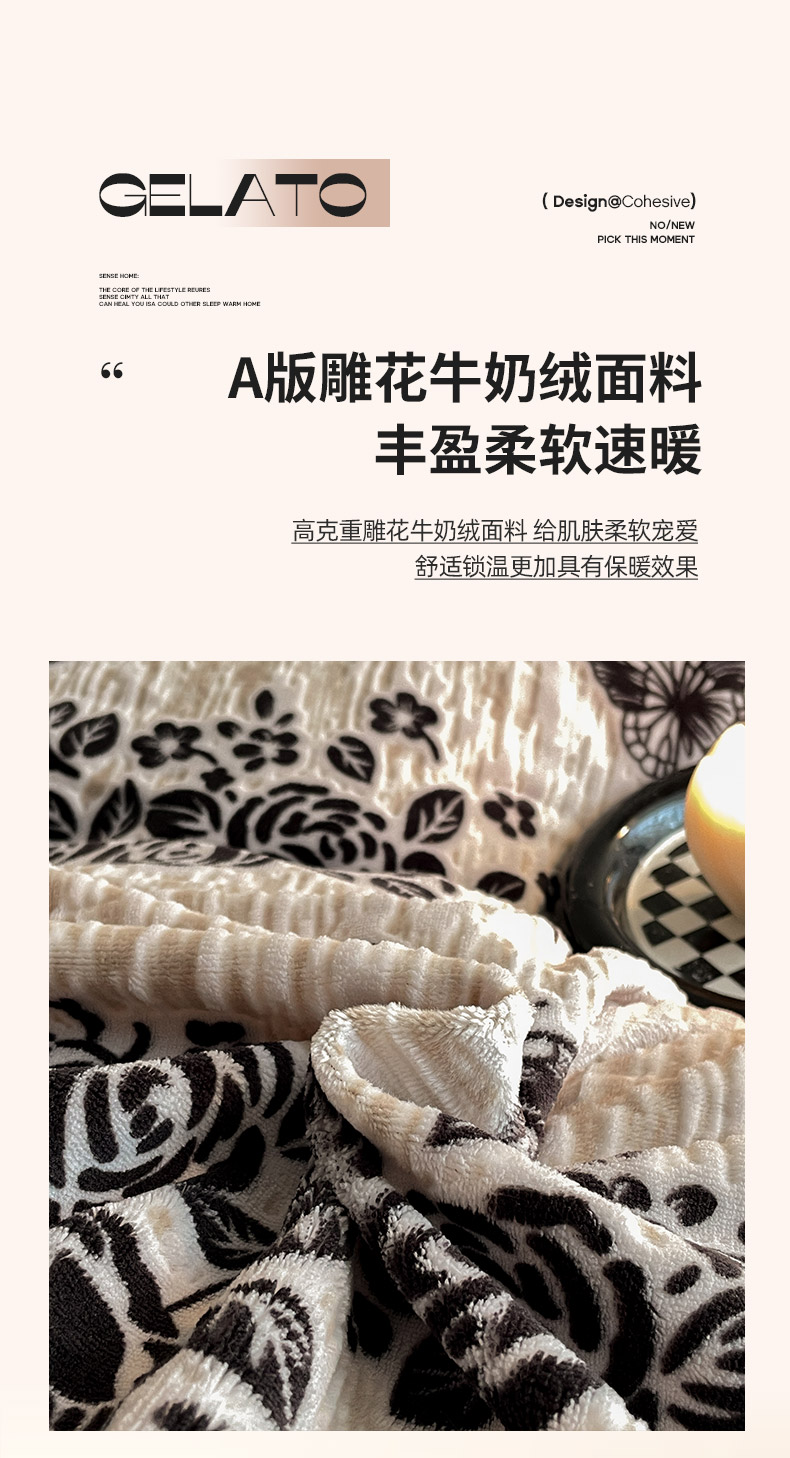 吾秀家居 绒城 230克美拉德雕花绒四件套兔毛边牛奶绒四件套 - 黑金系列 蝶恋花