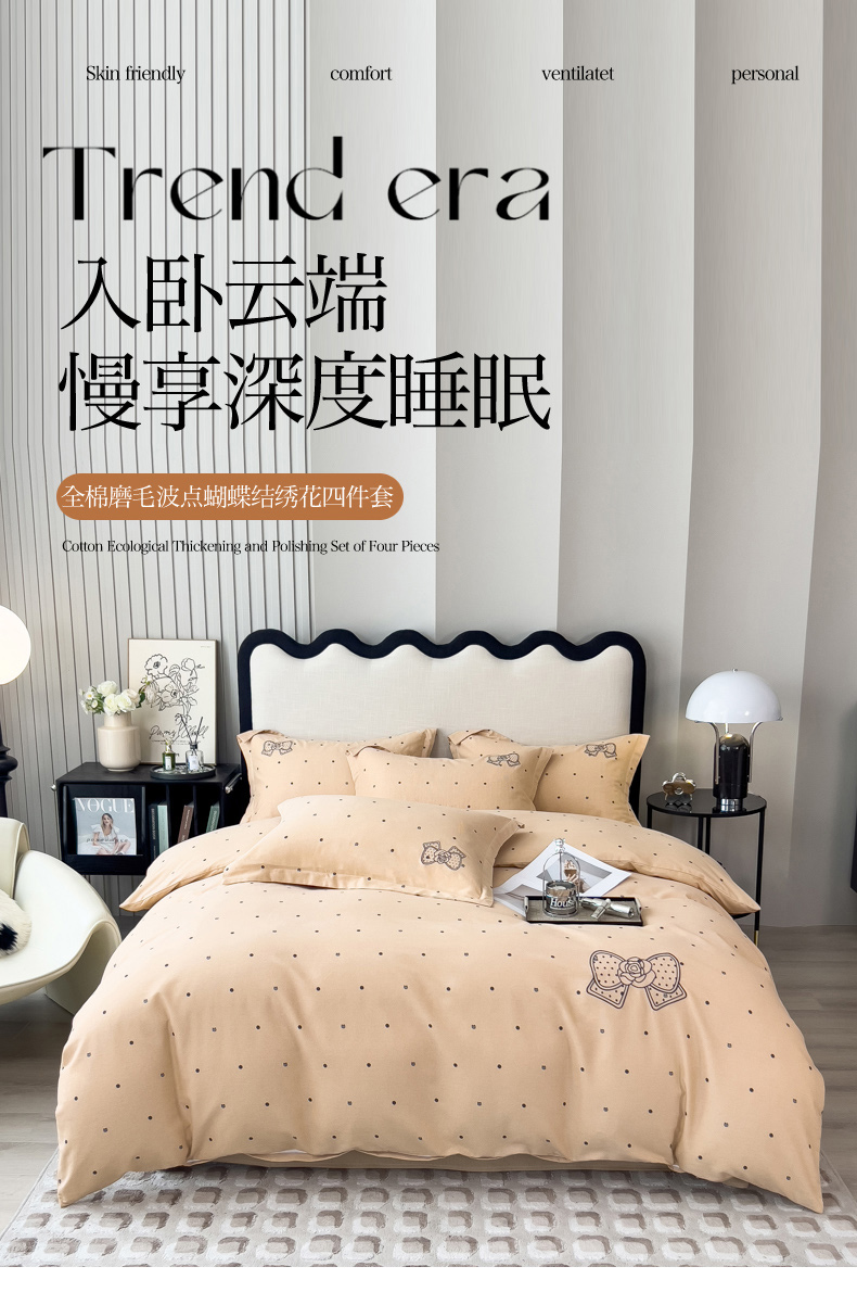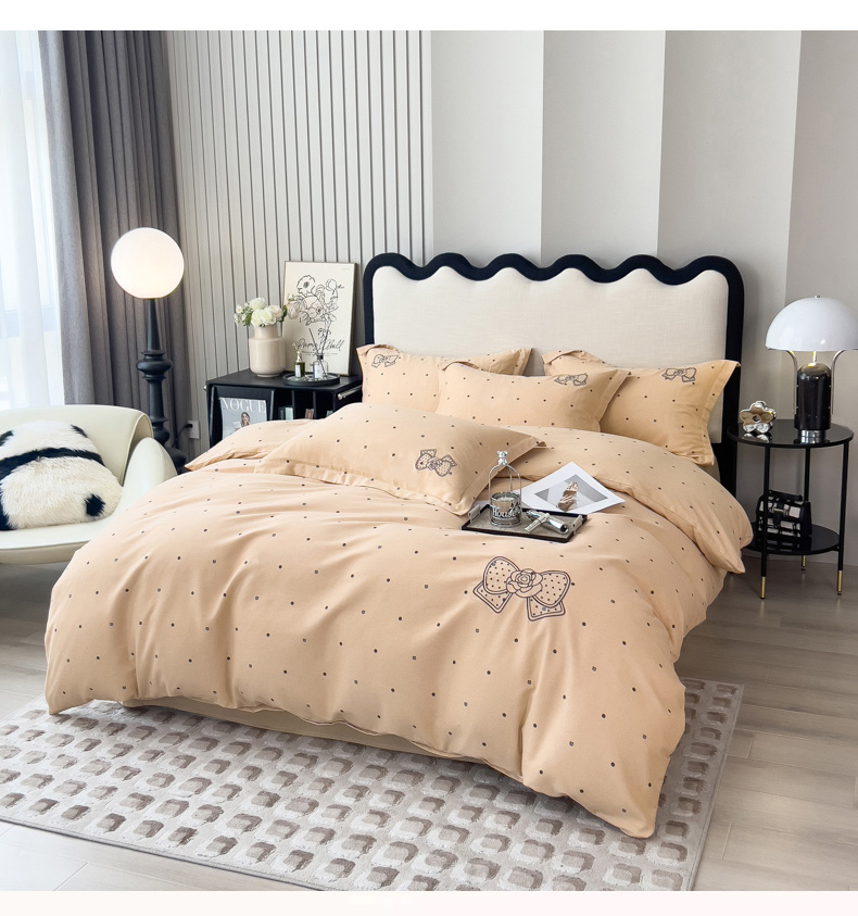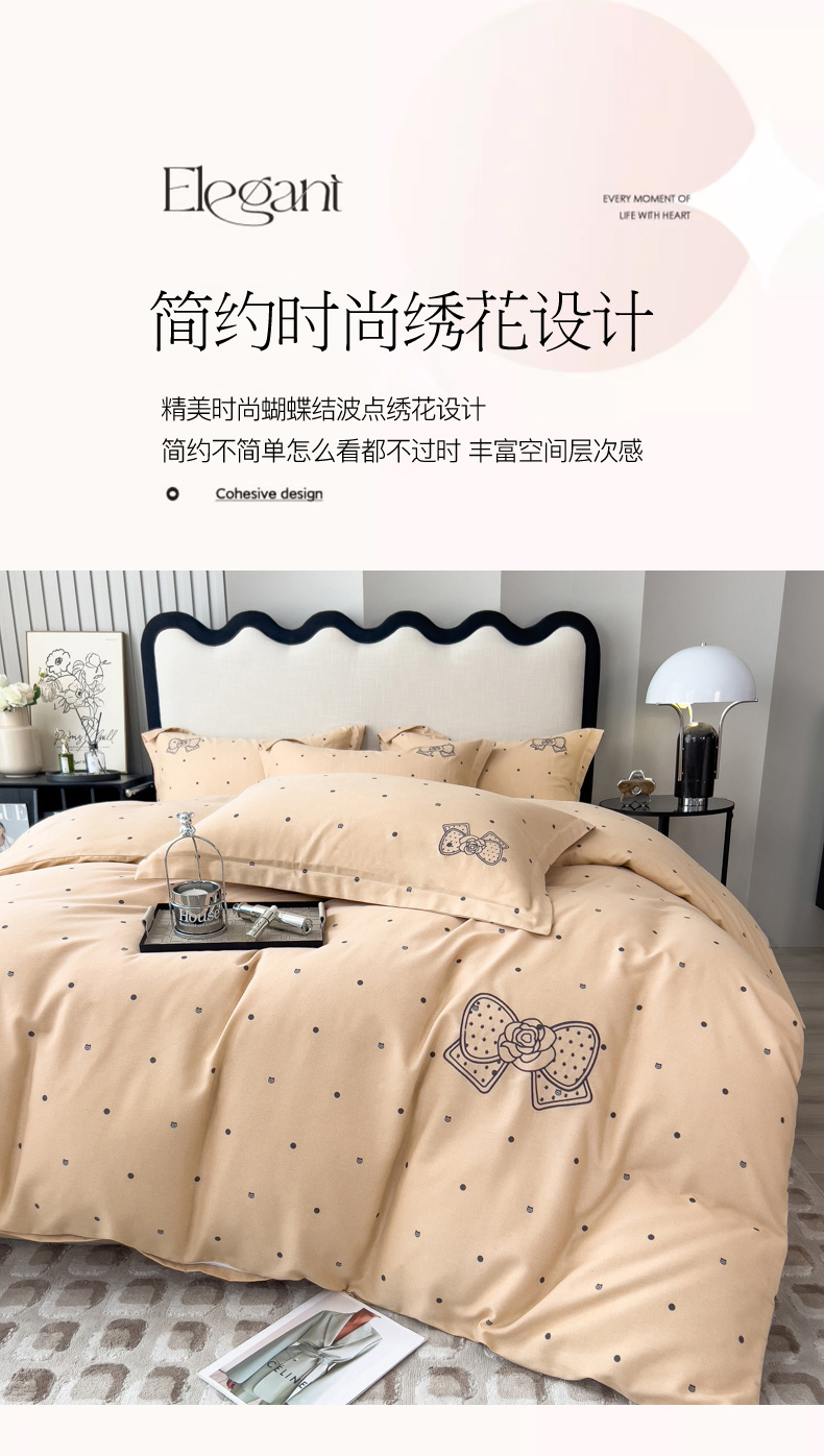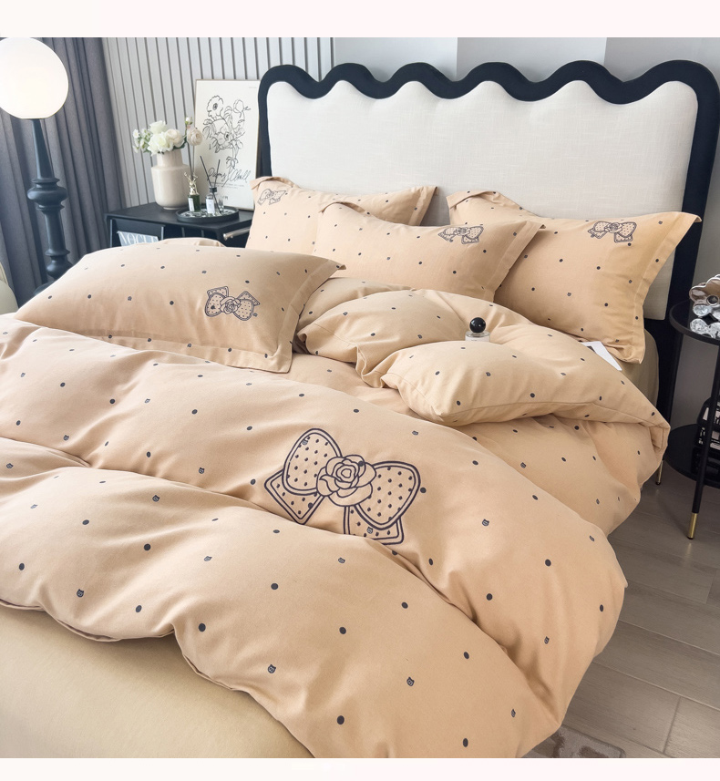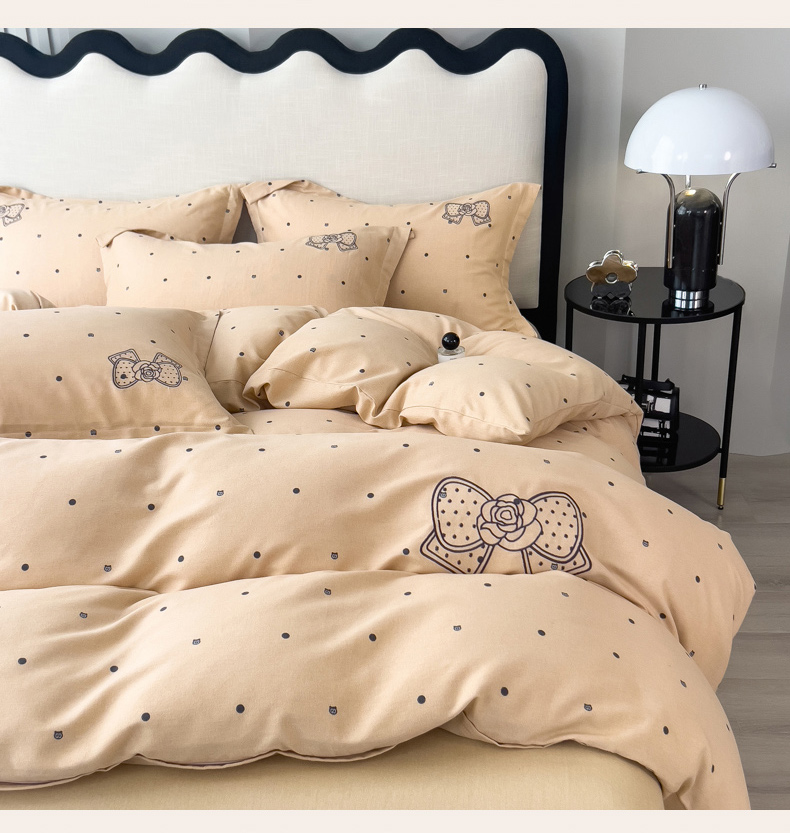 当前位置: 91家纺网 > 商品网购 > 床品套件 > 四件套 > 全棉普通四件套 > 印季家纺 2025新款全棉纯棉波点蝴蝶结绣花混纺磨毛四件套 奶咖