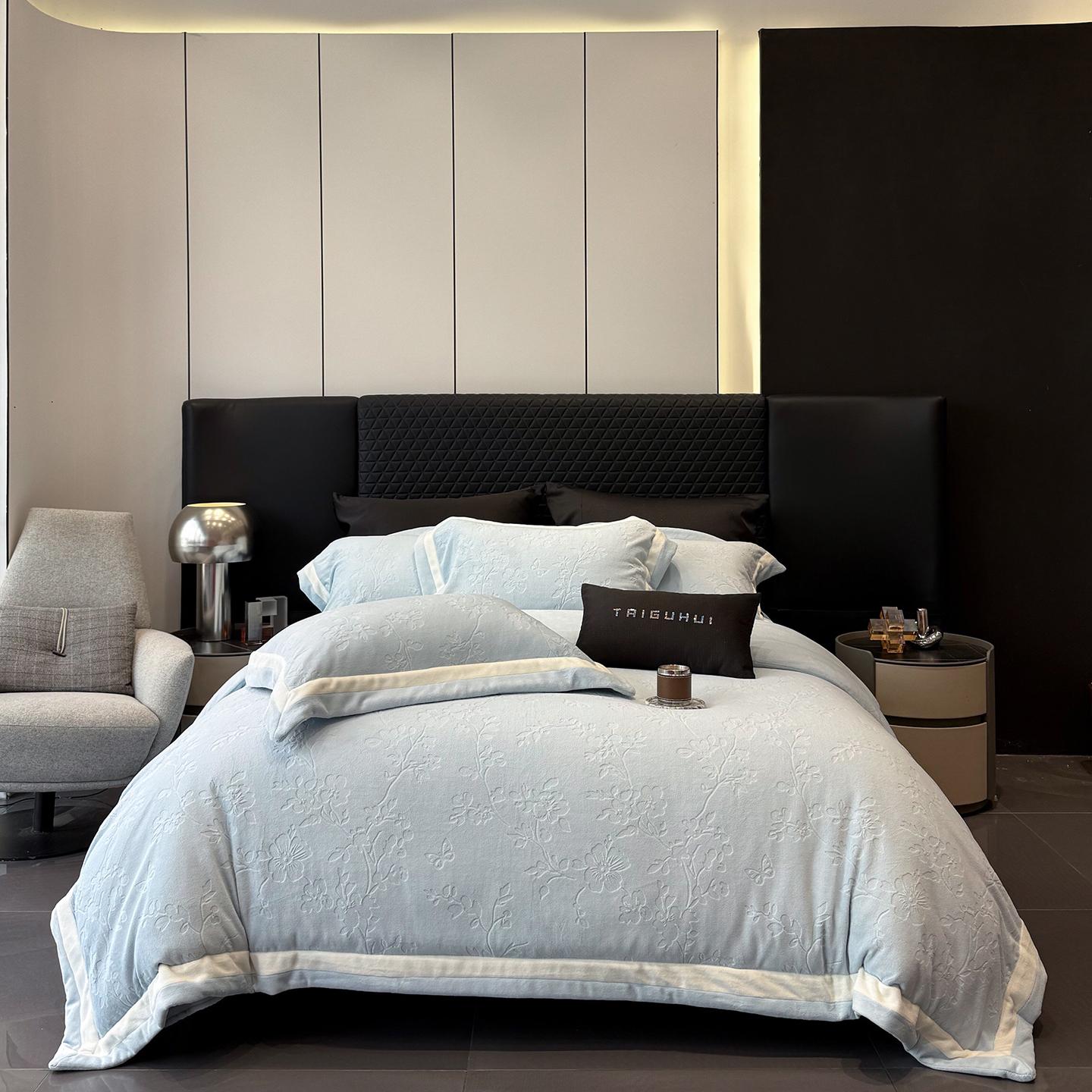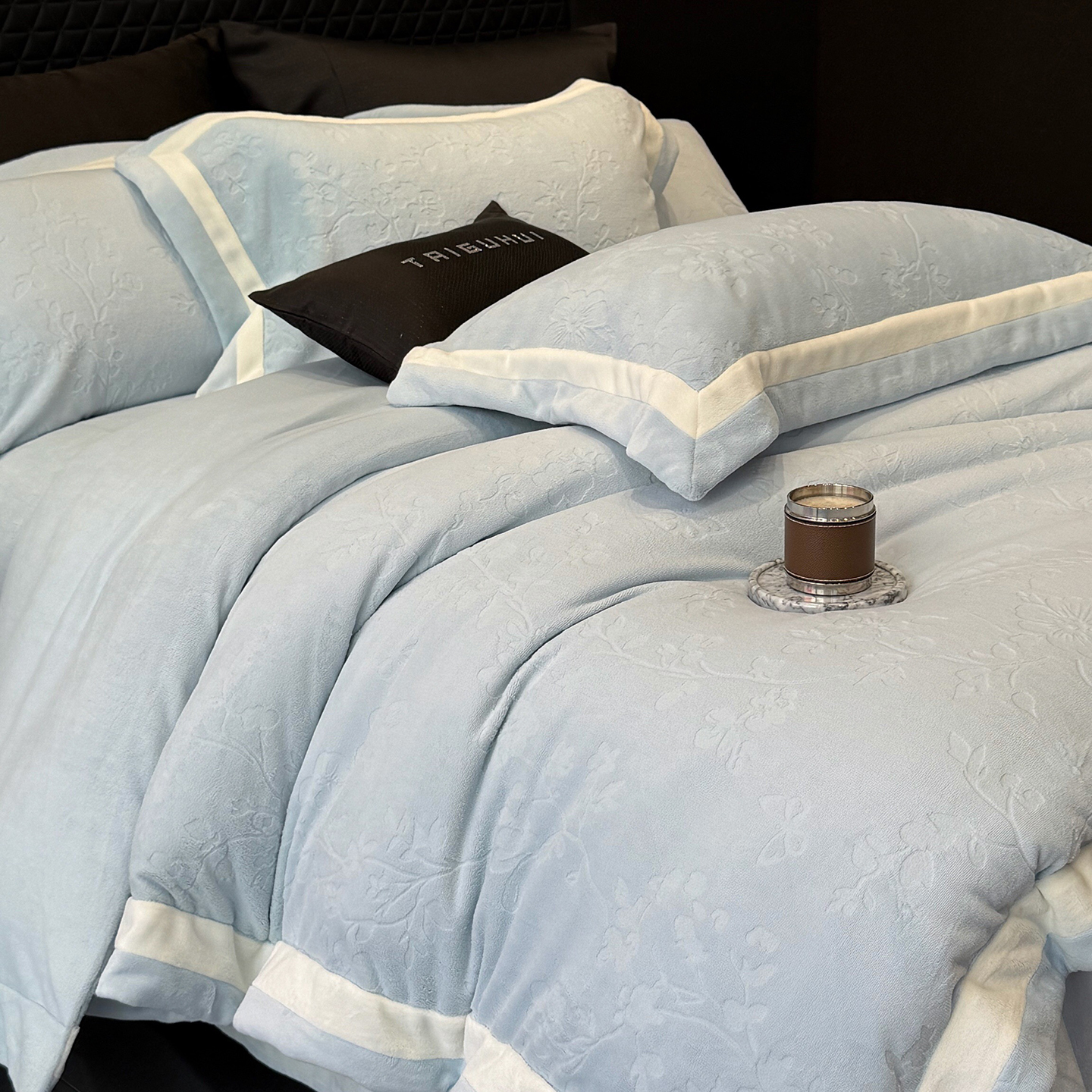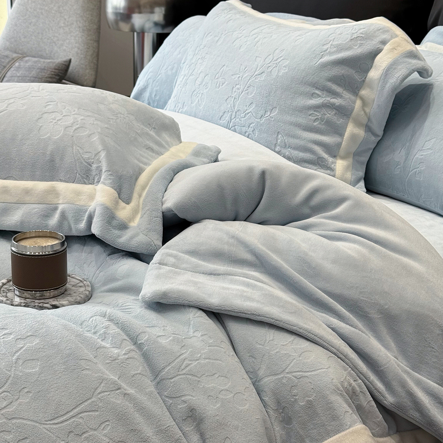 商品名称:太古汇家居 2025新款高克重牛奶绒四件套-繁花系列 繁花-水雾蓝