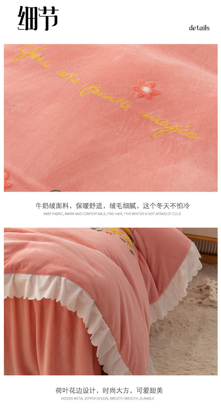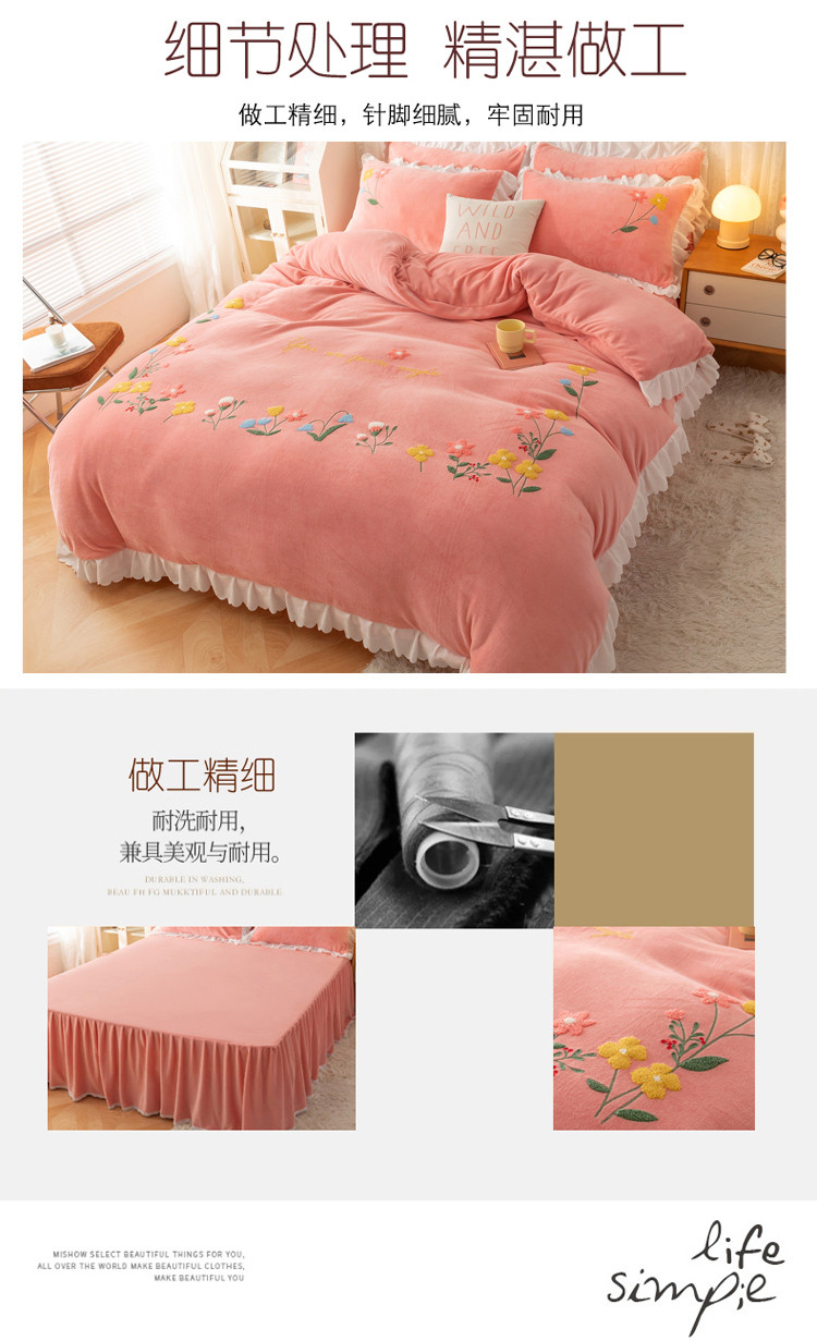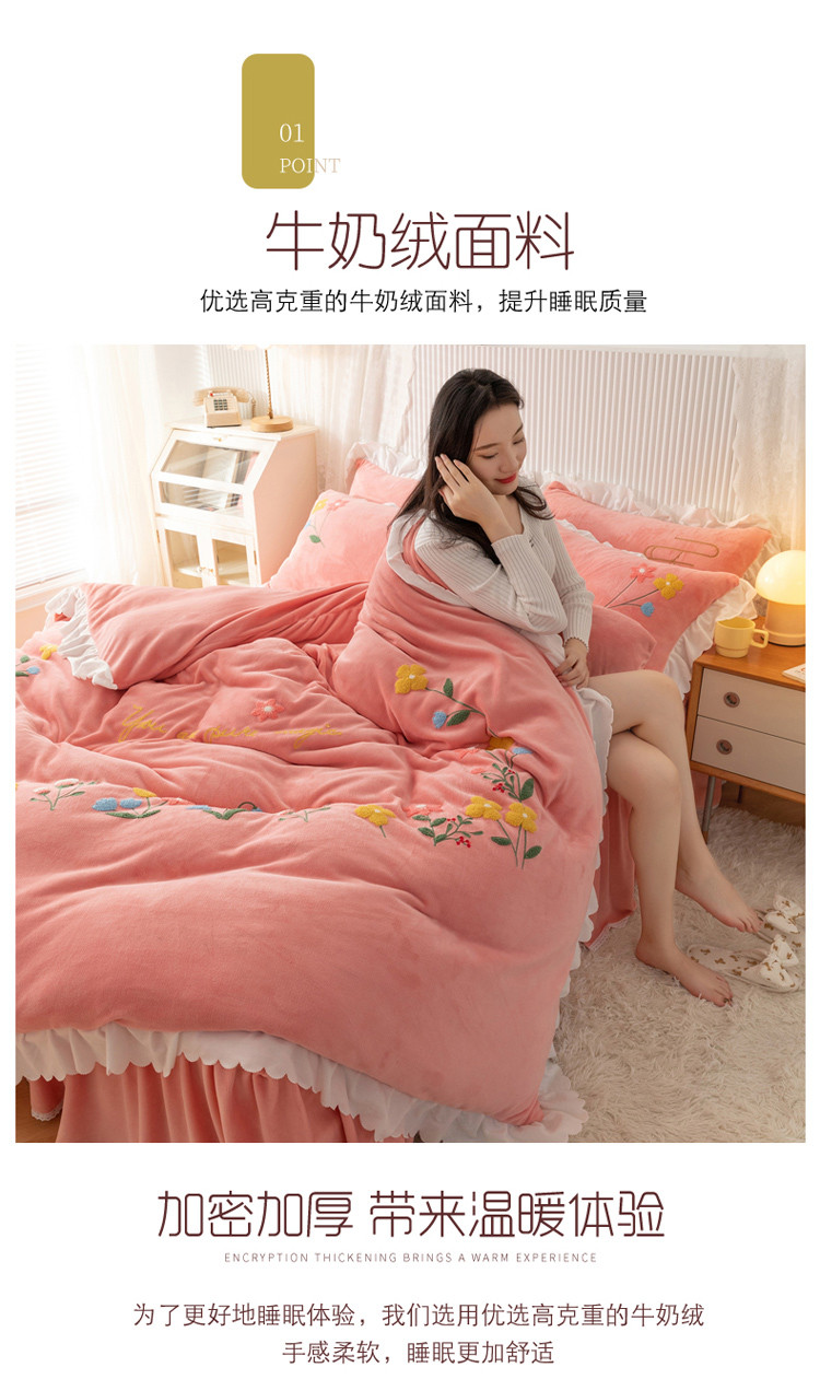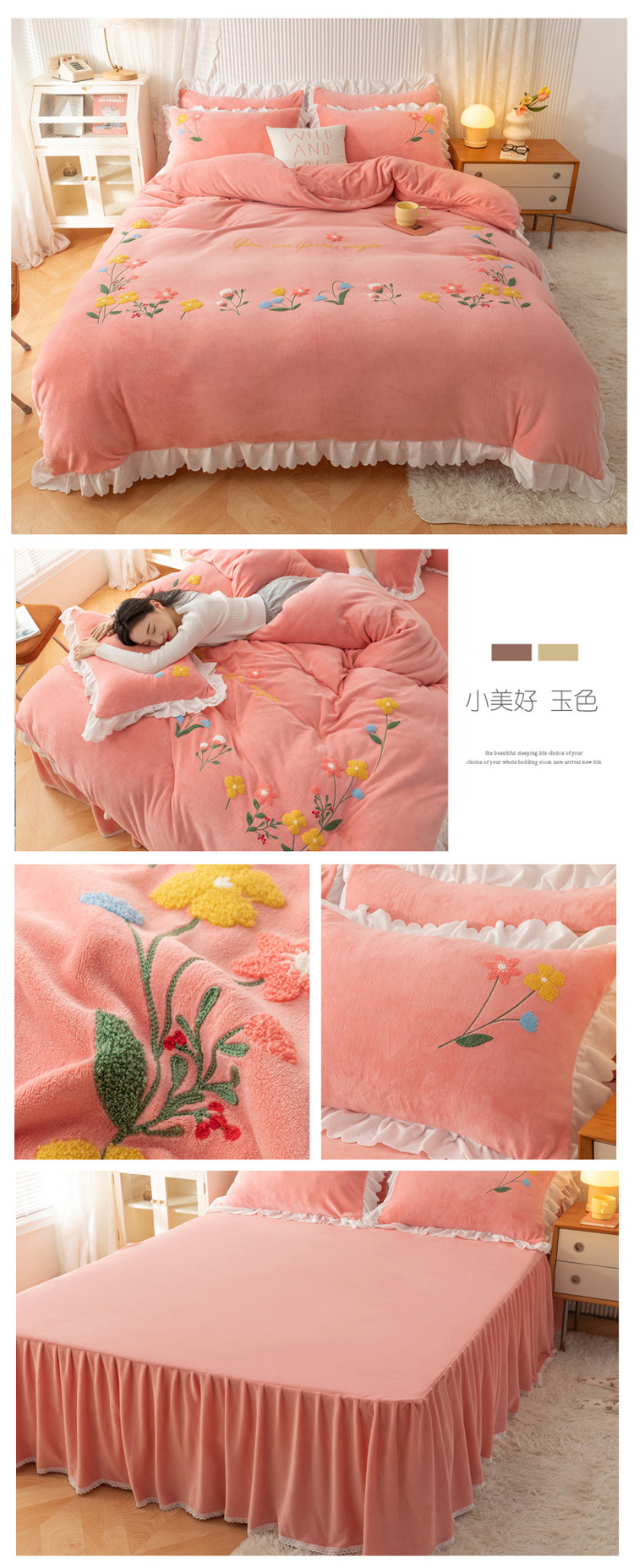 当前位置: 91家纺网 > 商品网购 > 床品套件 > 四件套 > 牛奶绒四件套 > 新品韩版花边绣花牛奶绒法莱水晶绒床单床裙款四件套 小美好玉色