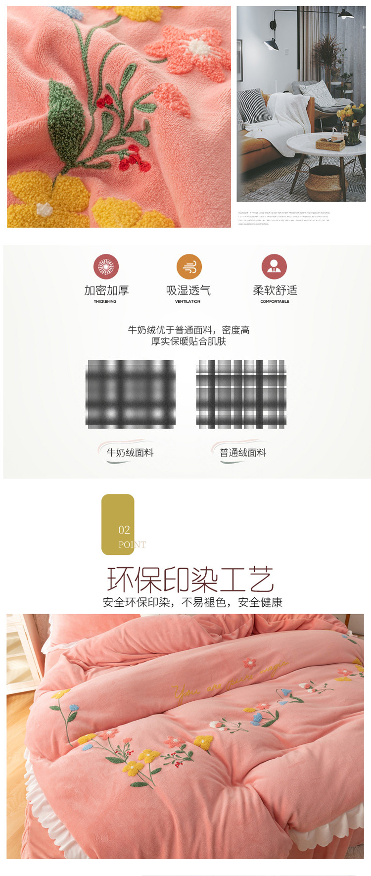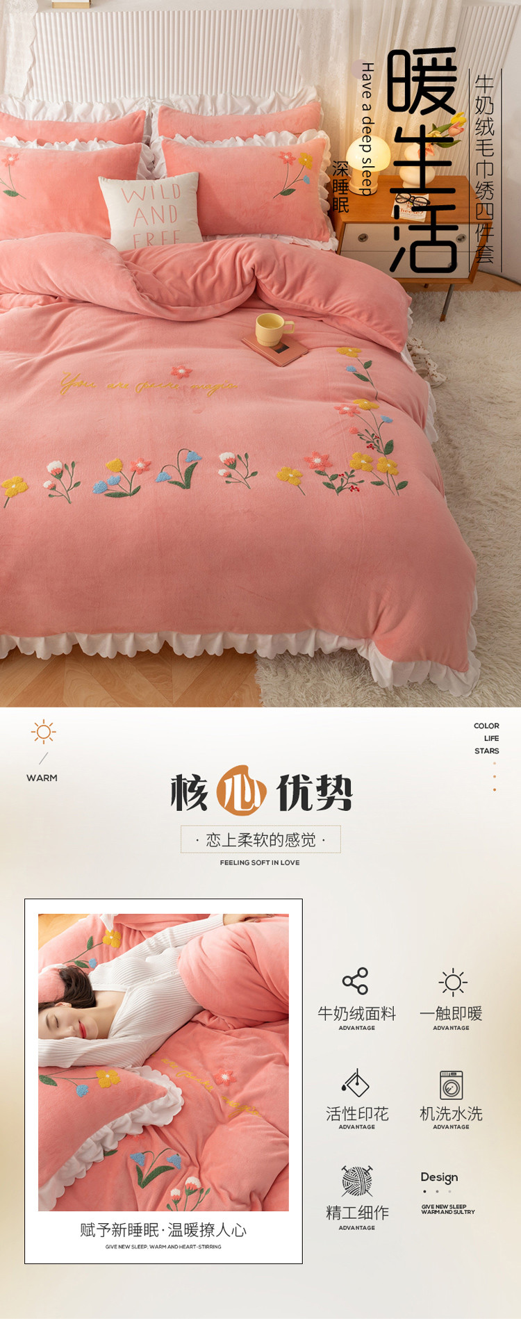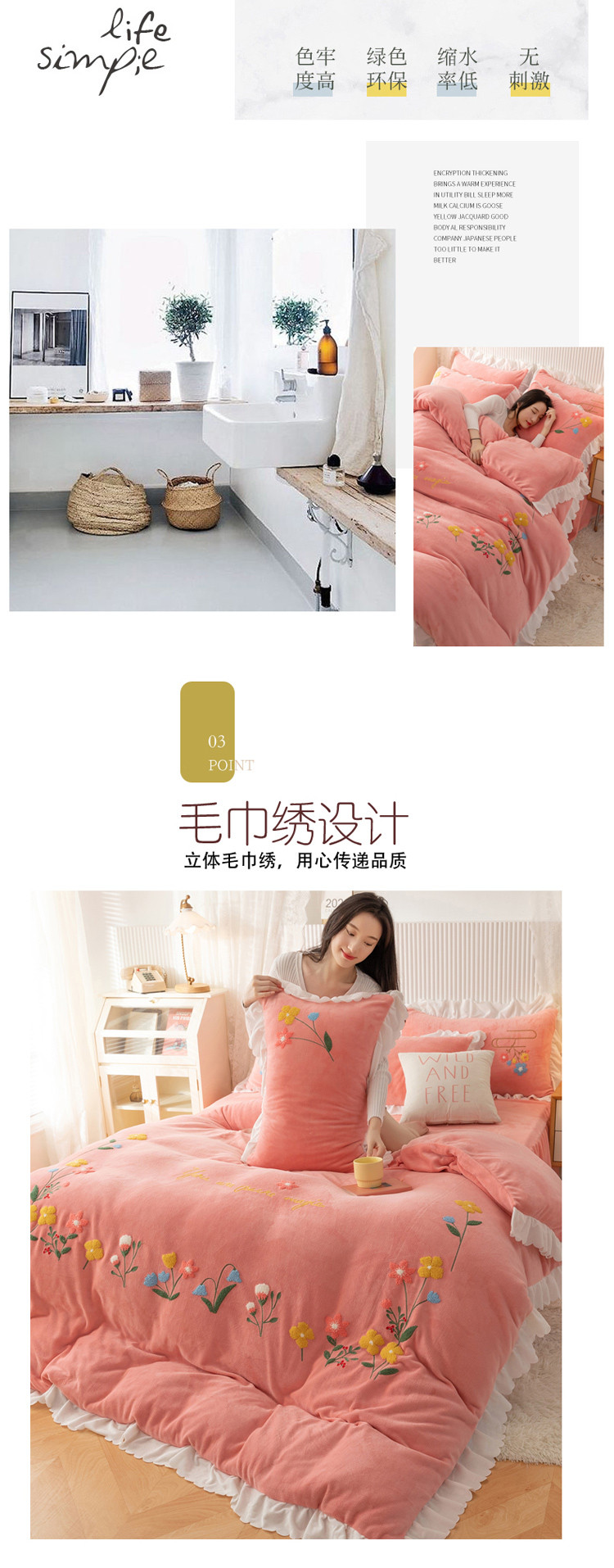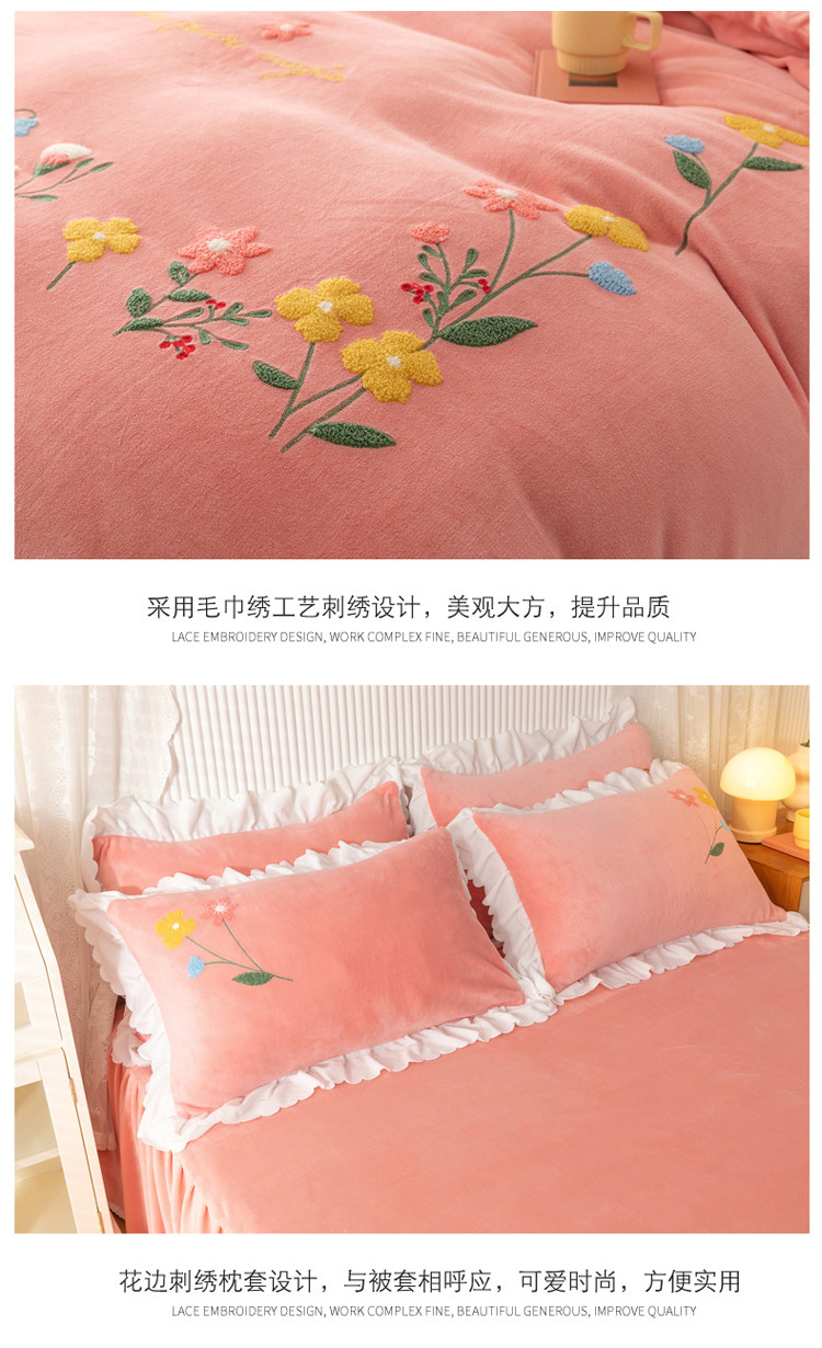 当前位置: 91家纺网 > 商品网购 > 床品套件 > 四件套 > 牛奶绒四件套 > 新品韩版花边绣花牛奶绒法莱水晶绒床单床裙款四件套 小美好玉色