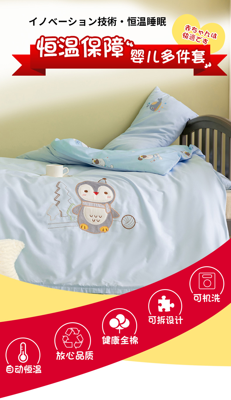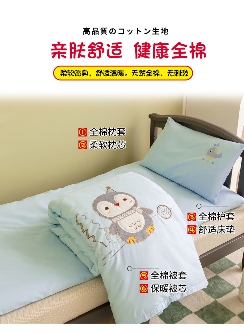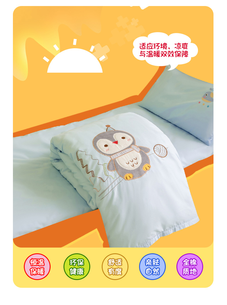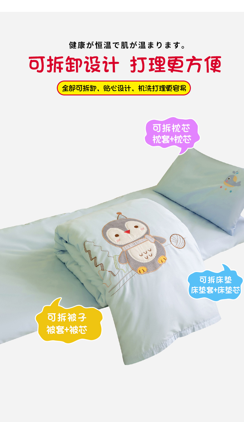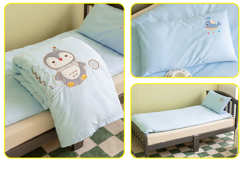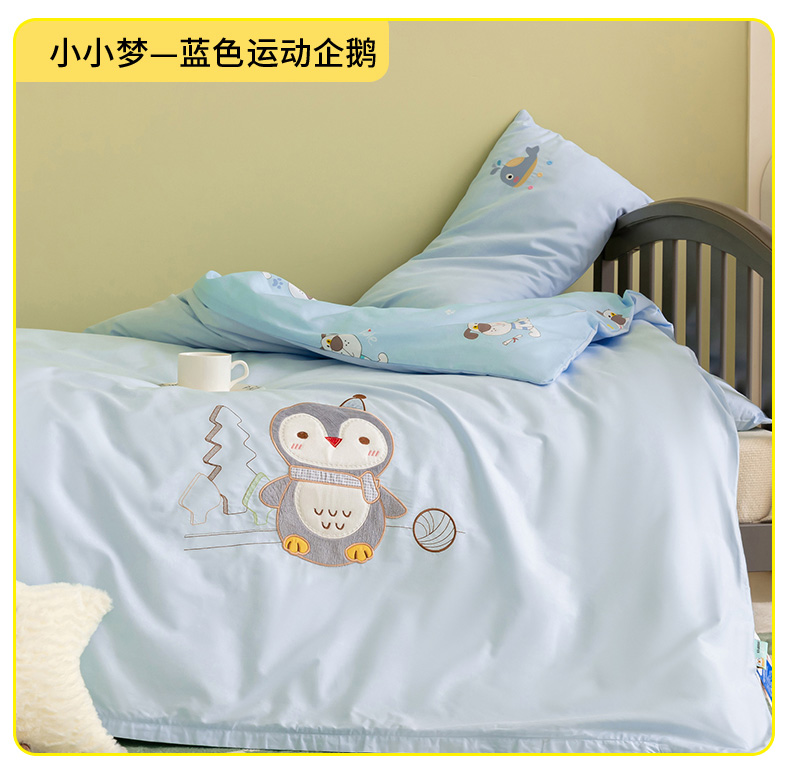 当前位置: 91家纺网 > 商品网购 > 床品套件 > 三件套 > 喜多兔 2023新款40支13372纯棉小小梦绣花幼儿园被子三件套 蓝色运动企鹅