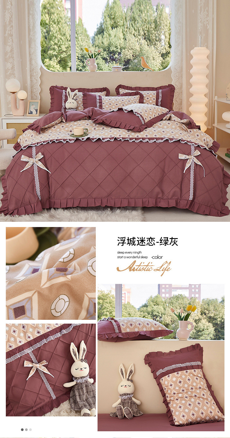靓生活 2023新款贡棉浪漫花边印花四件套 浮城迷恋-绿灰