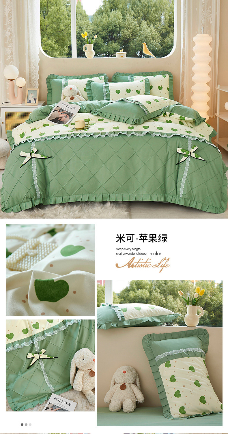 靓生活 2023新款贡棉浪漫花边印花四件套 米可-苹果绿