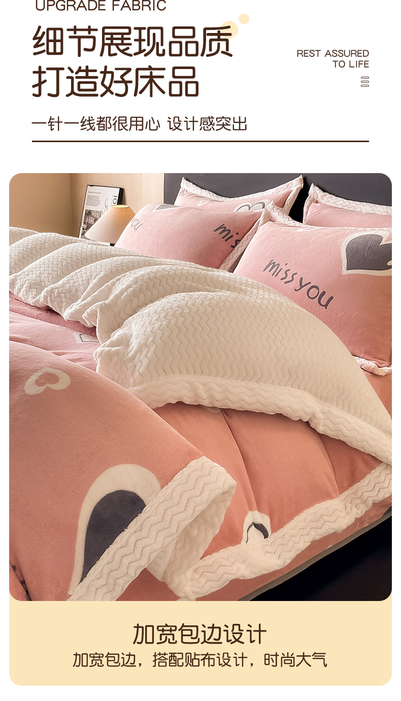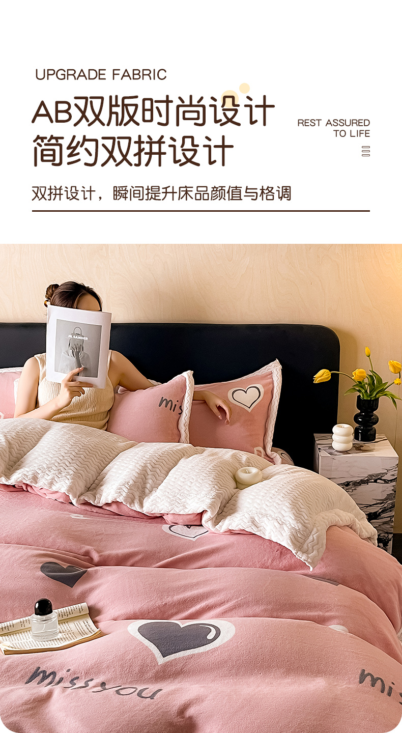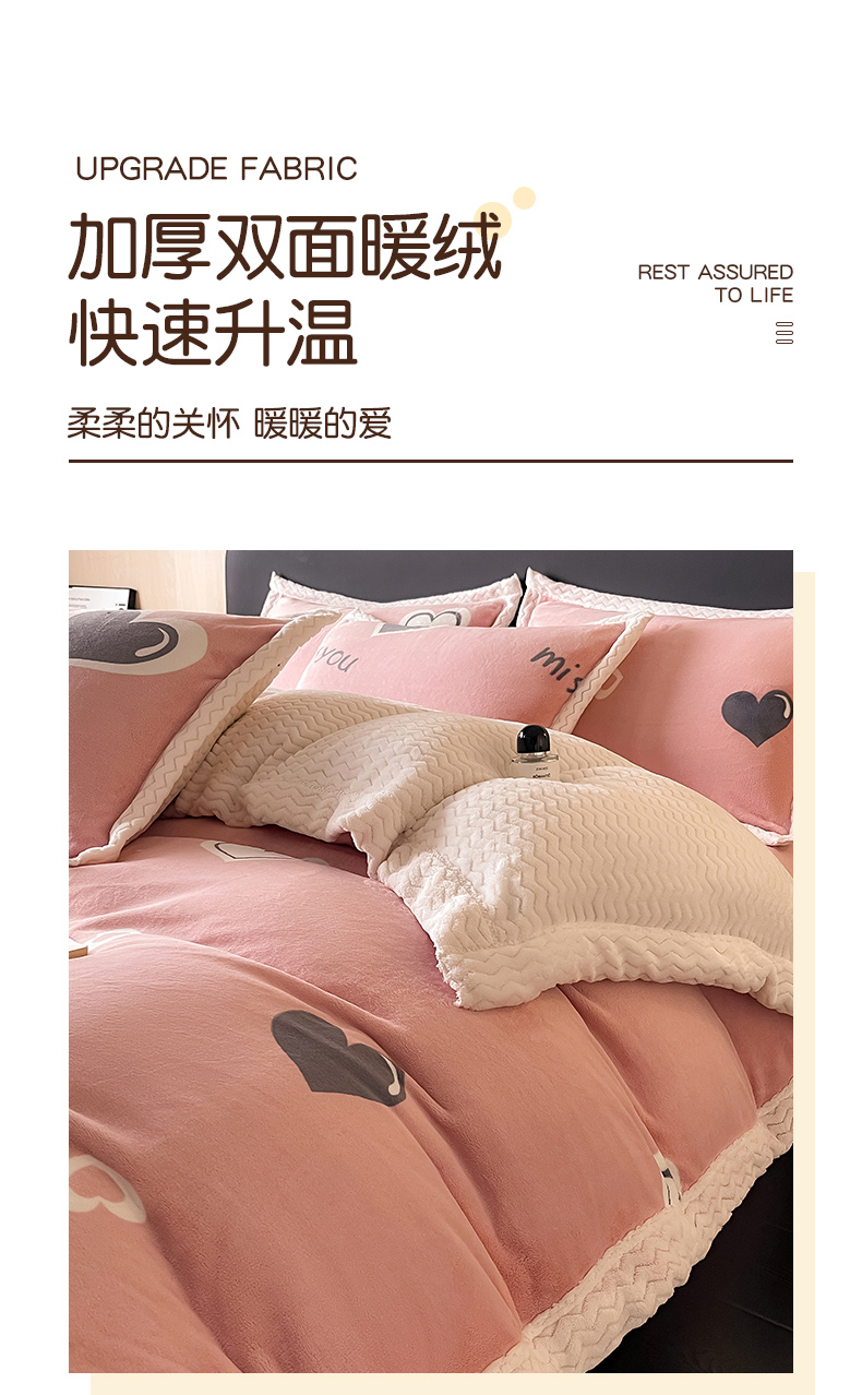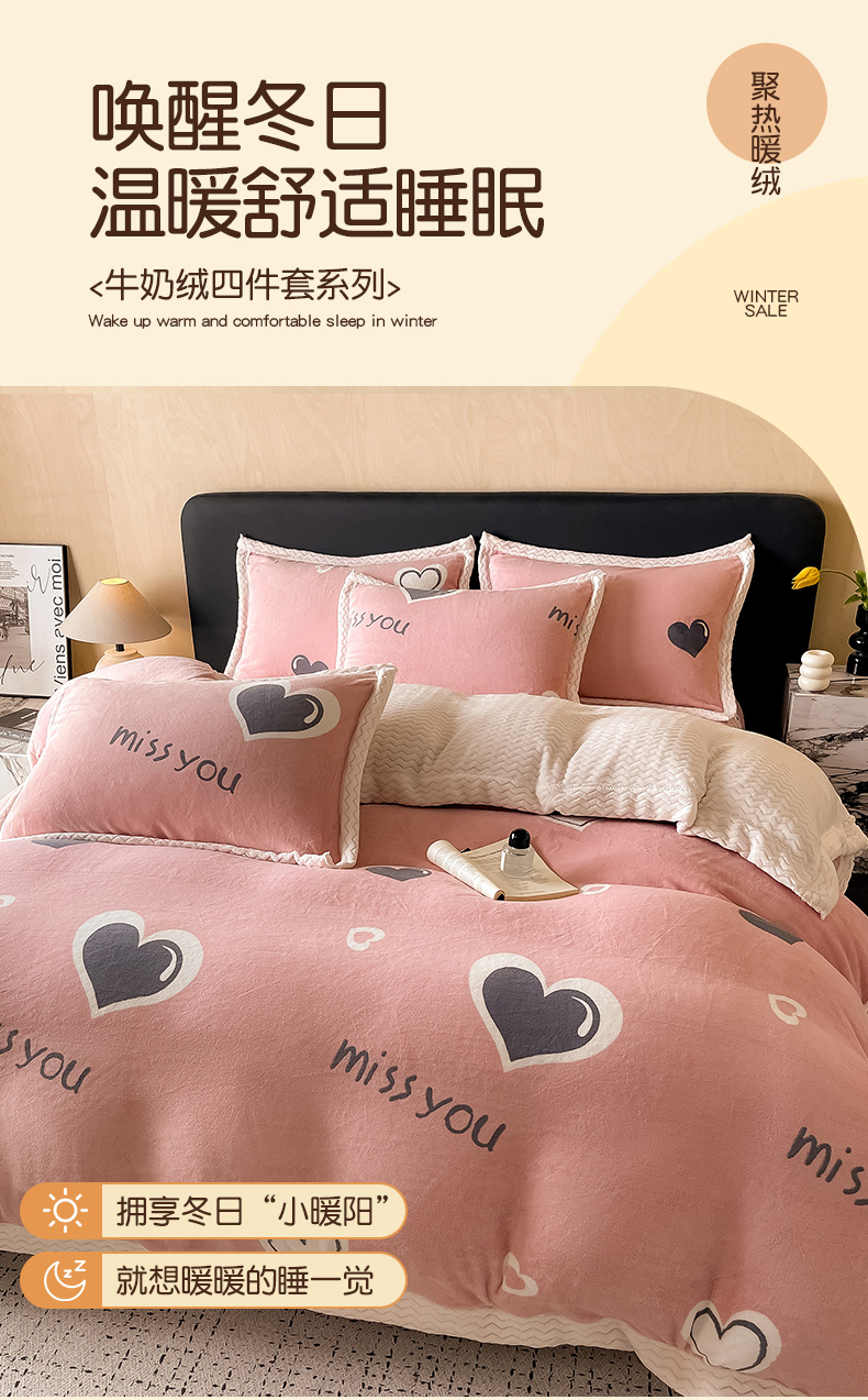 当前位置: 91家纺网 > 商品网购 > 床品套件 > 四件套 > 牛奶绒四件套 > 全季家居 2024新款A类纯色印花波浪大包边牛奶绒贝贝绒加厚保暖四件套 甜心