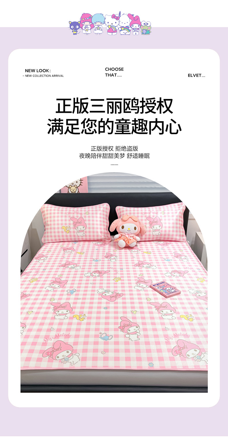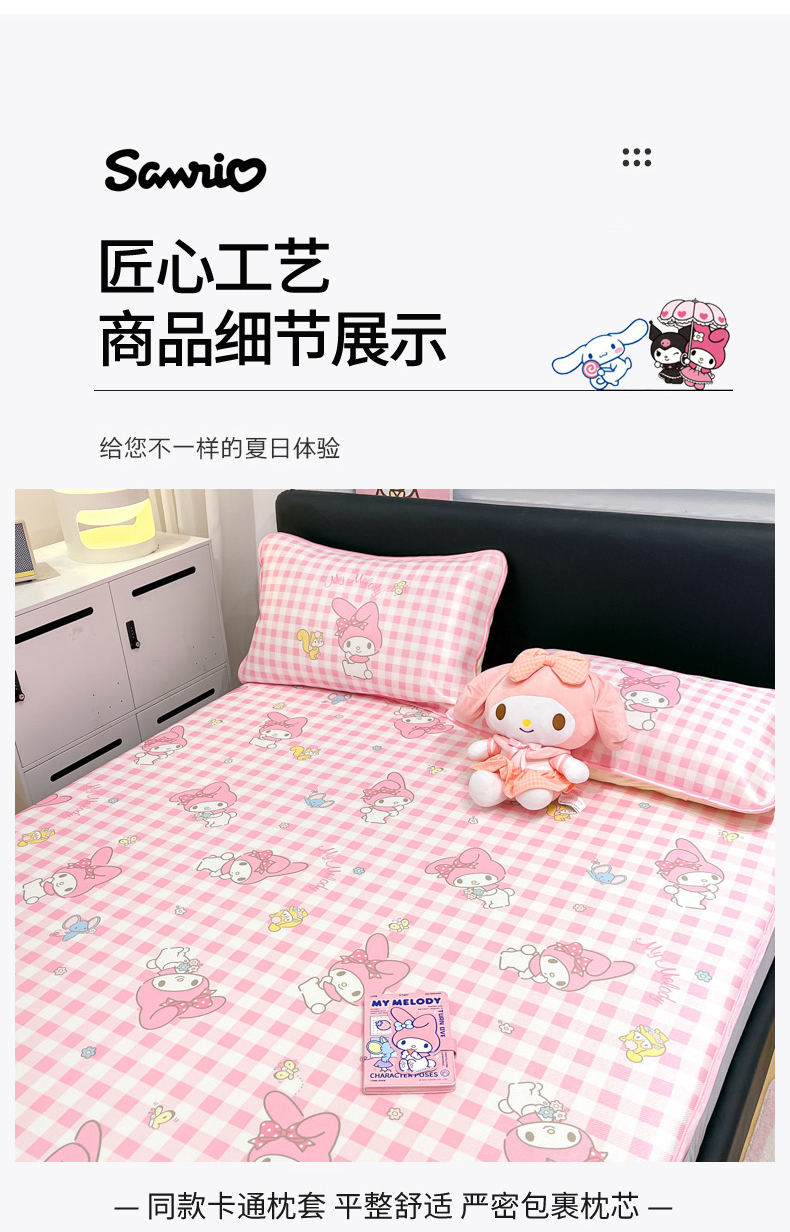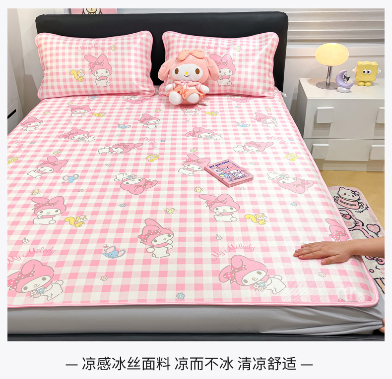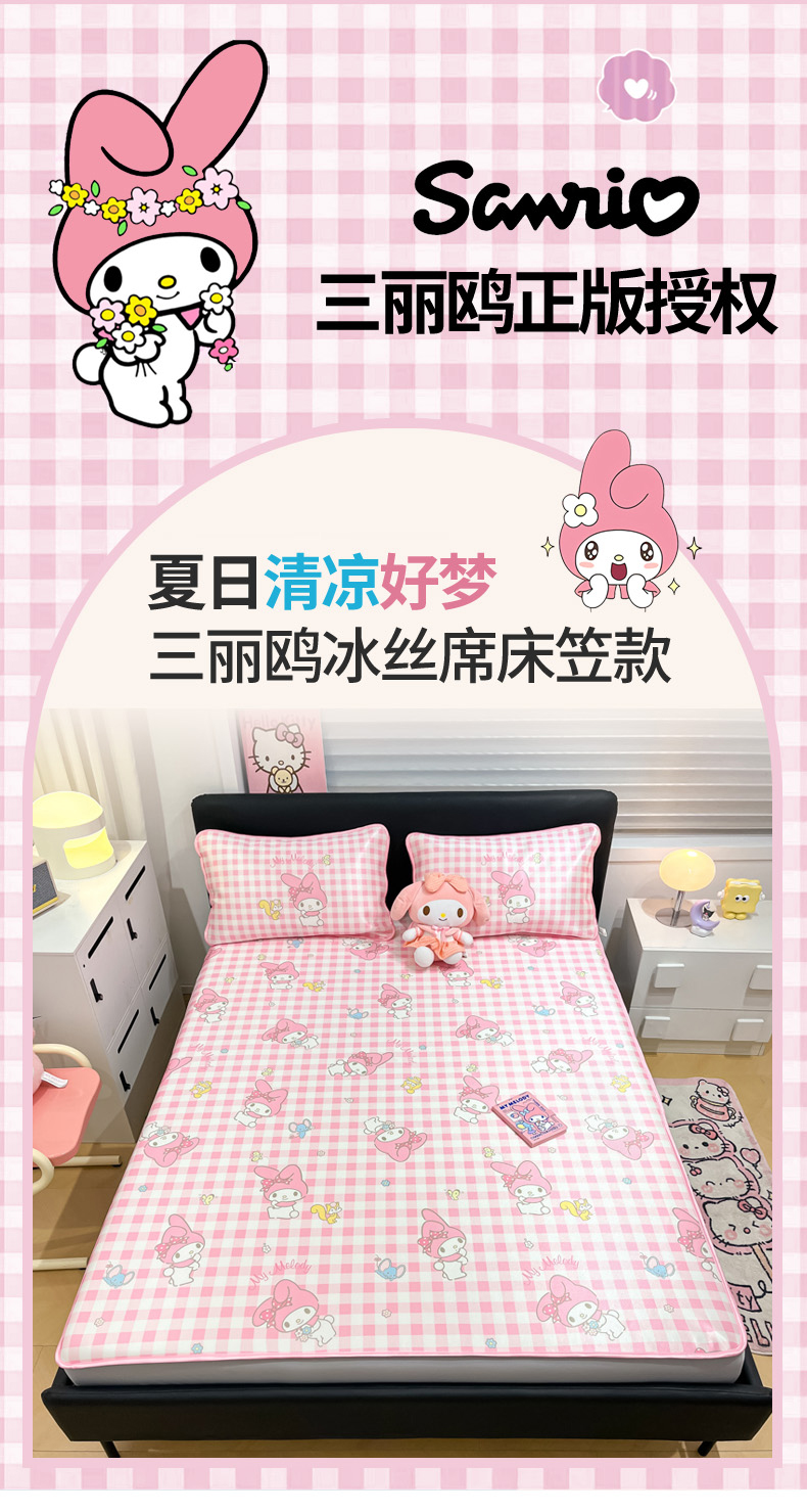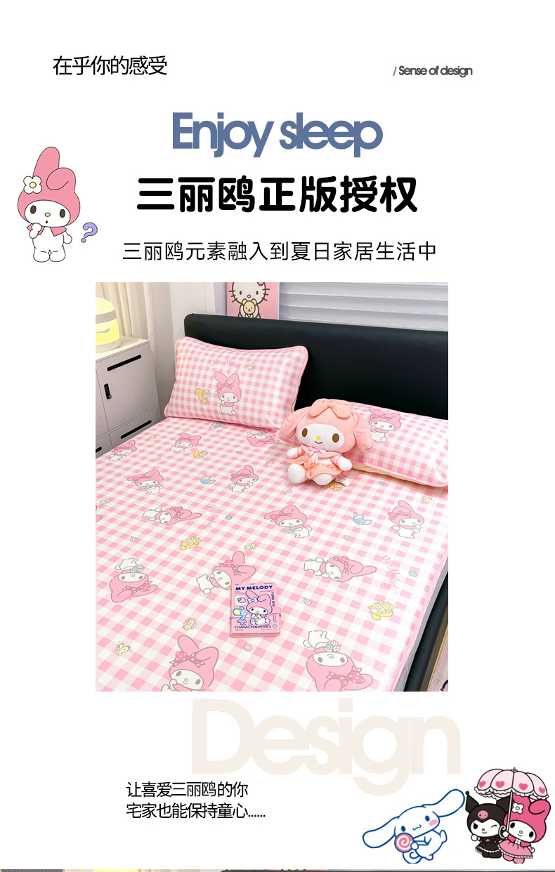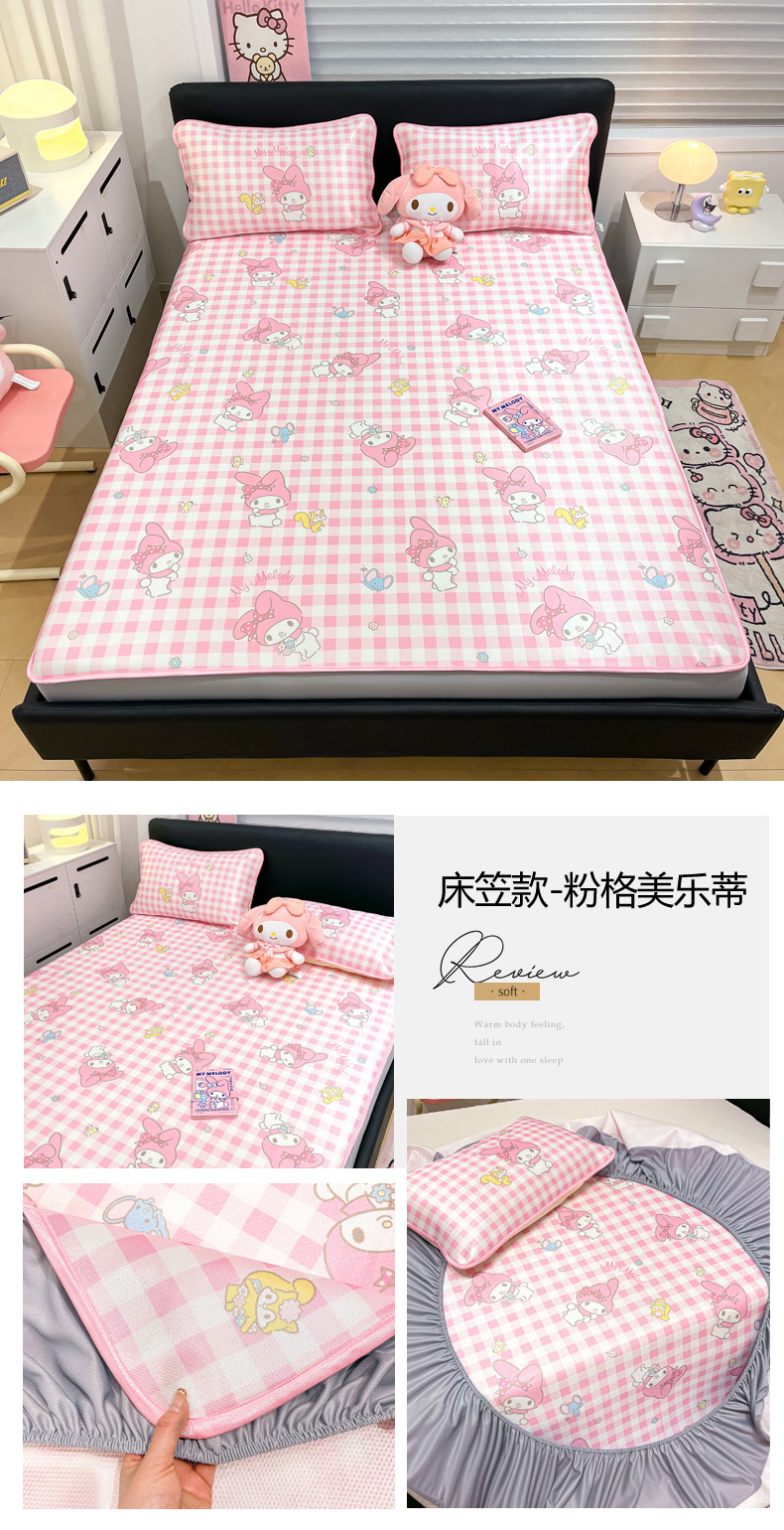 商品名称:暮思家居 2025新款三丽鸥正版授权数码印花A类可机洗1200D冰丝凉席三件套床笠款系列 床笠款-粉格美乐蒂