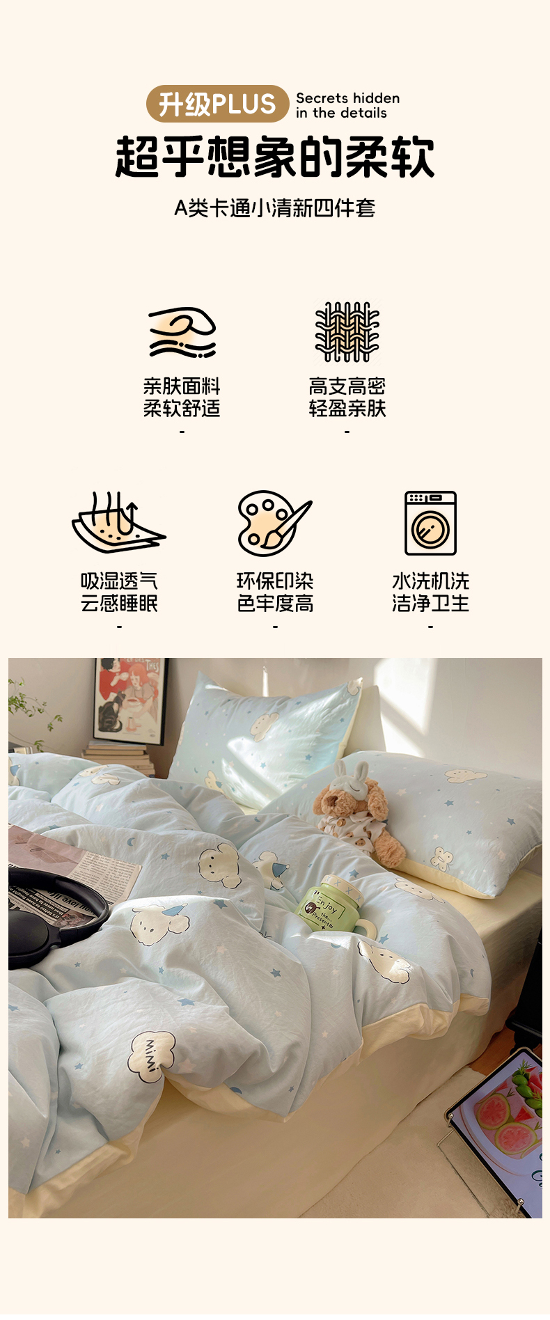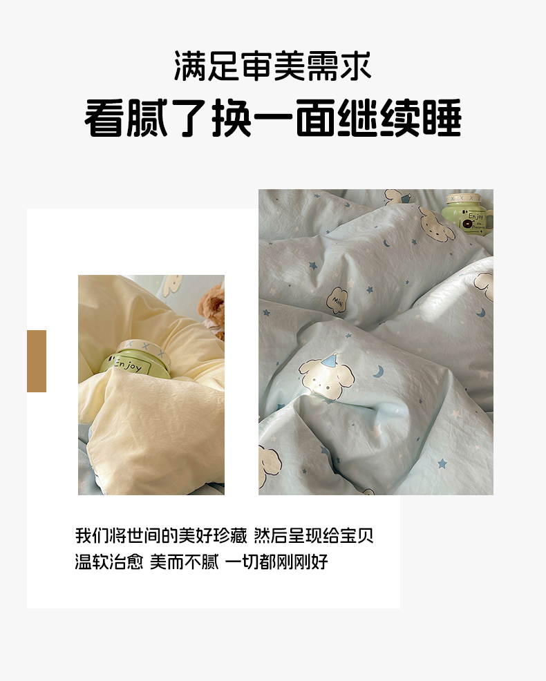 (总)初夏家纺 2026 古法仿棉水洗棉A类四件套被罩床单三件套床上用品卡通可爱【提供买家秀】,蓝调序曲,豹纹音乐,波点汪语,草莓啵啵,花屿庄园,灰度情书,家园,假日萌犬,猫咪甜点屋,毛绒熊仔,萌犬游记,暖意小熊,甜心紫熊,兔耳朵,樱桃物语,雨沫