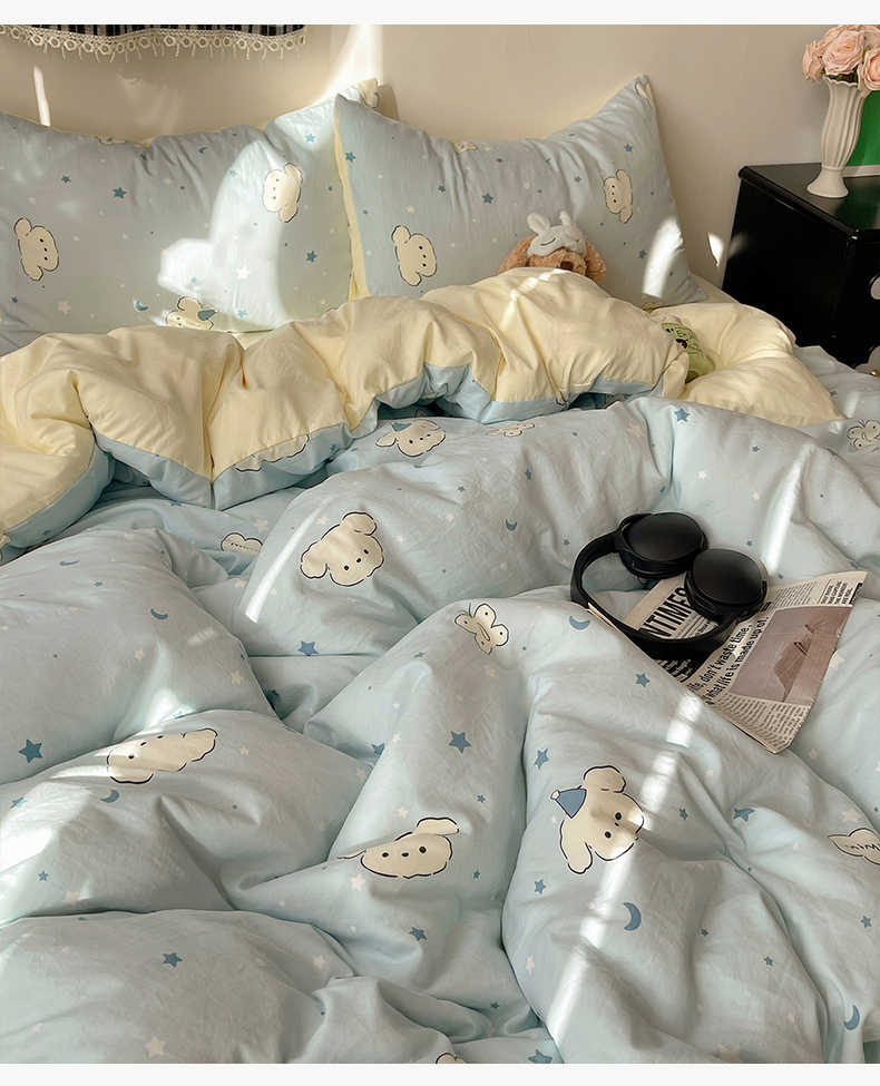 (总)初夏家纺 2026 水洗棉A类105g床上四件套床单被套三件套床笠简约小清新---【提供买家秀】,浅蓝格,波点狗,晕染爱心,彩色星星,风与爱,复古小熊,开心时光,奶味圆饼,浅粉格,小花园
