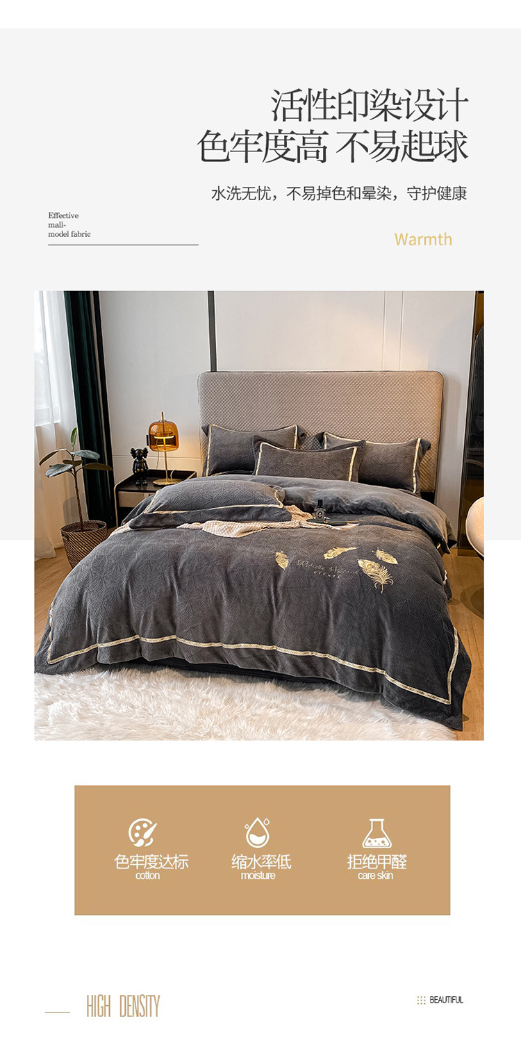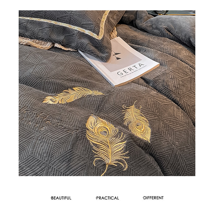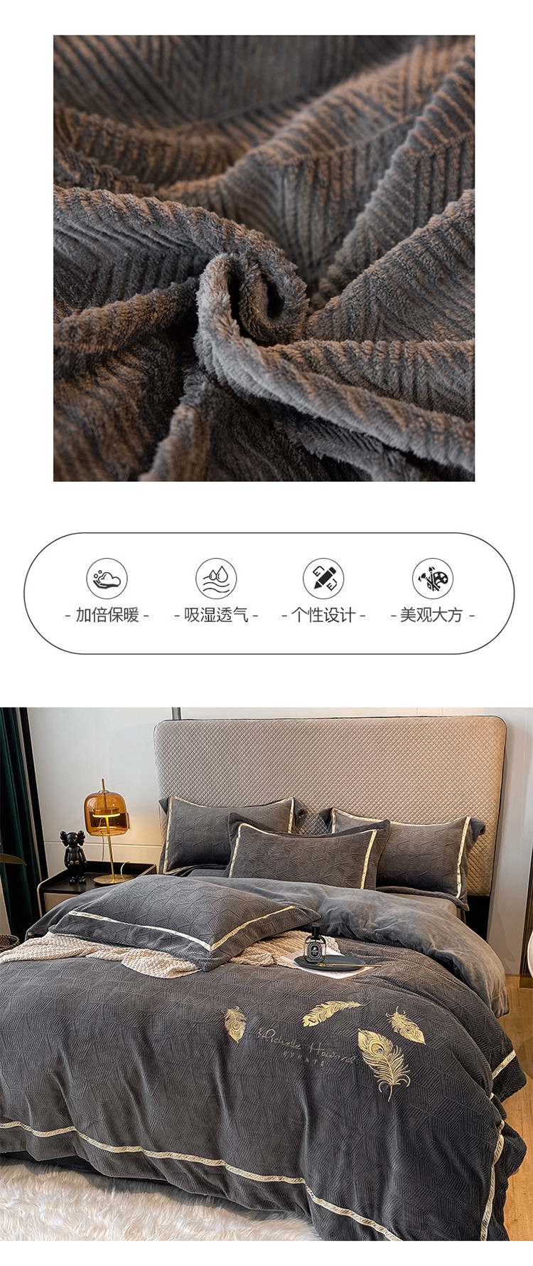 商品名称:吾秀家居 2022新款羽毛刺绣雕花绒四件套 羽毛深灰