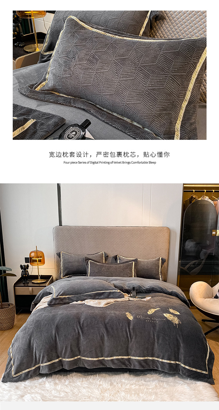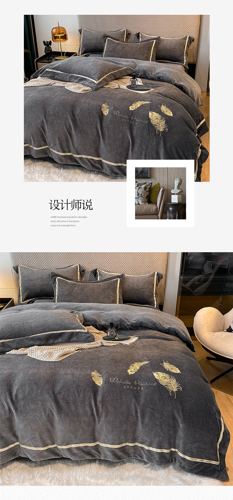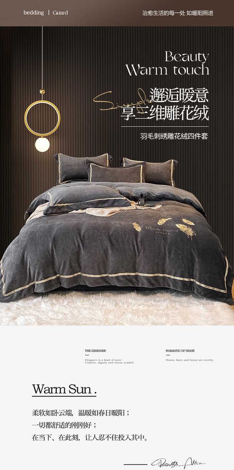 吾秀家居 2022新款羽毛刺绣雕花绒四件套 羽毛深灰