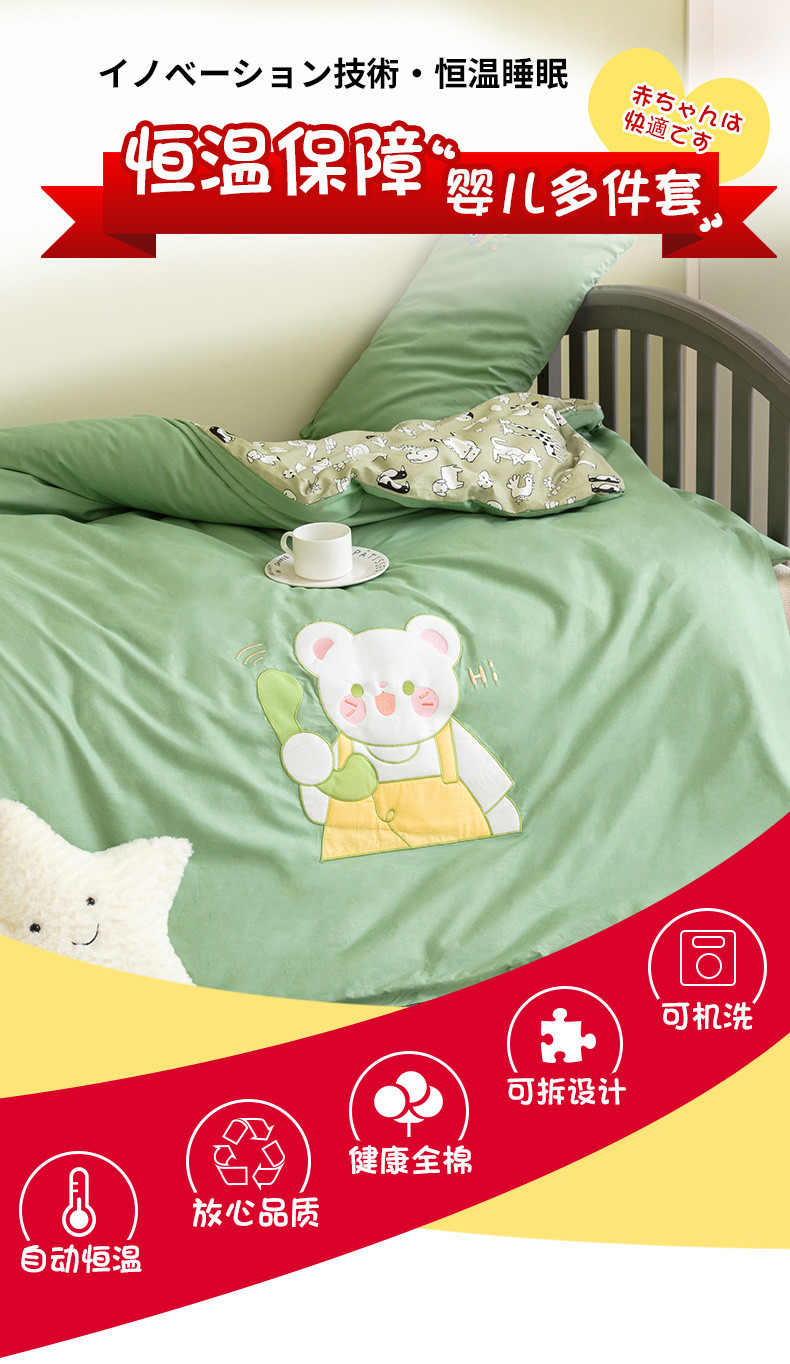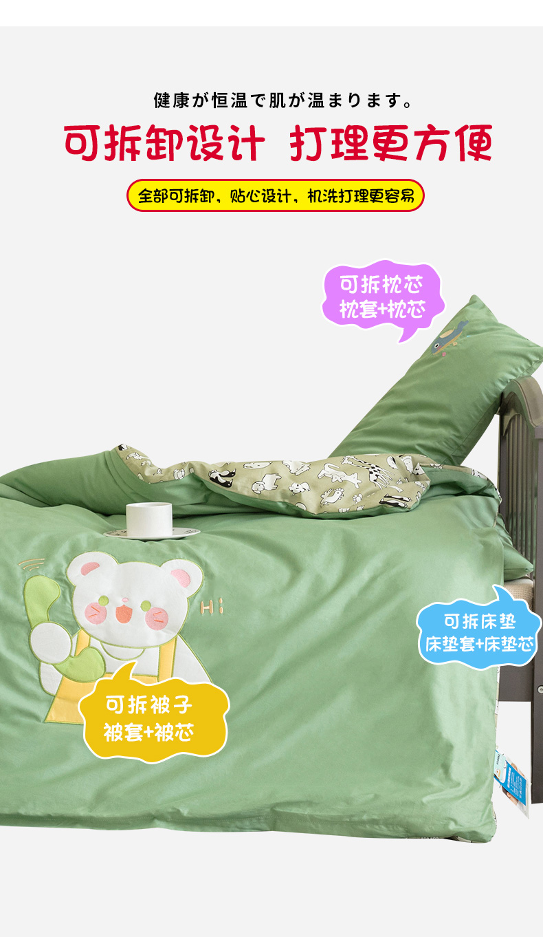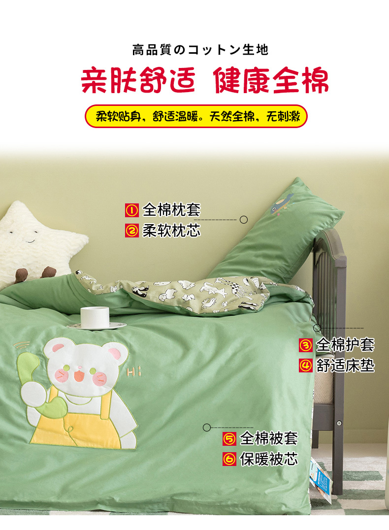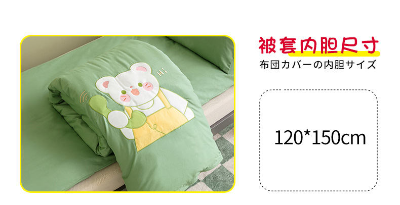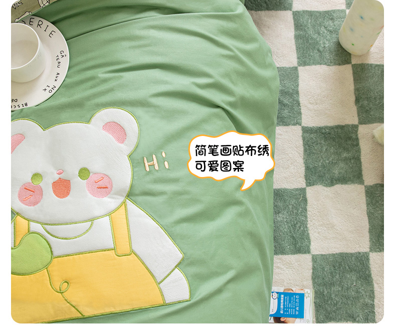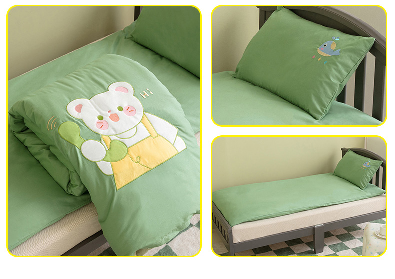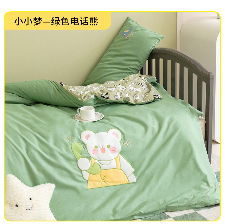 当前位置: 91家纺网 > 商品网购 > 床品套件 > 三件套 > 喜多兔 2023新款40支13372纯棉小小梦绣花幼儿园被子三件套 绿色电话熊