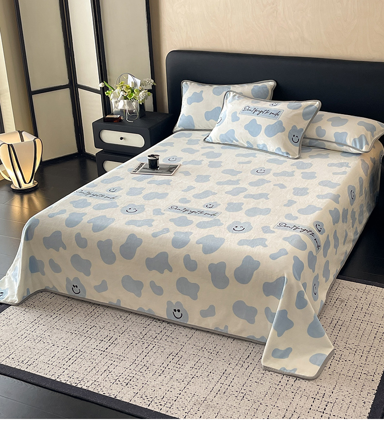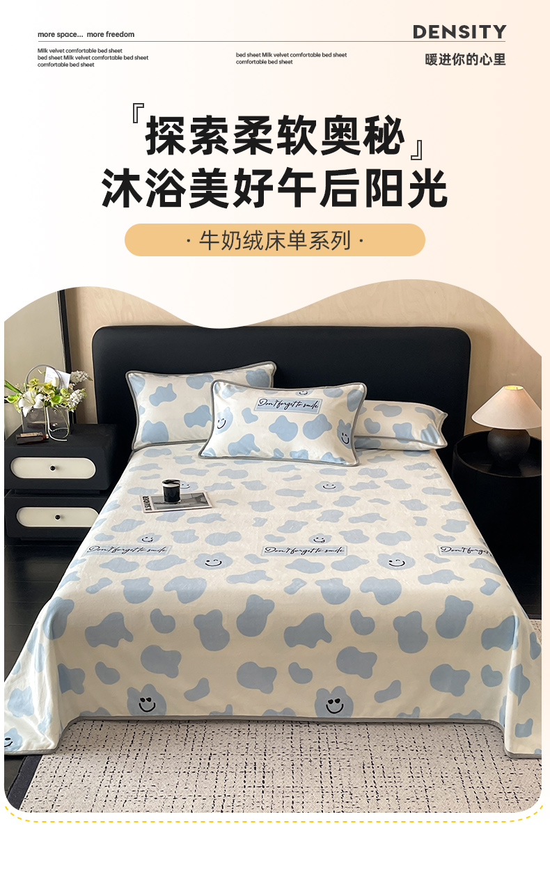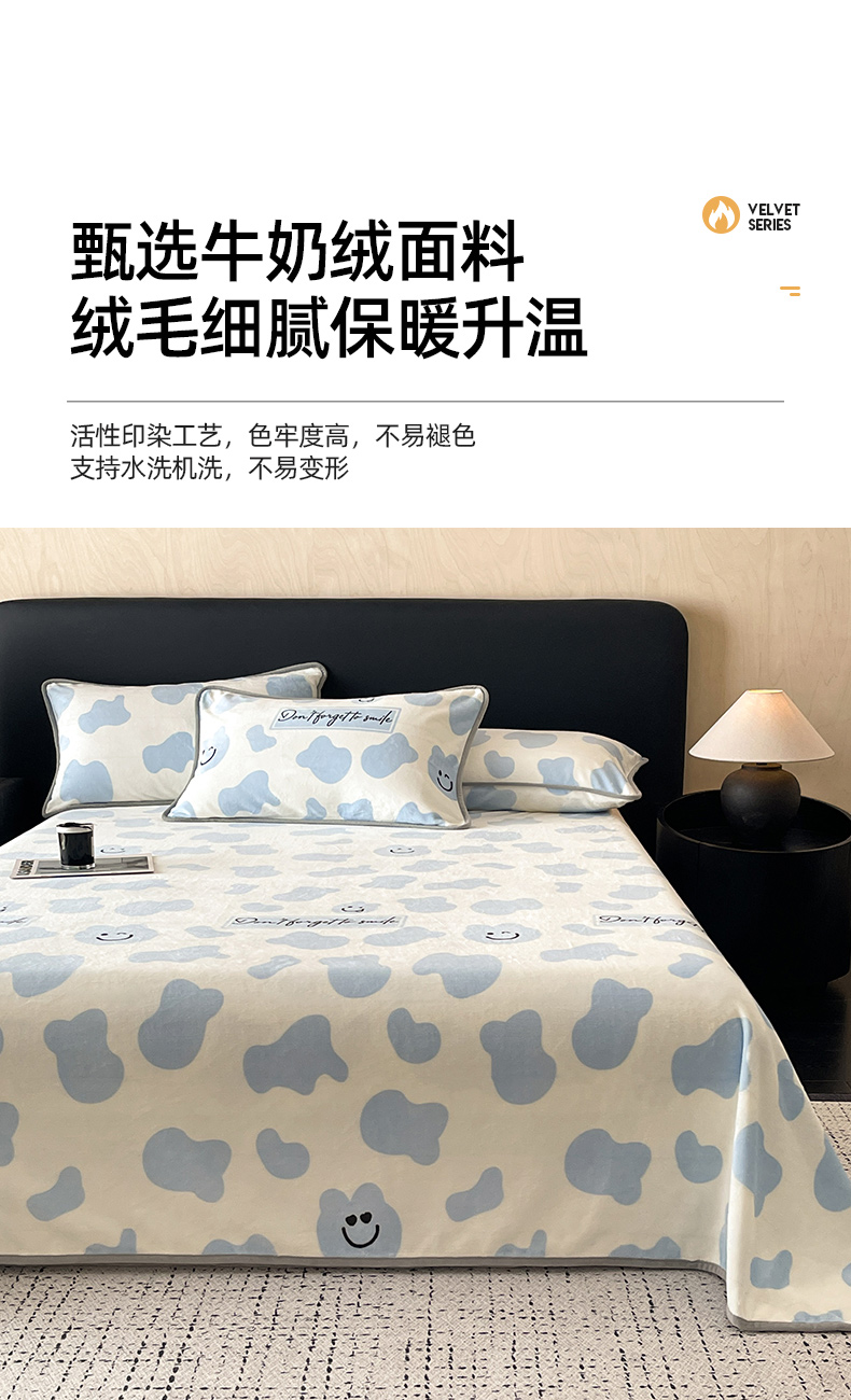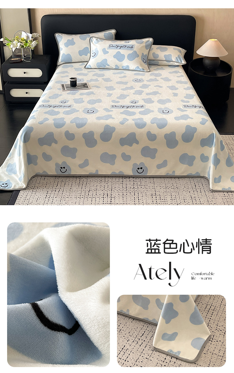 商品名称:全季家居 2024新款A类纯色印花高克重加厚保暖包边牛奶绒床单单件 蓝色心情