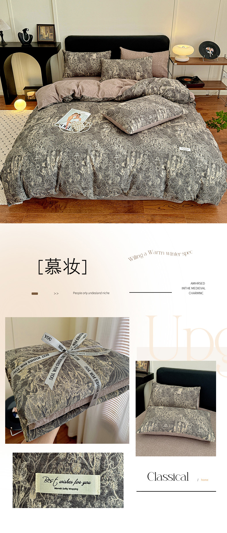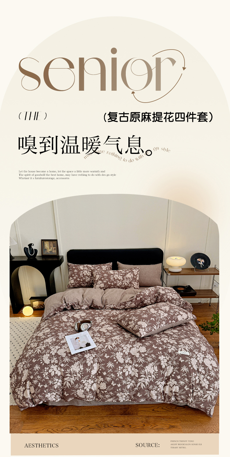 商品名称:金梦拉家纺 2025秋冬爆款新品高克重加厚原麻亚麻皱皱纱印花四件套 复古花