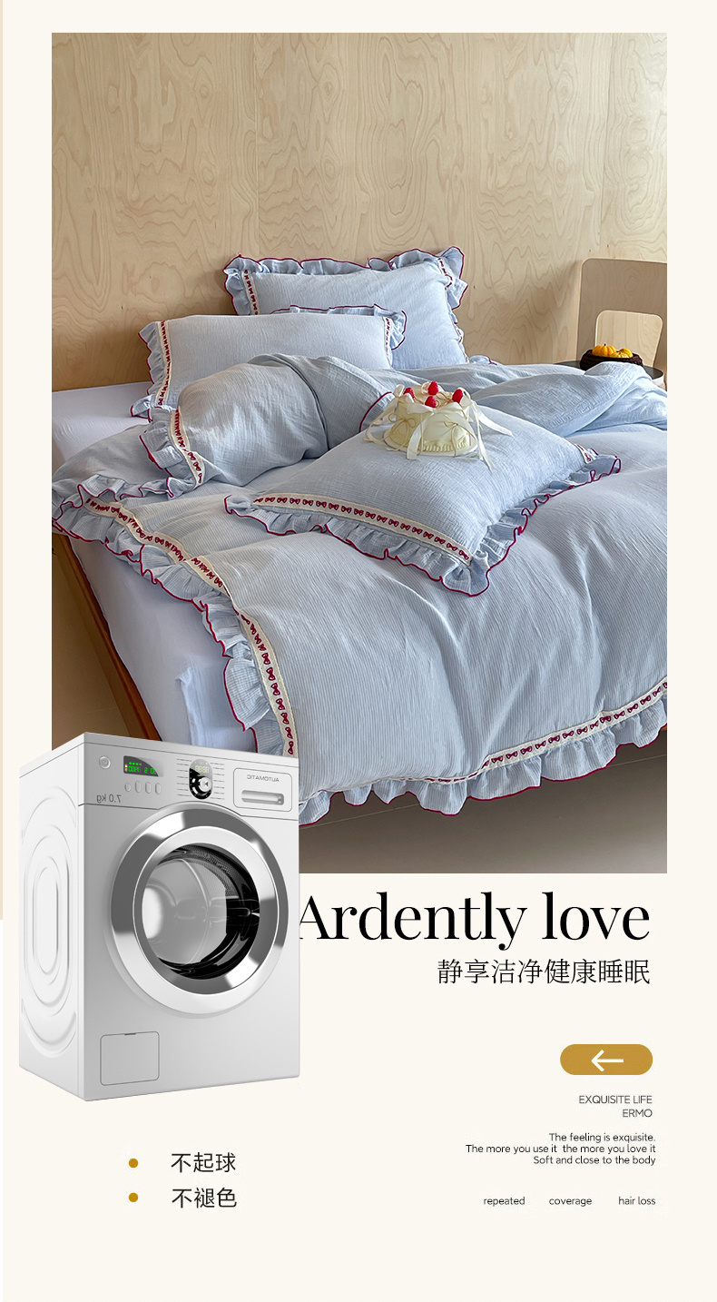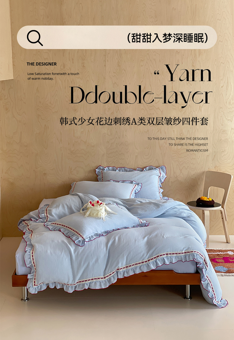 (总)玛奇朵 2026新款韩式少女花边刺绣A类双层皱纱四件套,蓝风信屿,樱花手札