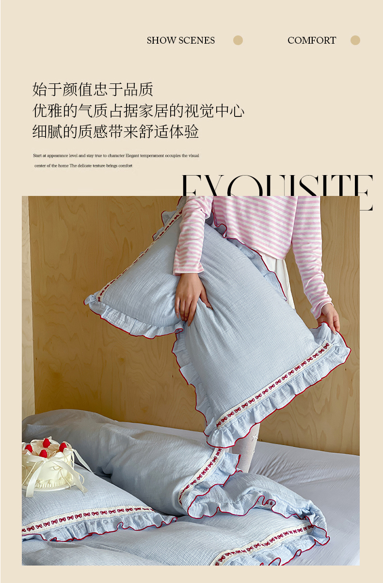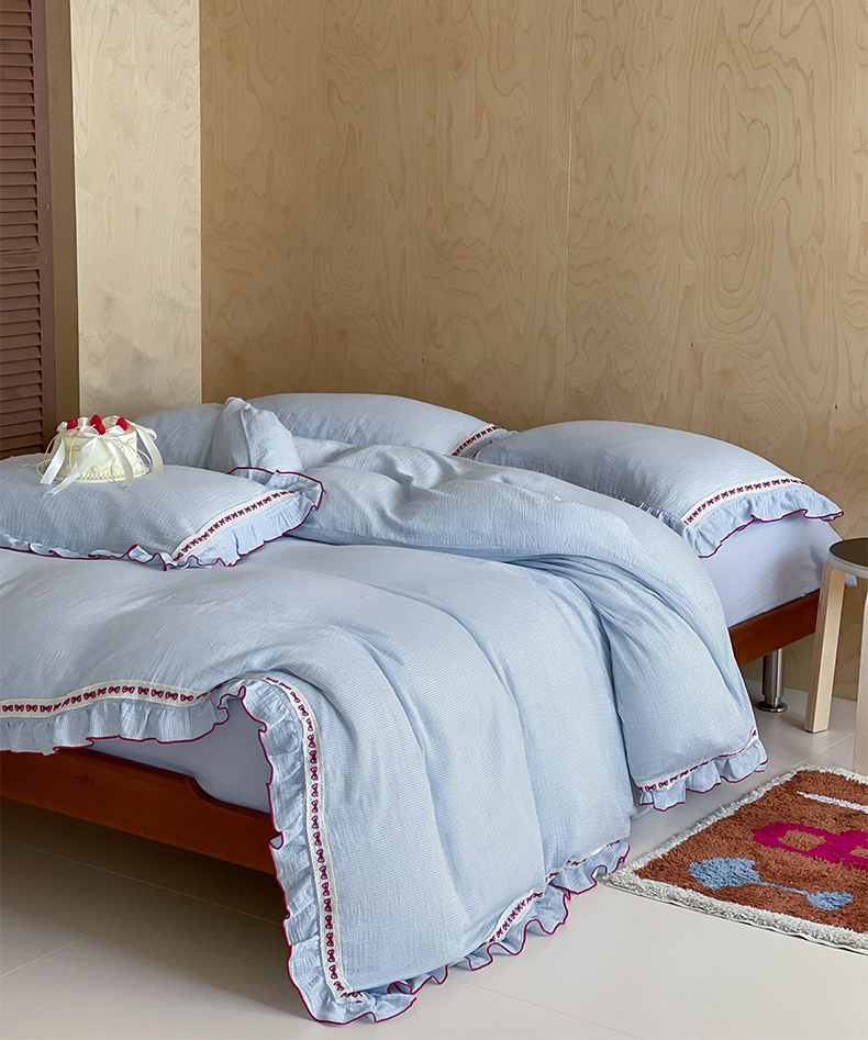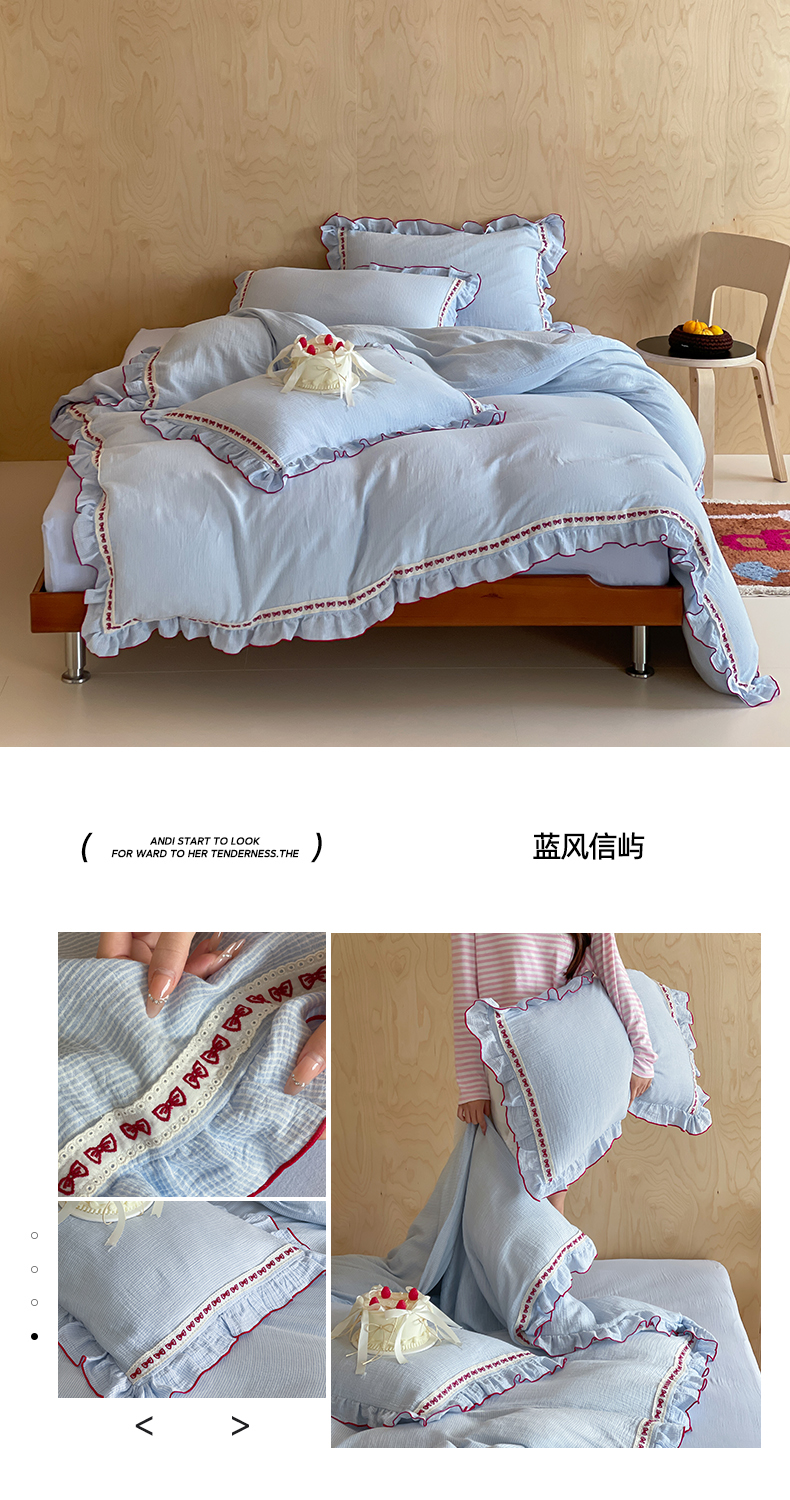 商品名称:玛奇朵 2026新款韩式少女花边刺绣A类双层皱纱四件套 蓝风信屿