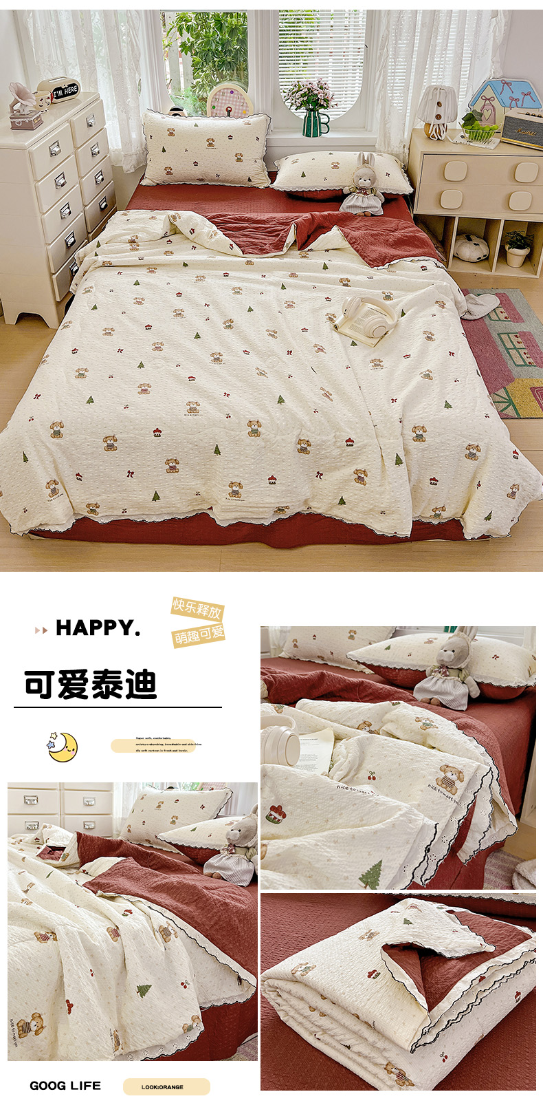 (总)2025新款A类云感提花纱布棉皱皱纱四件套(贴布风),风信子,可可栗子,快乐兔,玫瑰小能,美娜滋,蘑菇森林,淘气奶兔,紫色梦境,汪汪乐园