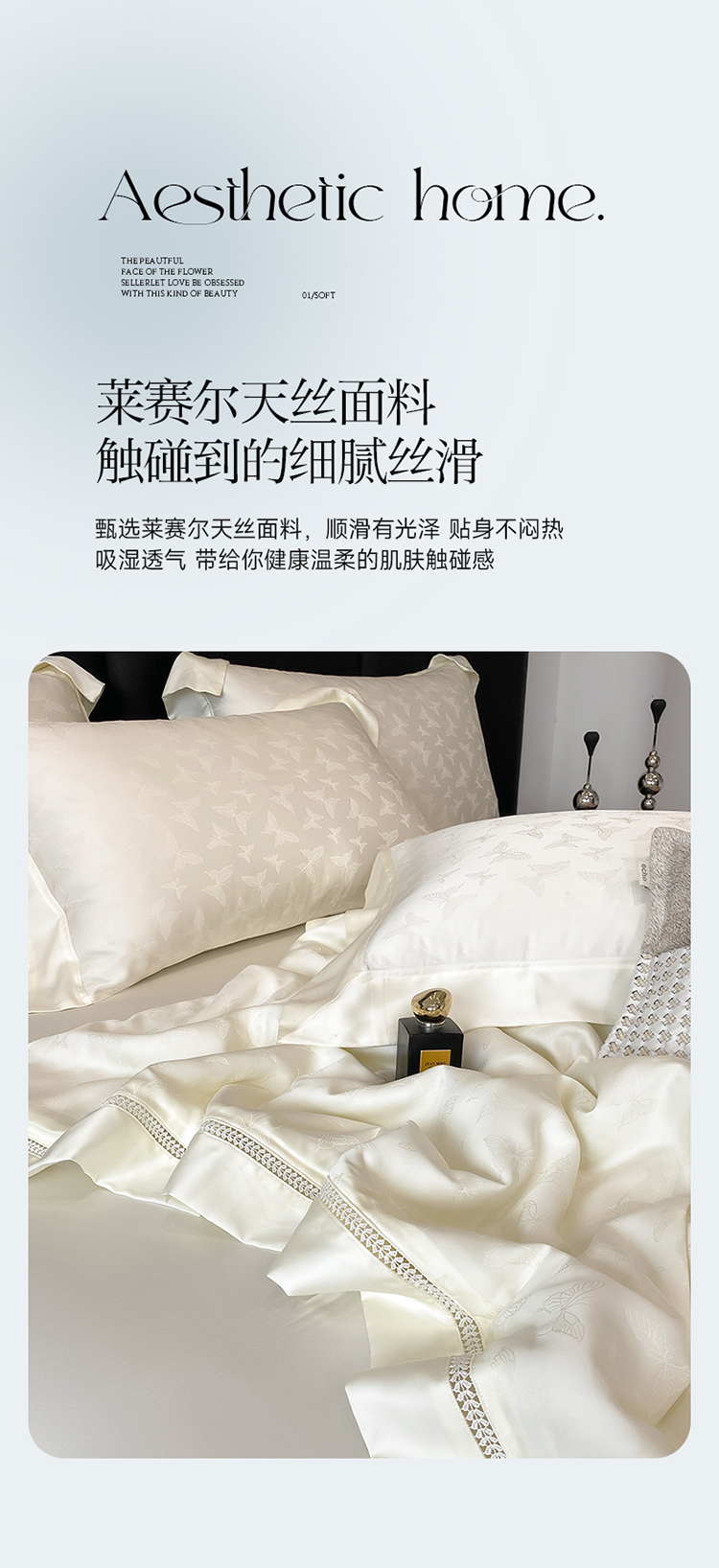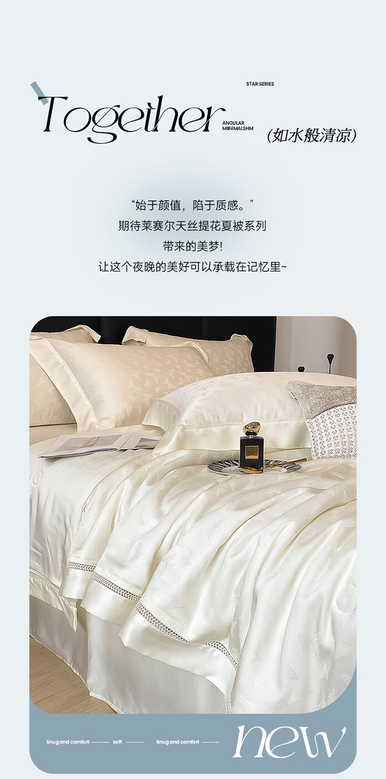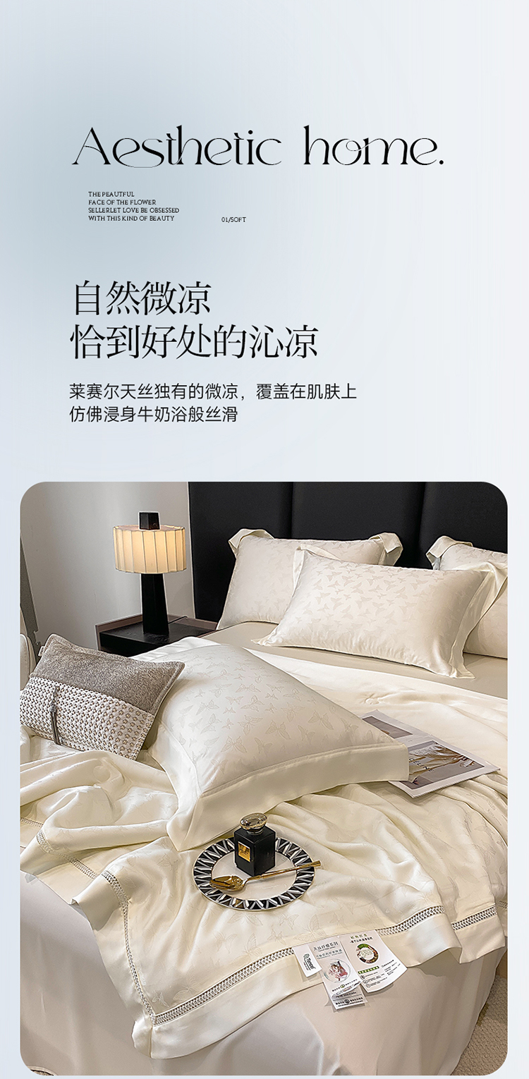商品名称:娇逸家居 2025新款镂空花边60支天丝提花夏被(专版花型) 蝶舞-山矾白