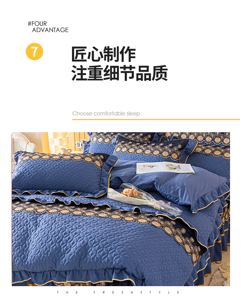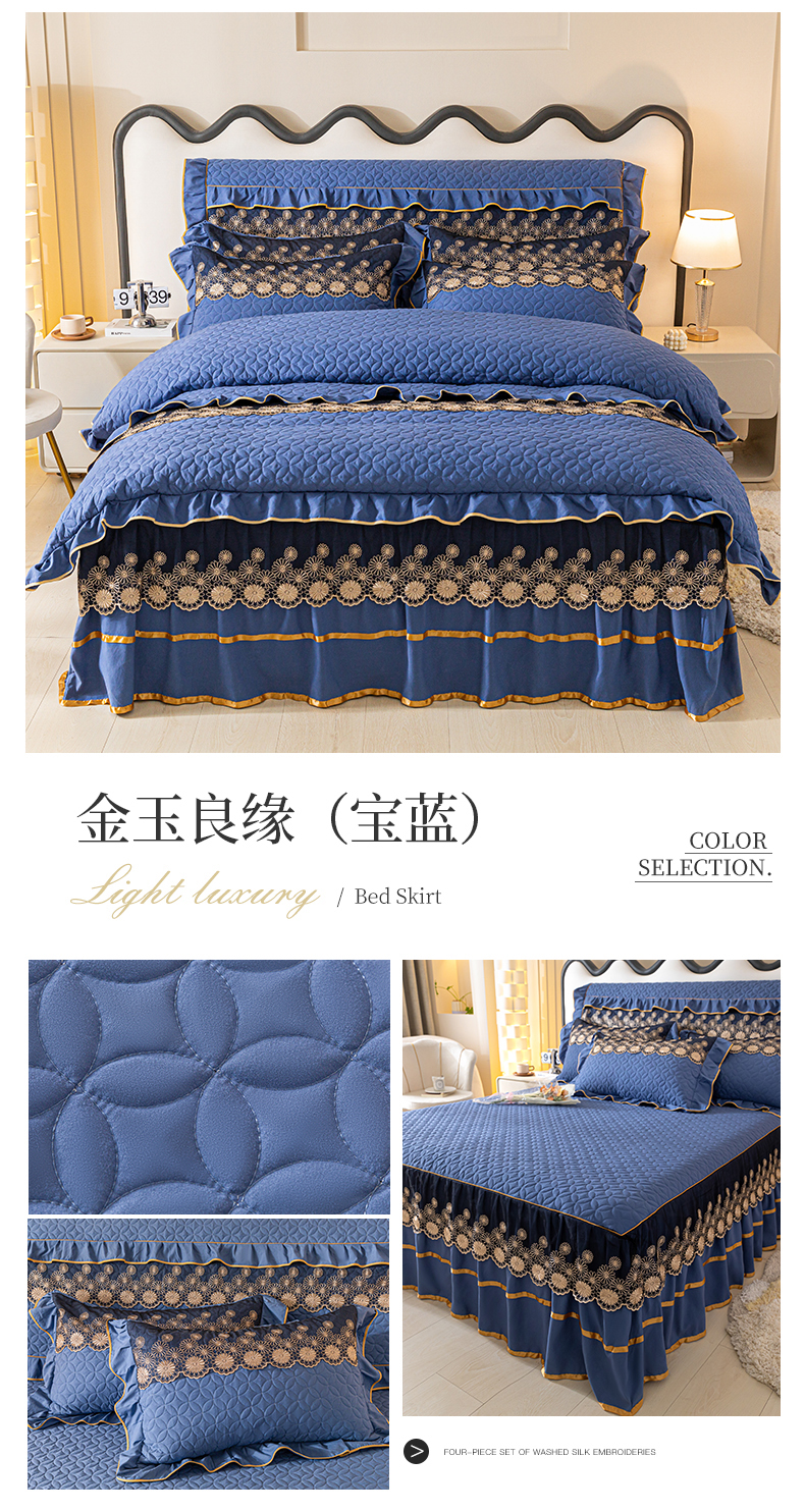 当前位置: 91家纺网 > 商品网购 > 床品套件 > 四件套 > 全棉普通四件套 > 靓生活 2023新款夹棉绗缝床裙四件套-金玉良缘 宝蓝