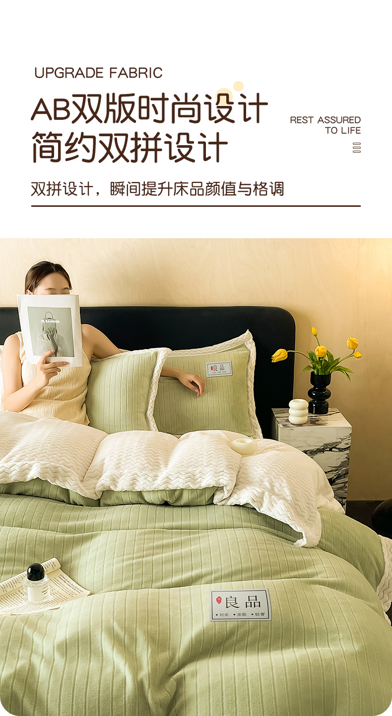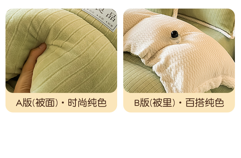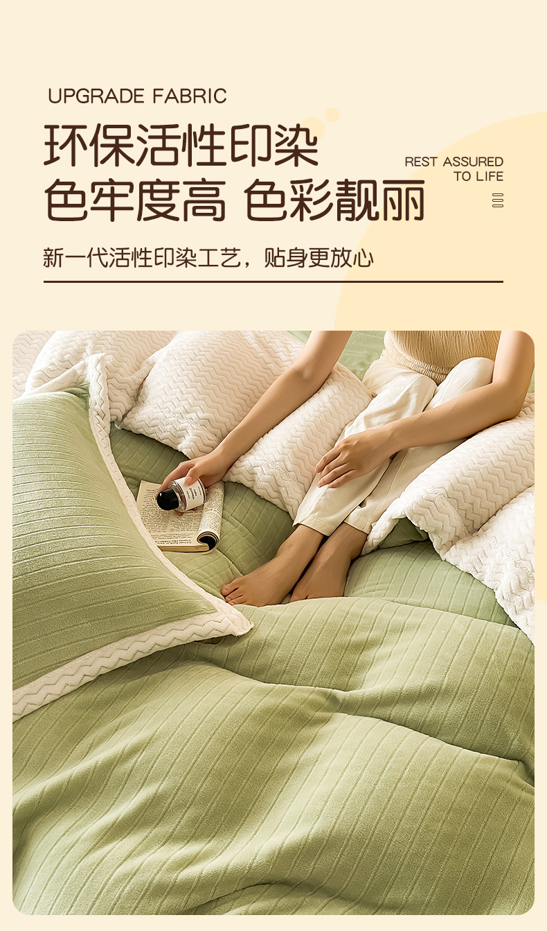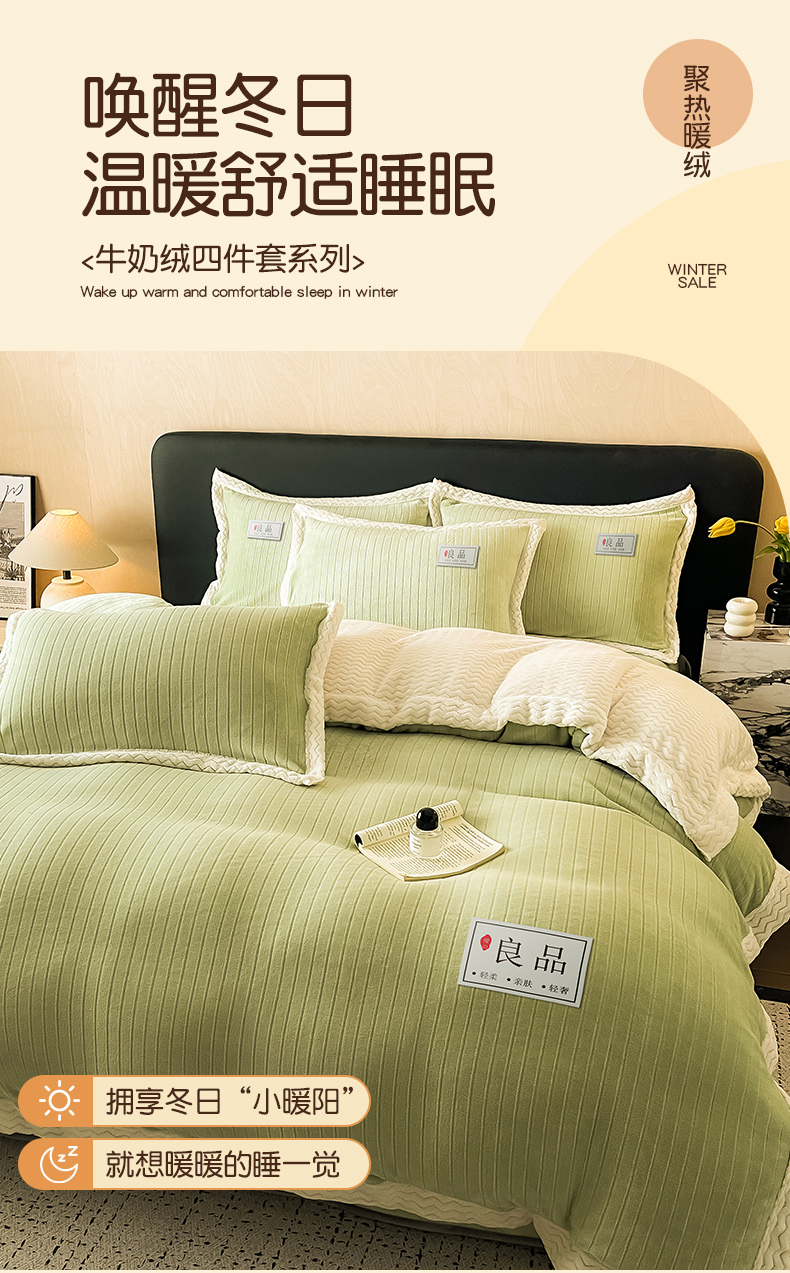 当前位置: 91家纺网 > 商品网购 > 床品套件 > 四件套 > 牛奶绒四件套 > 全季家居 2024新款A类纯色印花波浪大包边牛奶绒贝贝绒加厚保暖四件套 果绿